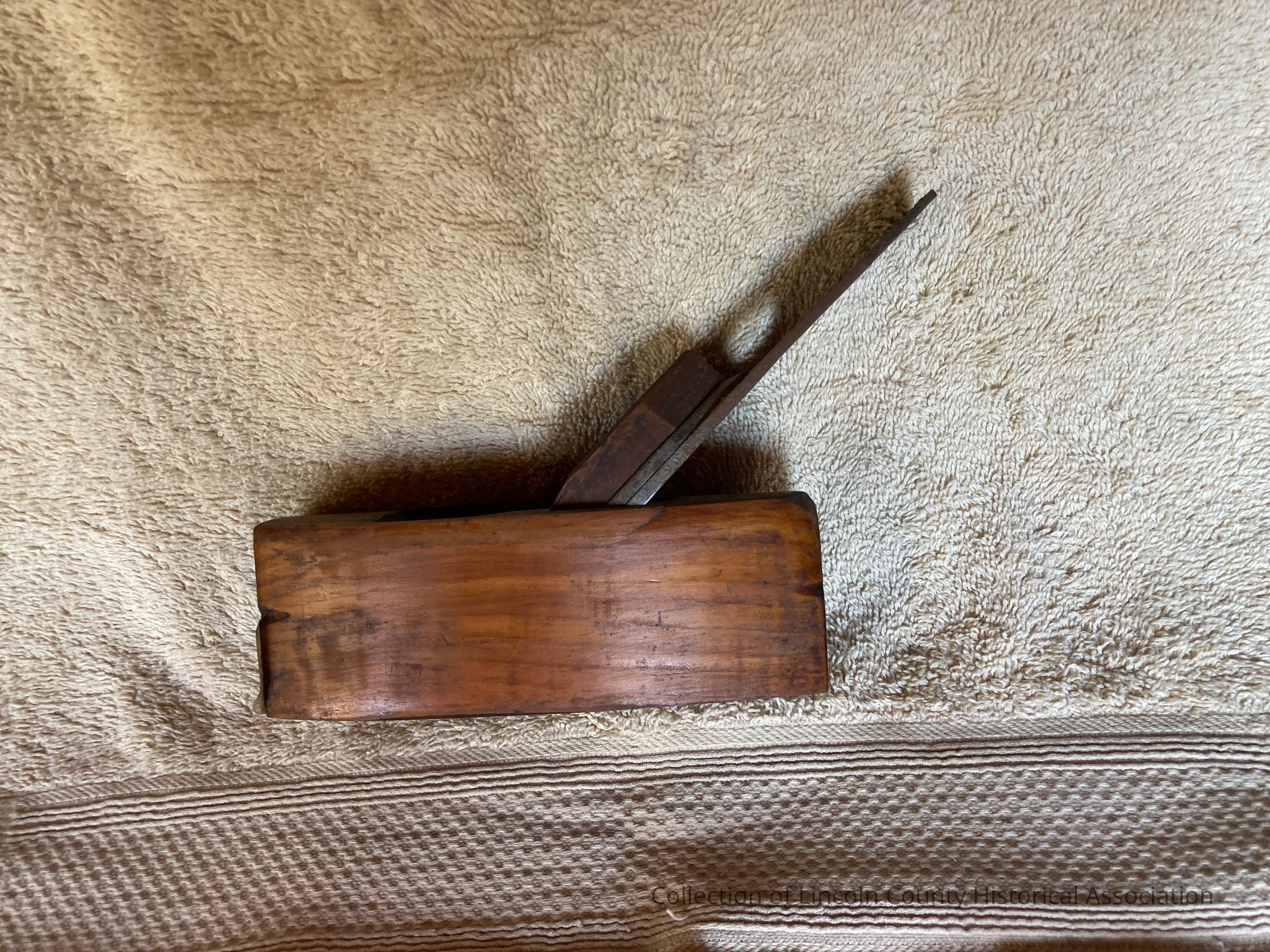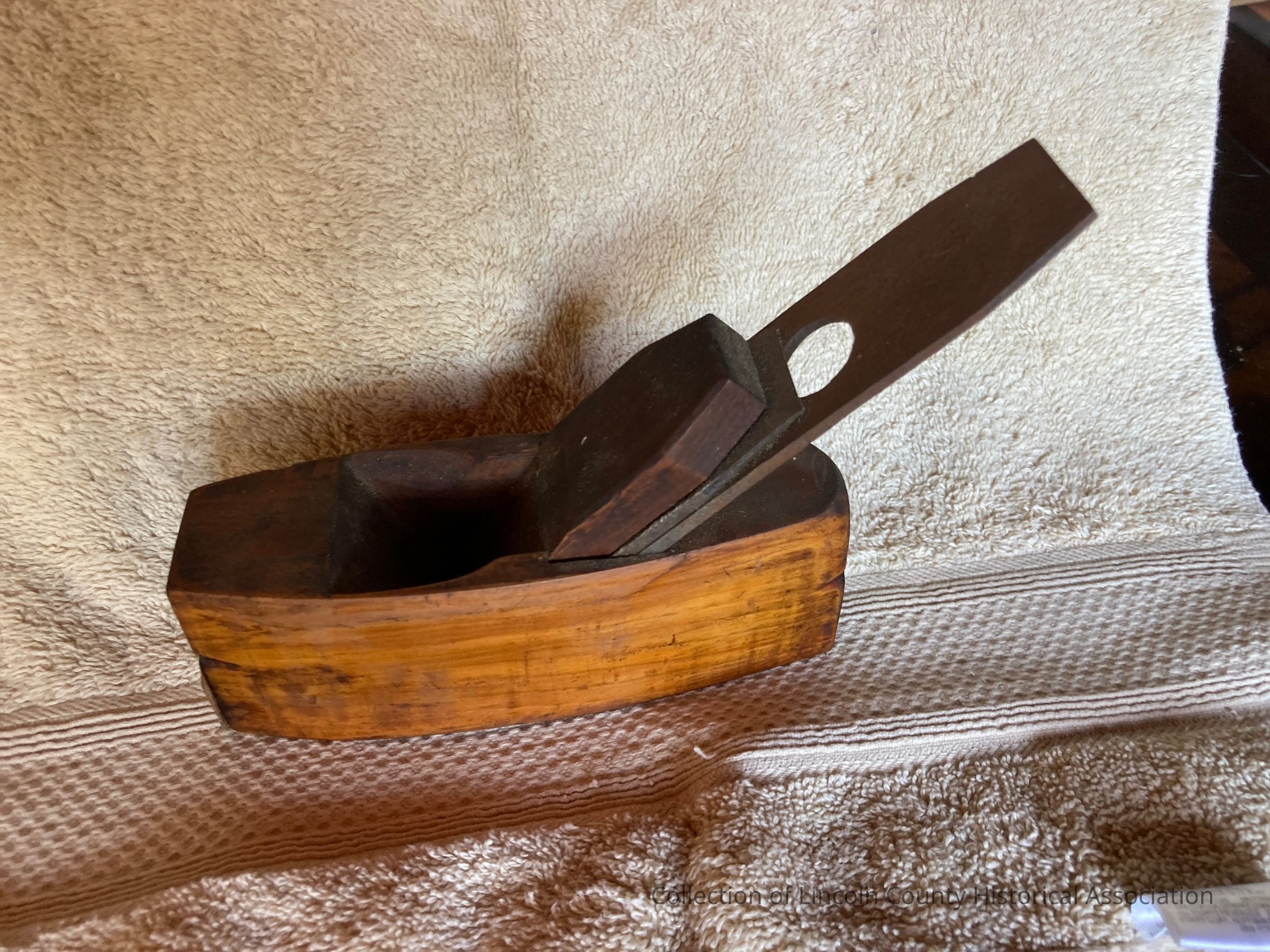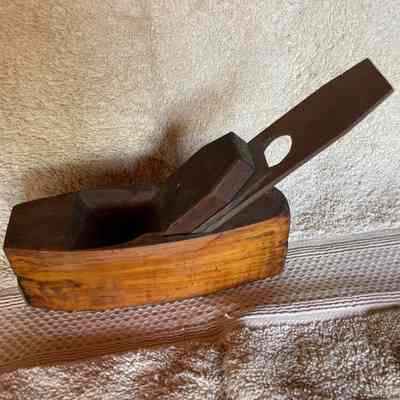 Lignum vitae wood and metal block plane. Also referred to as a "smoothing plane." Wooden section is curved at both ends.