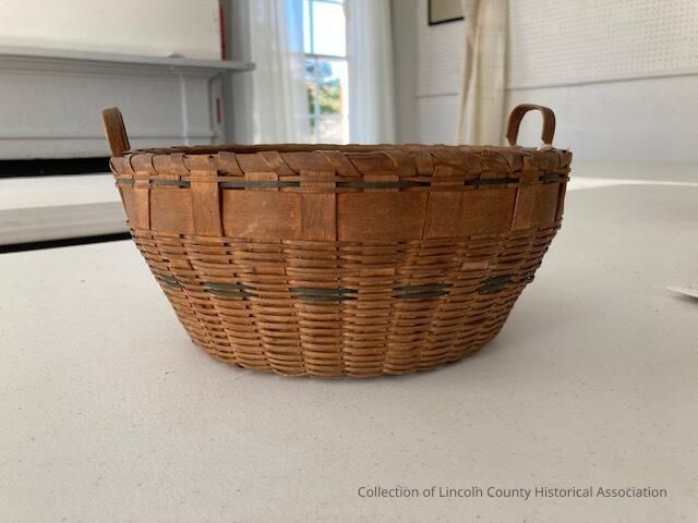 Native American Wabanaki oval splint open work basket with two wooden handles. Decorated with two bands of black splint and a third ban under the rim.Made/Created