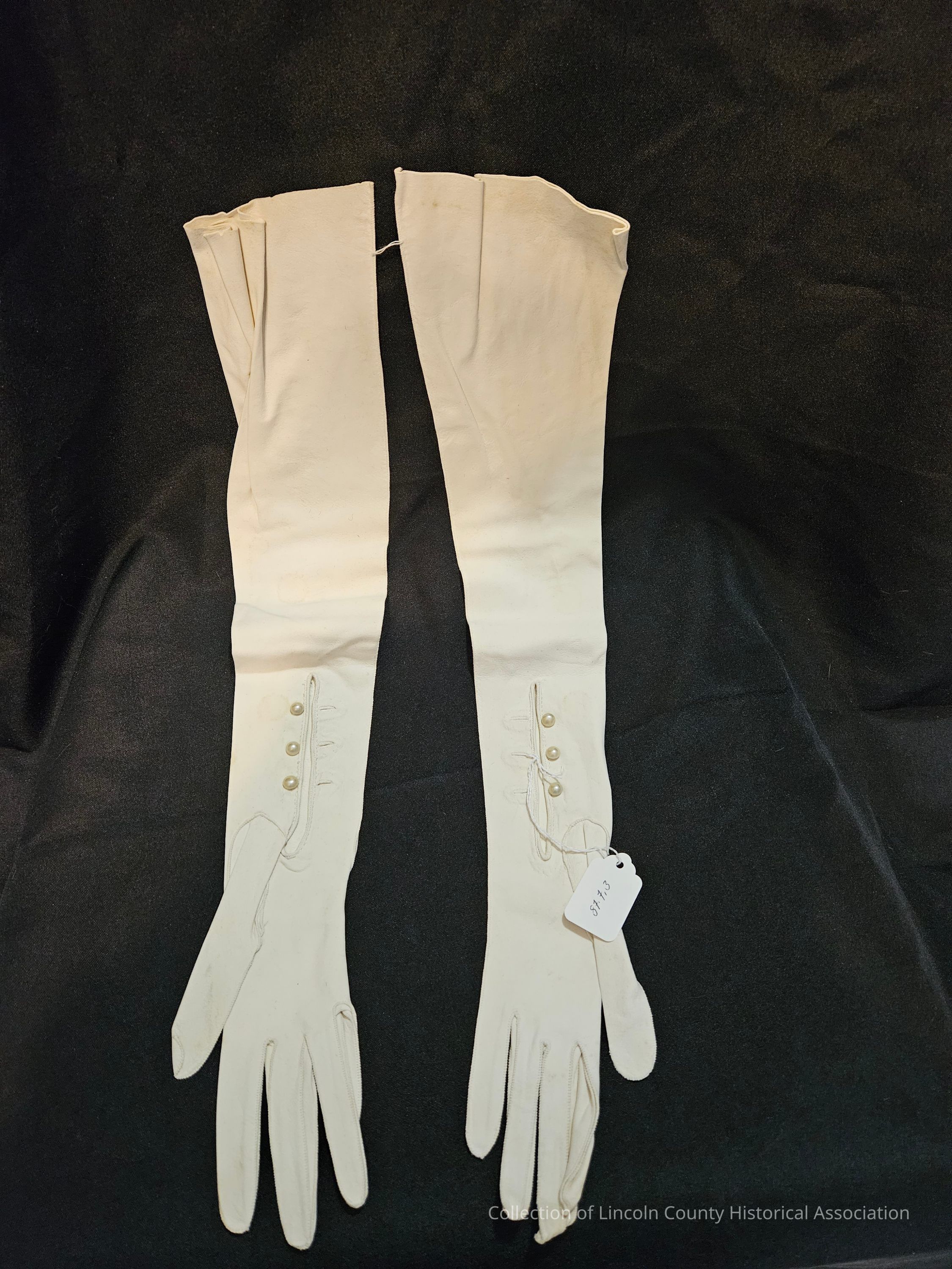 Pair of cream colored suede women's opera gloves. Three pearl buttons on back near wrist. Made in France and sold at Saks Fifth Avenue.
