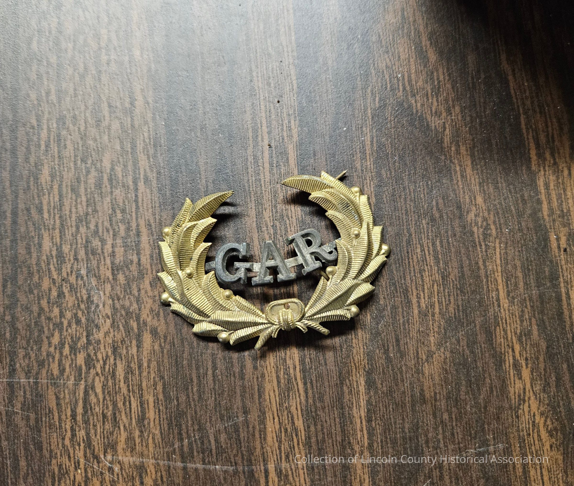 GAR hat badge. Gilded wreath around the letters "GAR." Made of brass and steel. Badge would have been pinned to center of a cap.