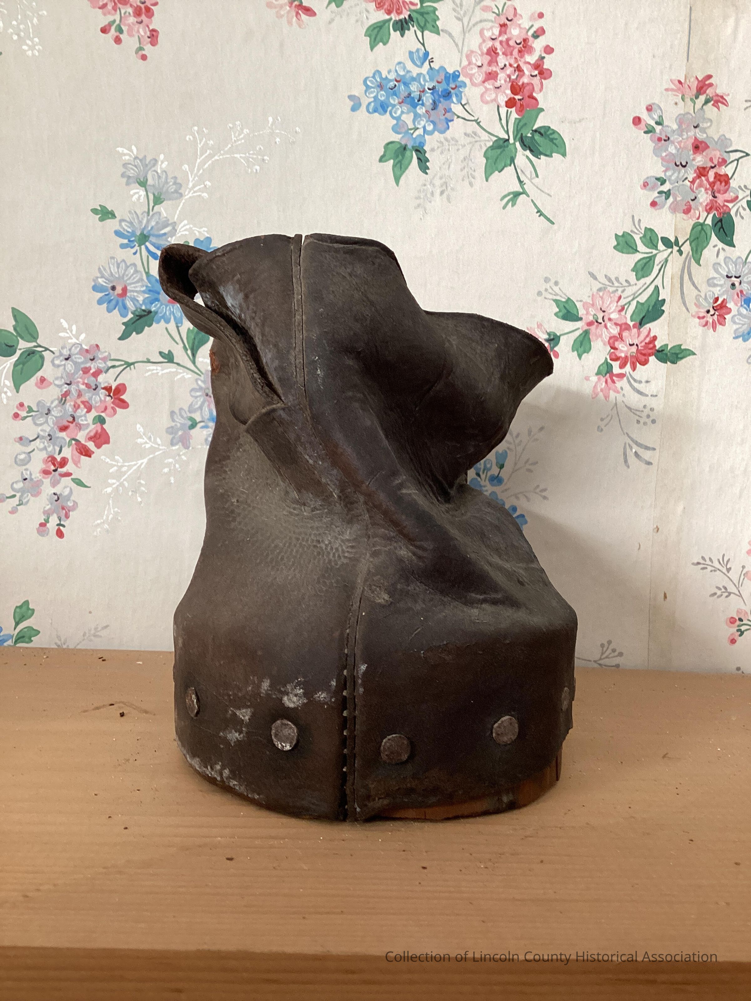 Stiff, black leather nail bag nailed to a wooden base. Has two draw strings and still contains nailsMade/Created