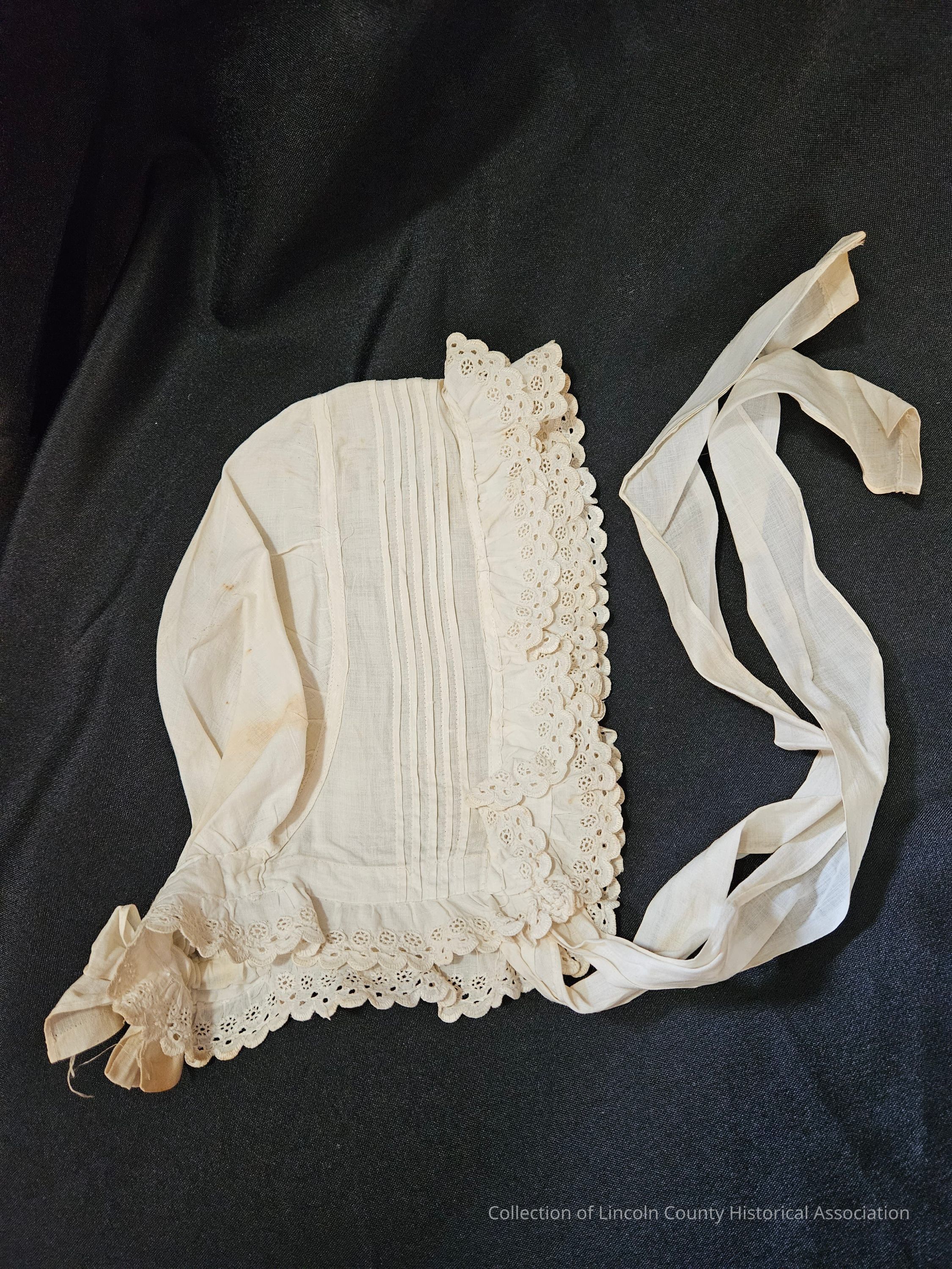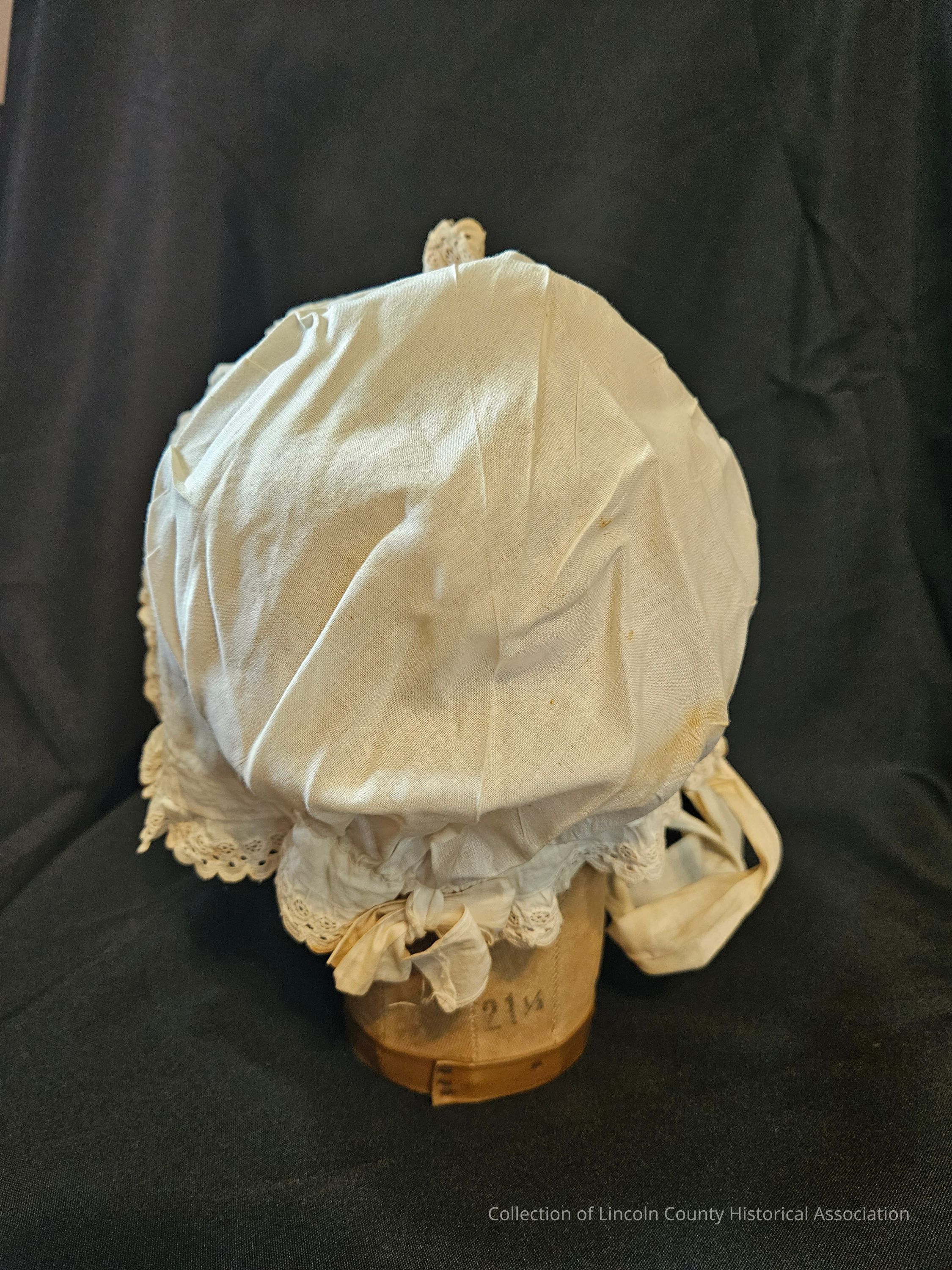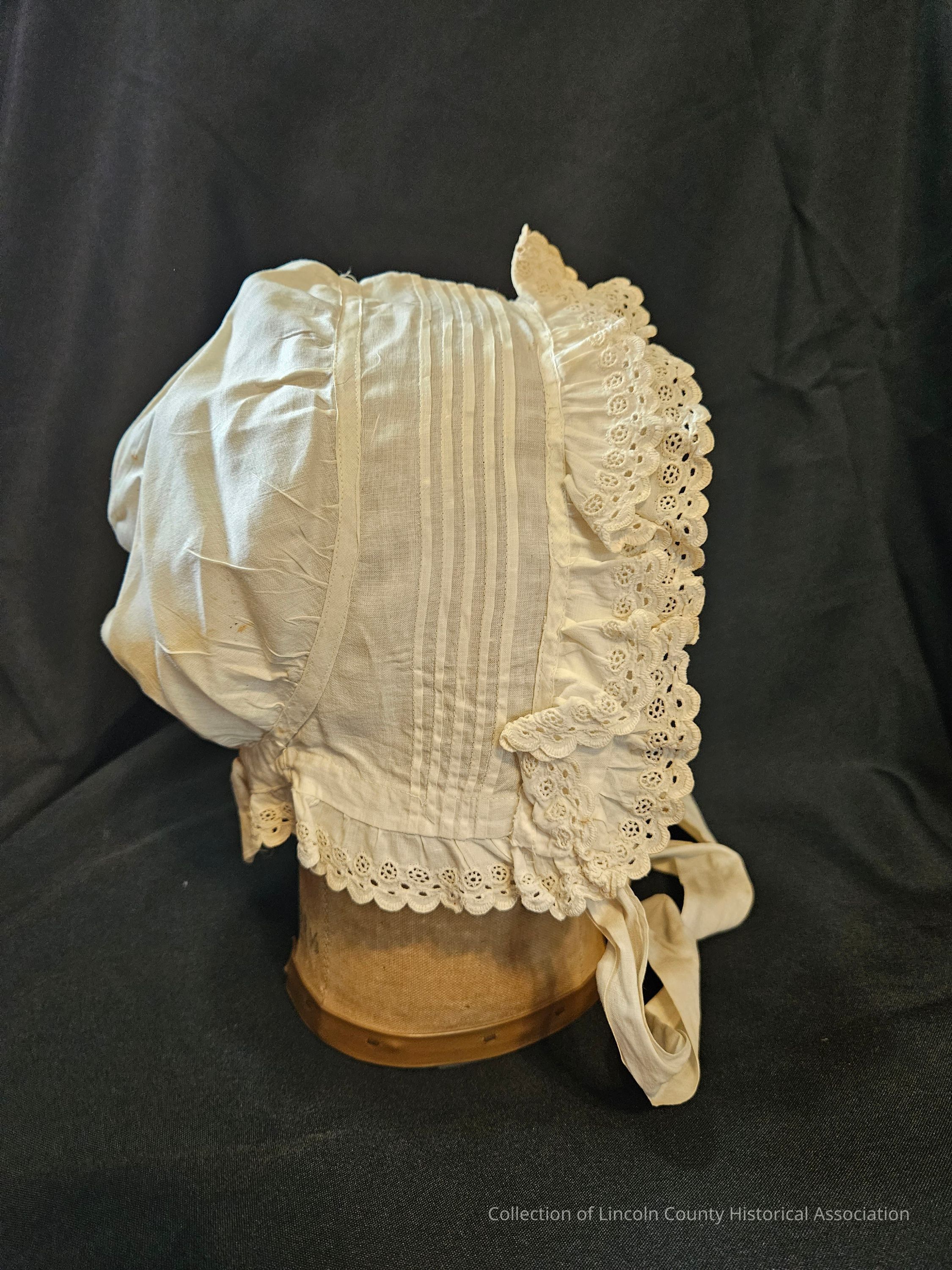 Woman's cotton day cap with pleated and ruffled scalloped edges. Five line design around middle of cap. Adjustable cotton tie at base of neck. Two cotton ties at the front.Clothing/Dress/Costume Details