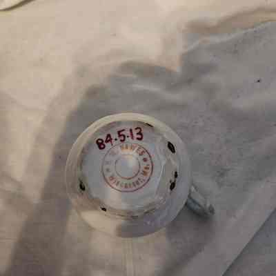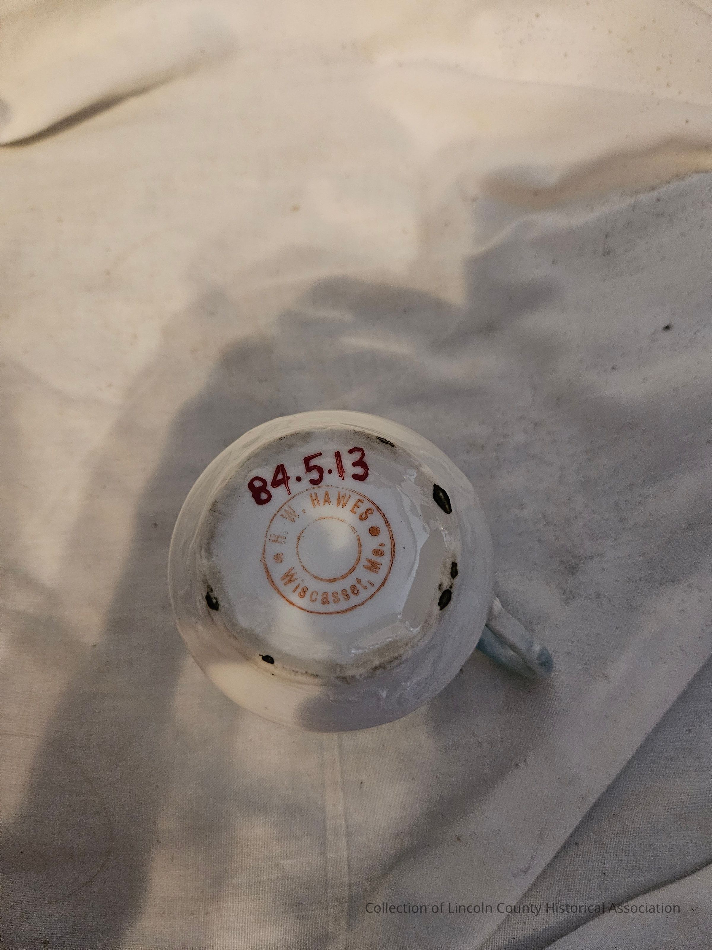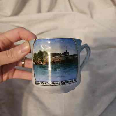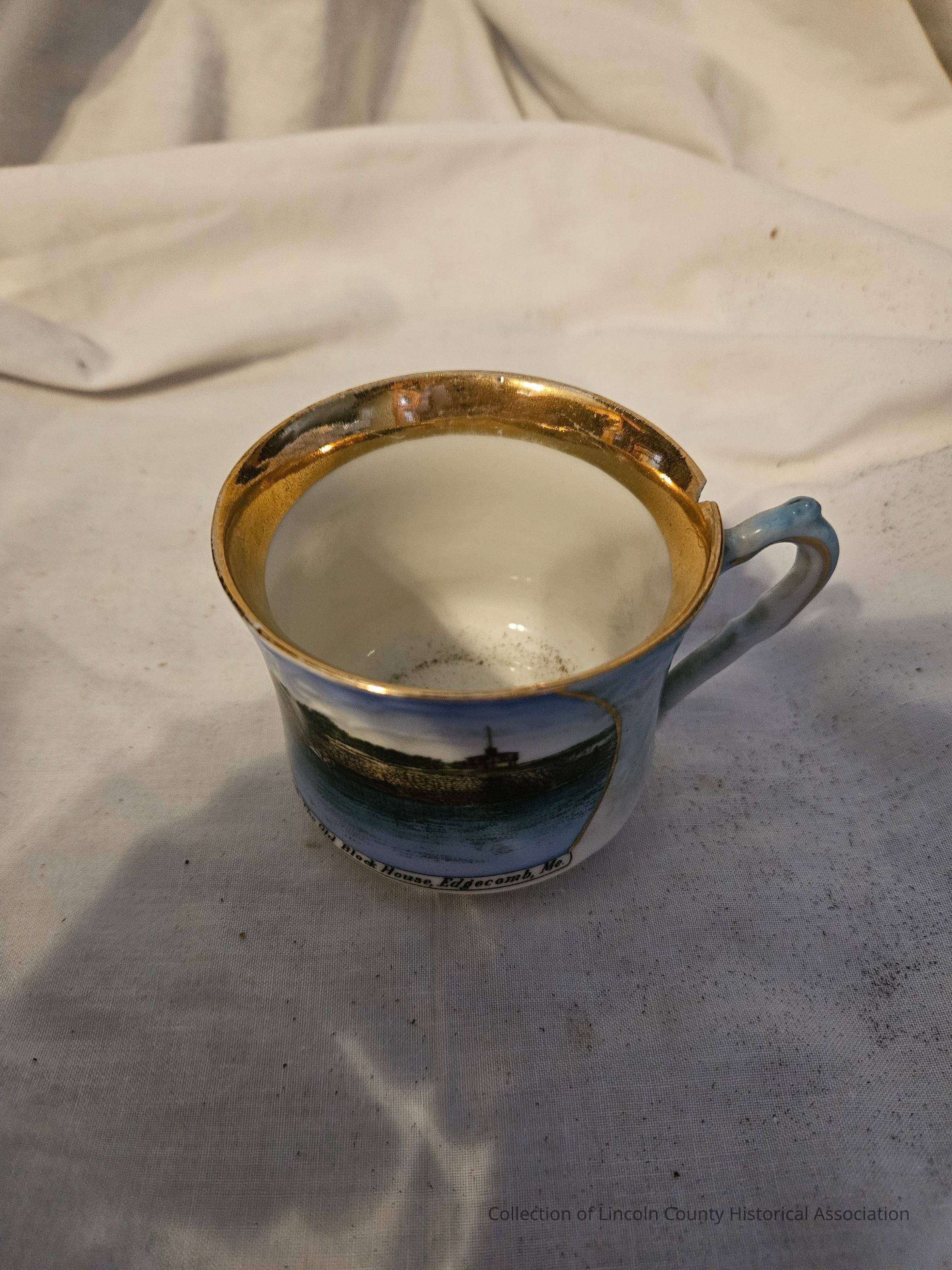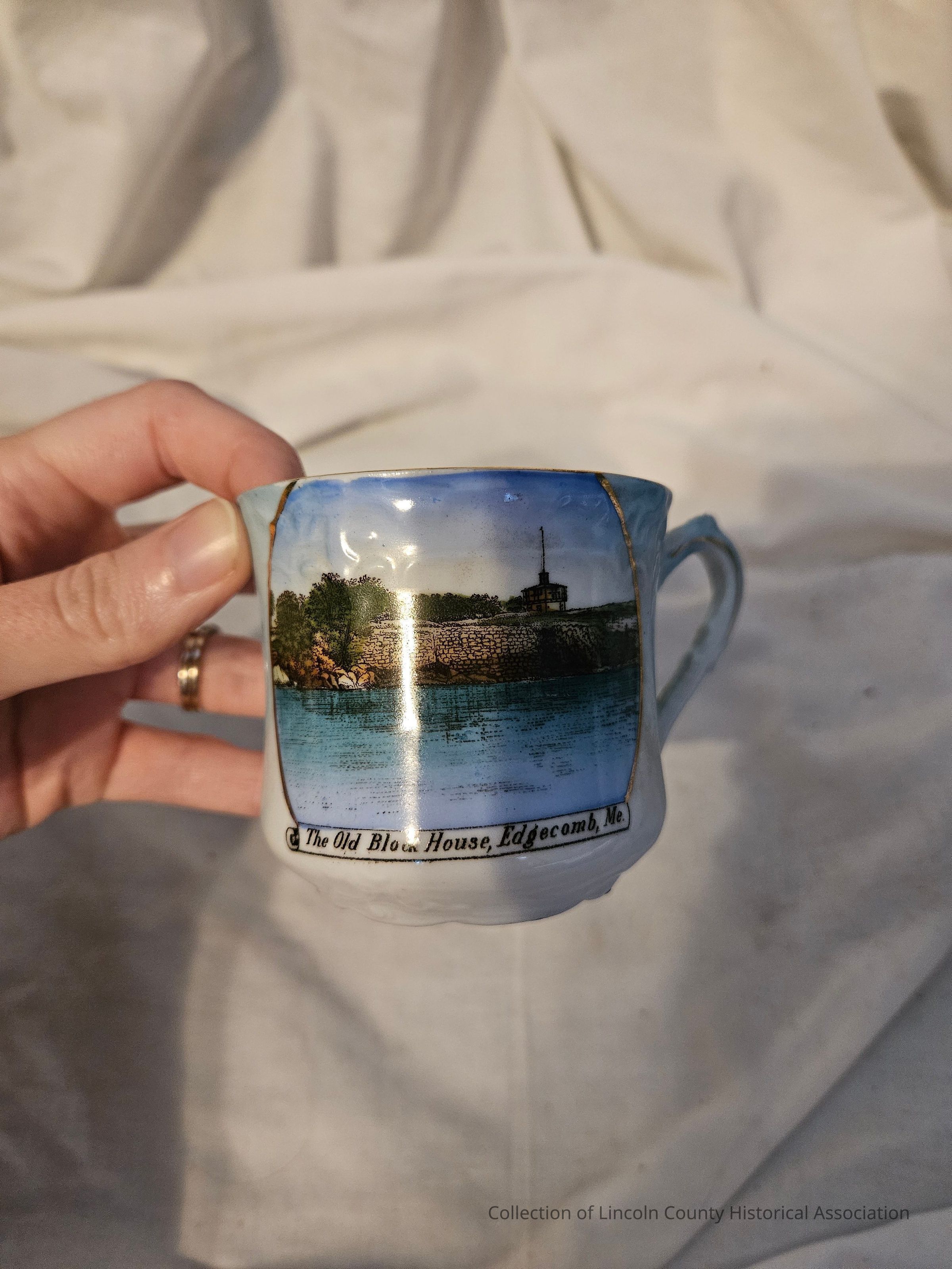 China souvenir cup. Image of the Old Block House in Edgecomb in center. Blue in color and gold around rim. Has blue handle.Made/Created