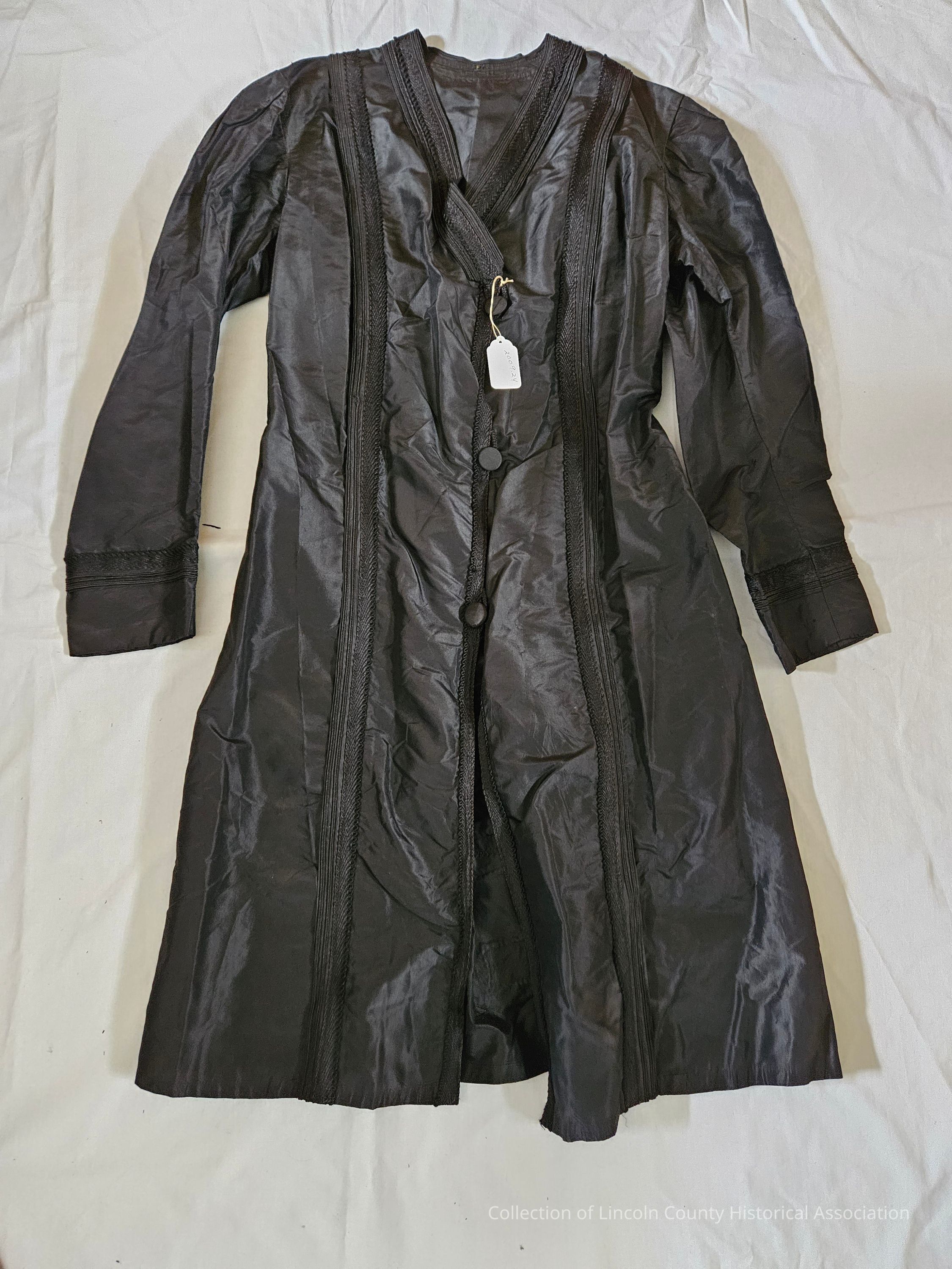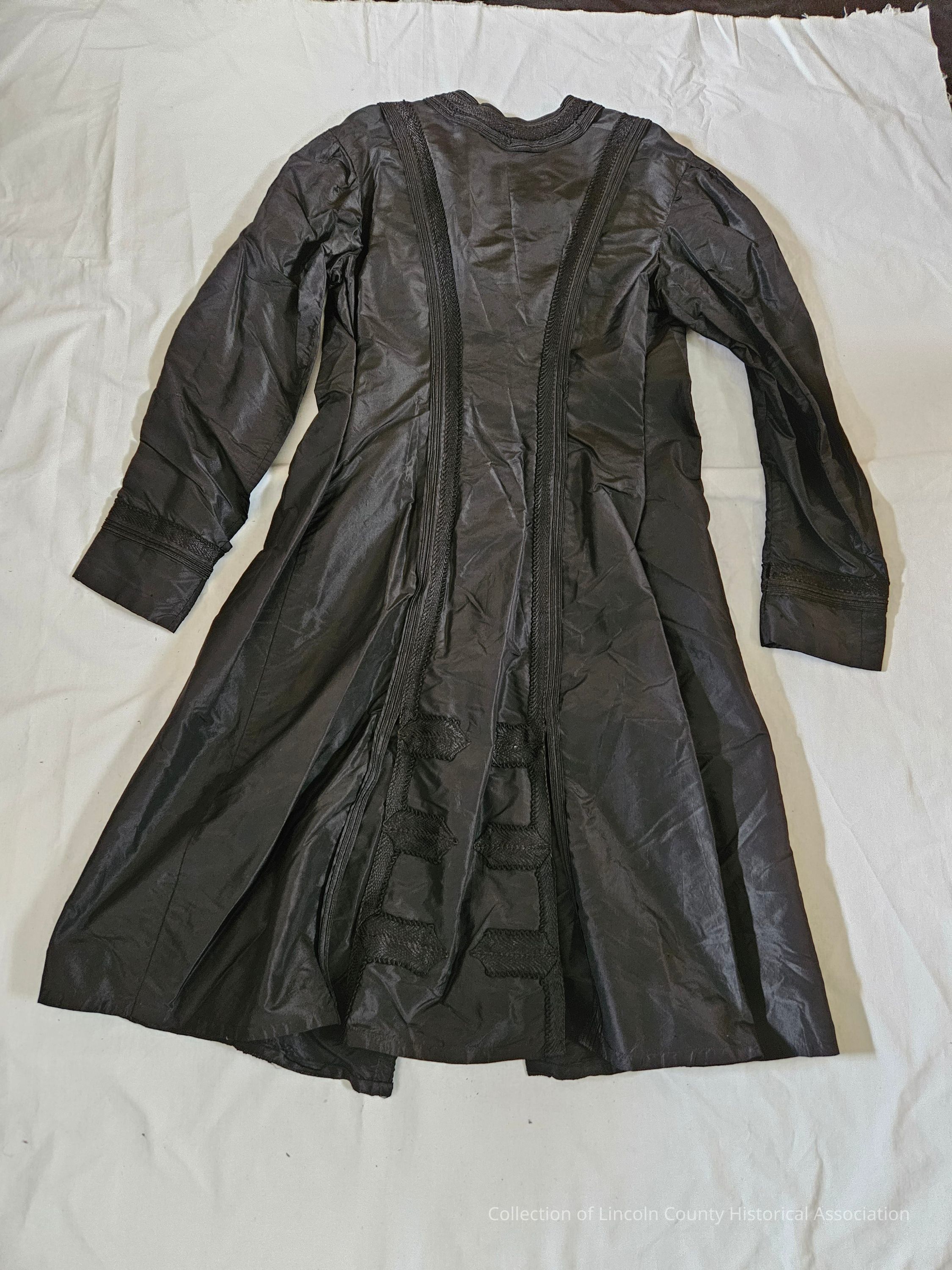 Black silk light walking jacket. Braid trim at cuffs and collar. Two stripes of braided trim down front and back. Three flaps at the bottom back of coat with trim on center flap. Buttons down the front. Machine stitched.Clothing/Dress/Costume Details