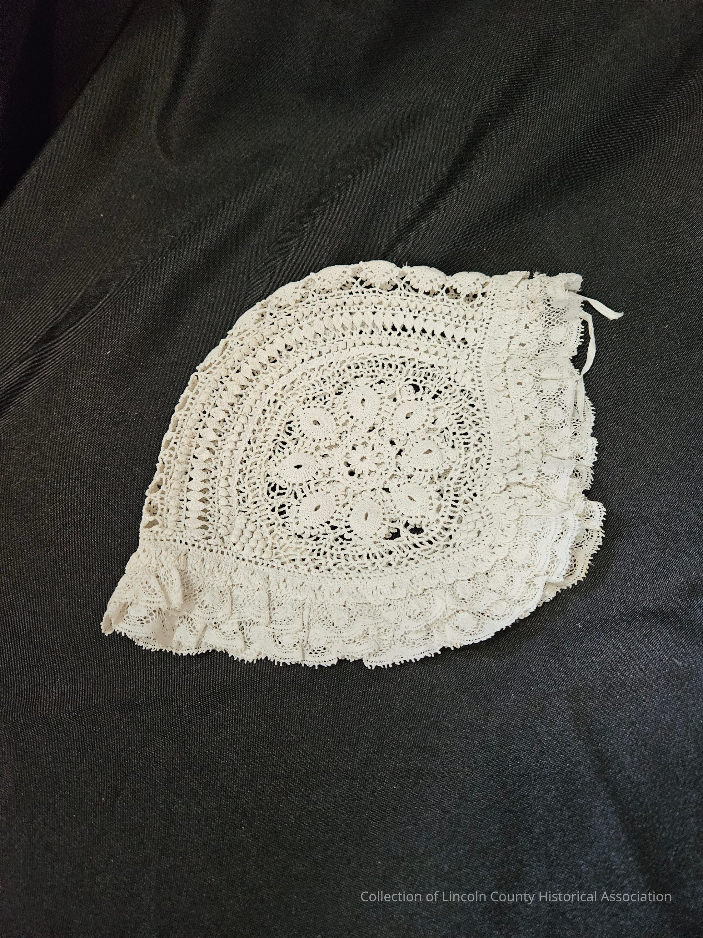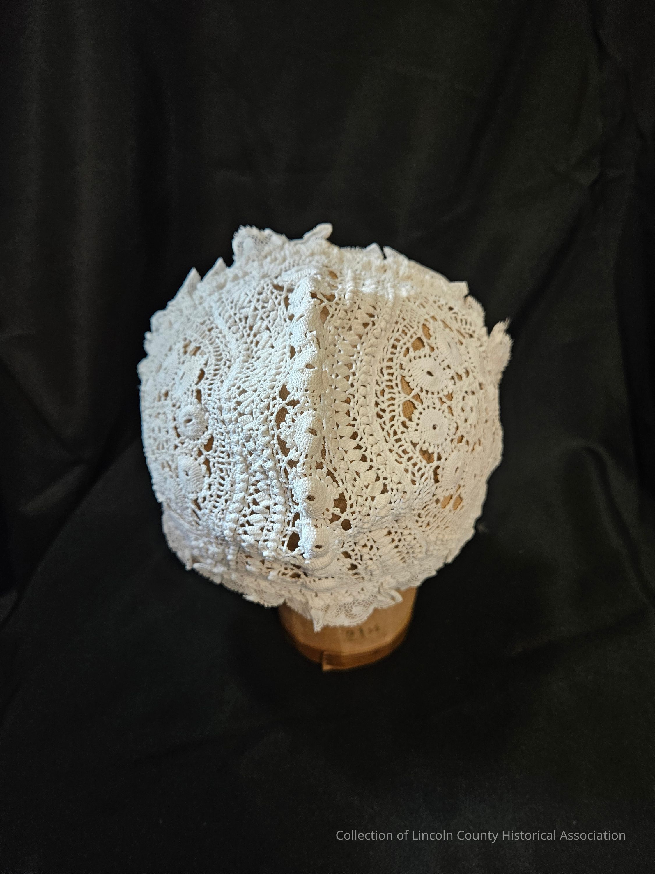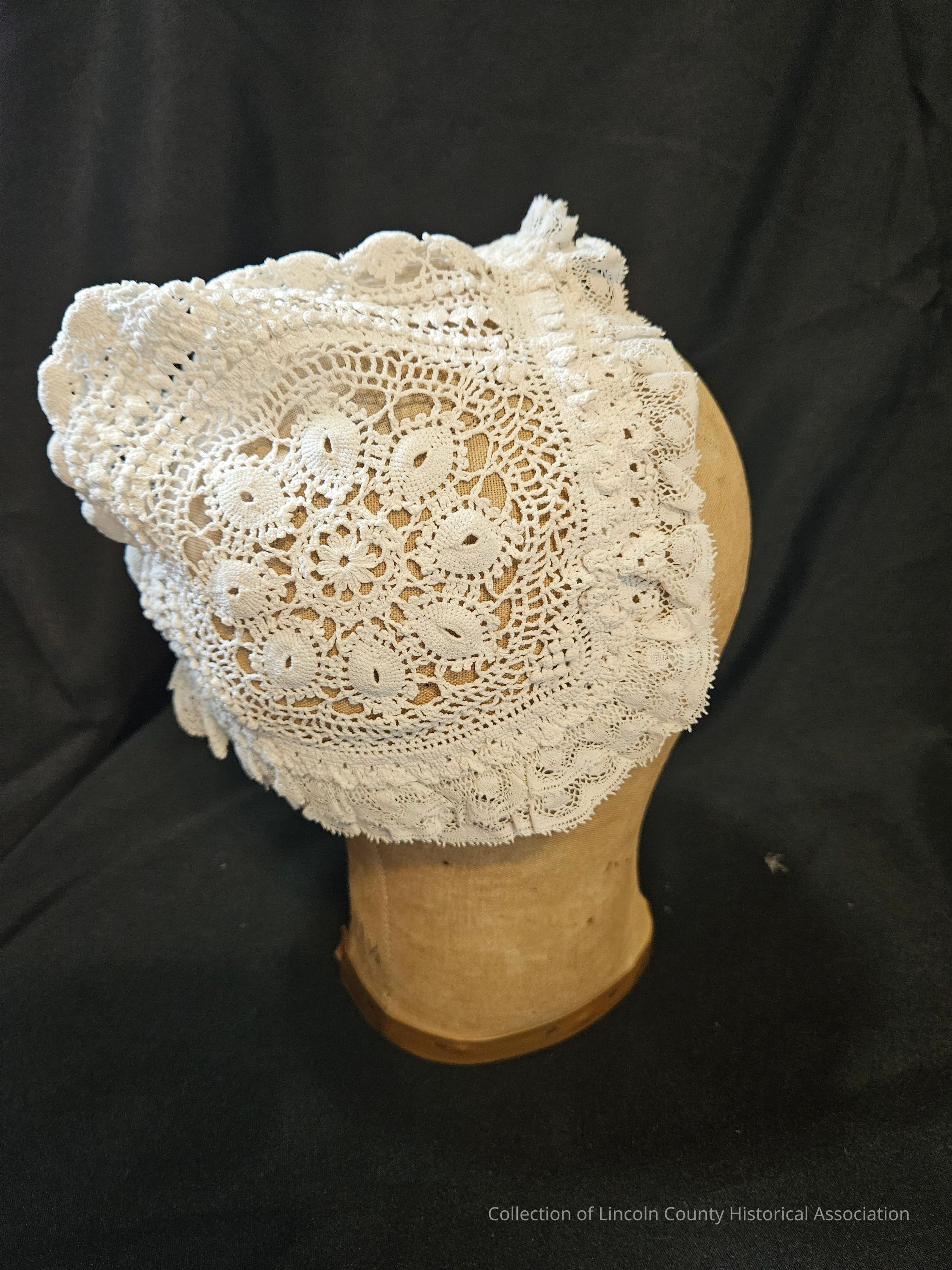 Crocheted white cap with lace ruffle edging. Drawstring at base of neck and top of forehead.Clothing/Dress/Costume Details