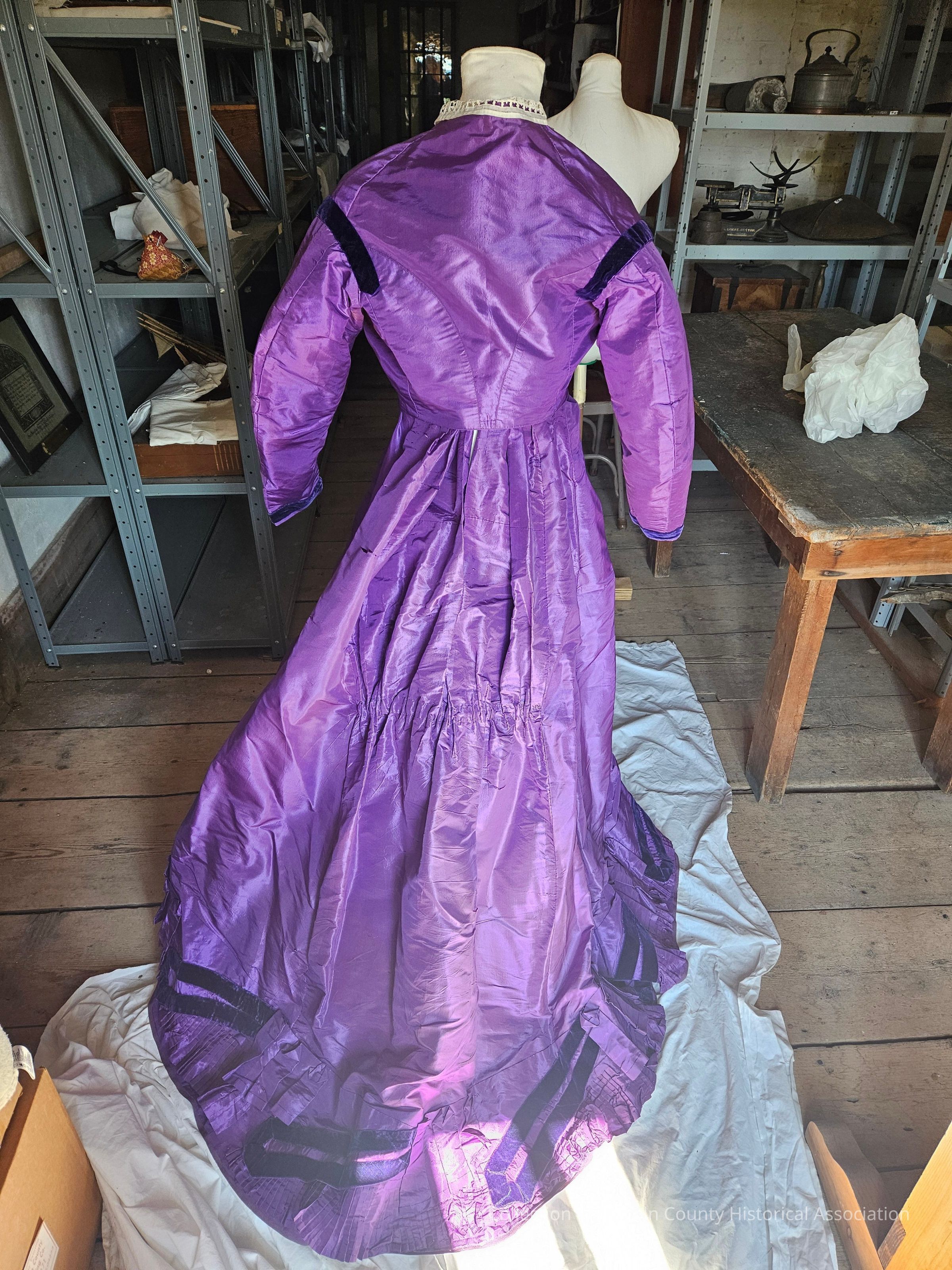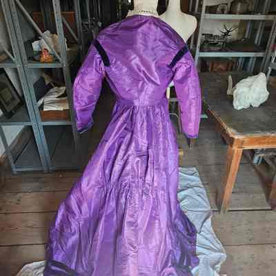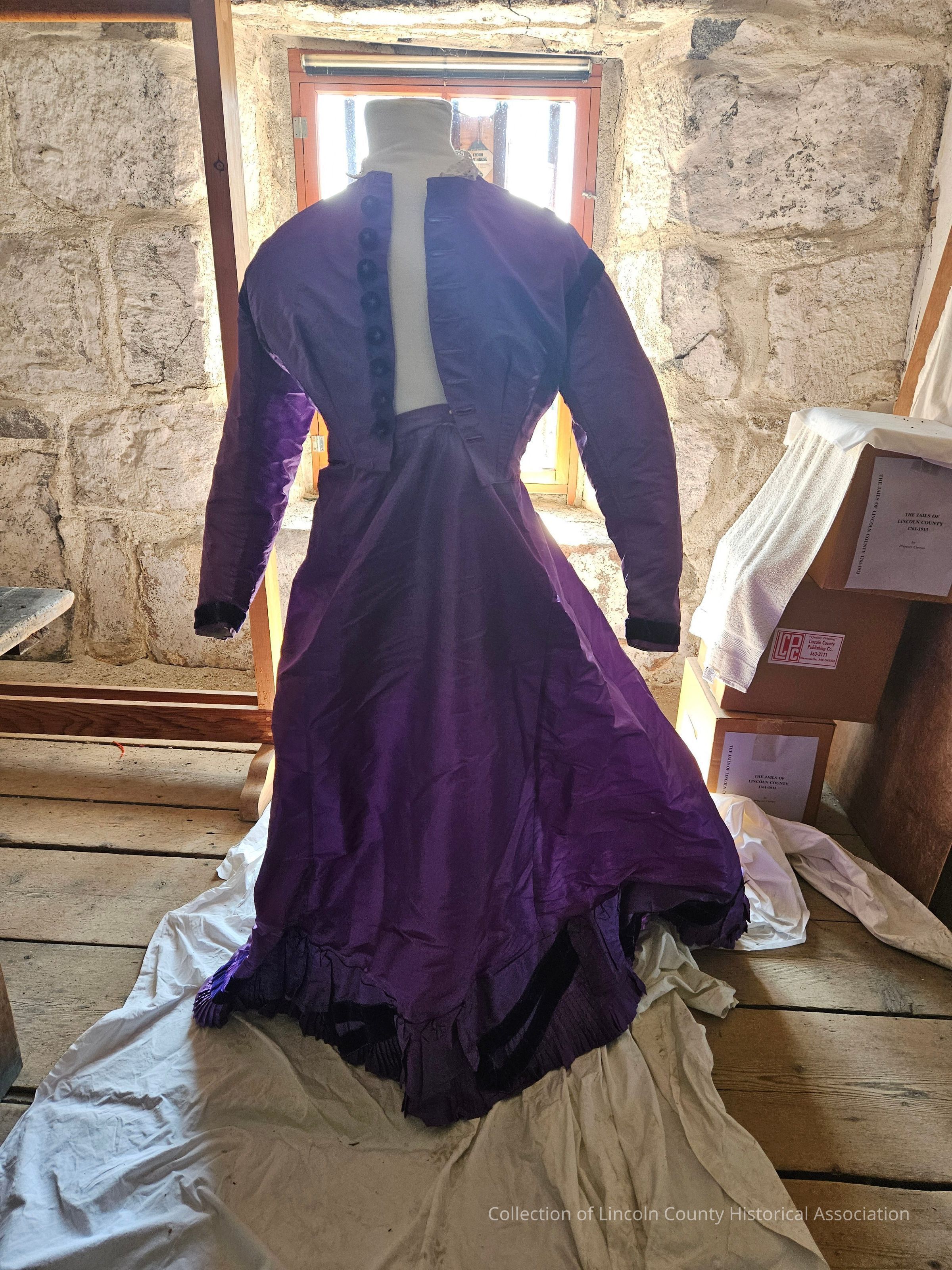 Matching purple silk bodice and skirt. Bodice trimmed with velvet around shoulder and cuffs. Eight velvet covered buttons down front. Buttons have star design in the center. Skirt is ruffled at hem with velvet trim.Clothing/Dress/Costume Details