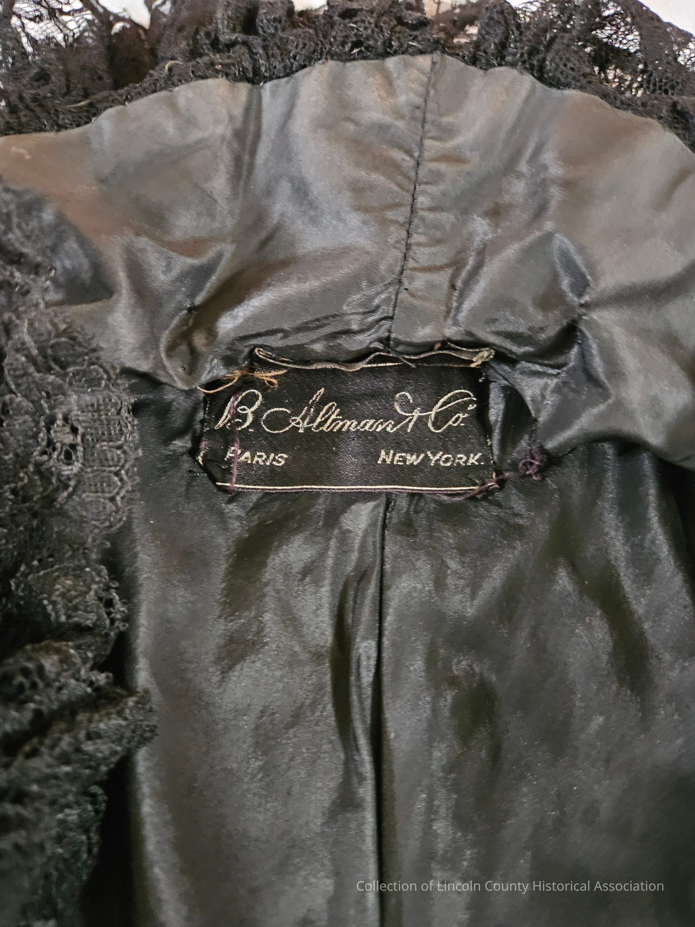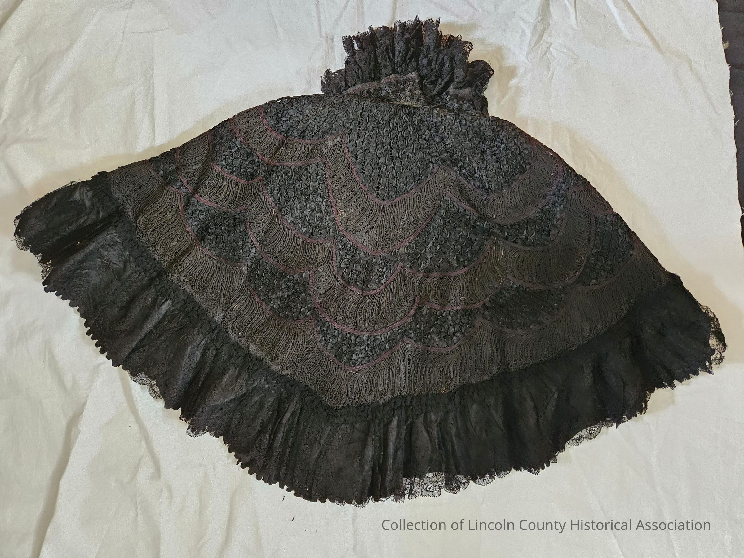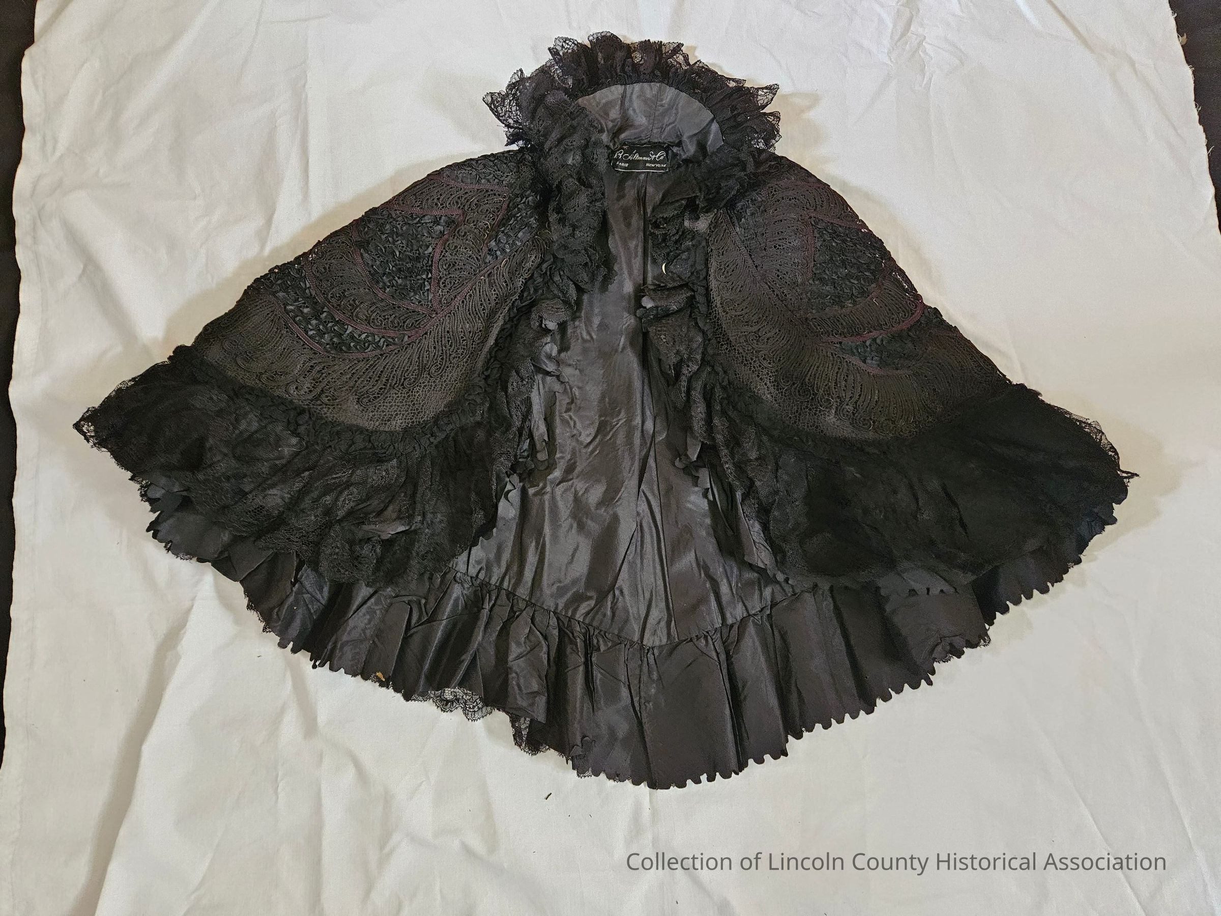 Black silk small cape. Gimp embroidery over net. Black lace edging. Fold over collar. Machine made.