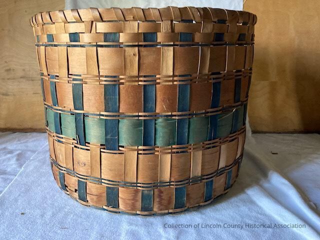 Cylindrical Native American Penobscot splint basket decorated with pattern of black and green colored splints. Double rimMade/Created