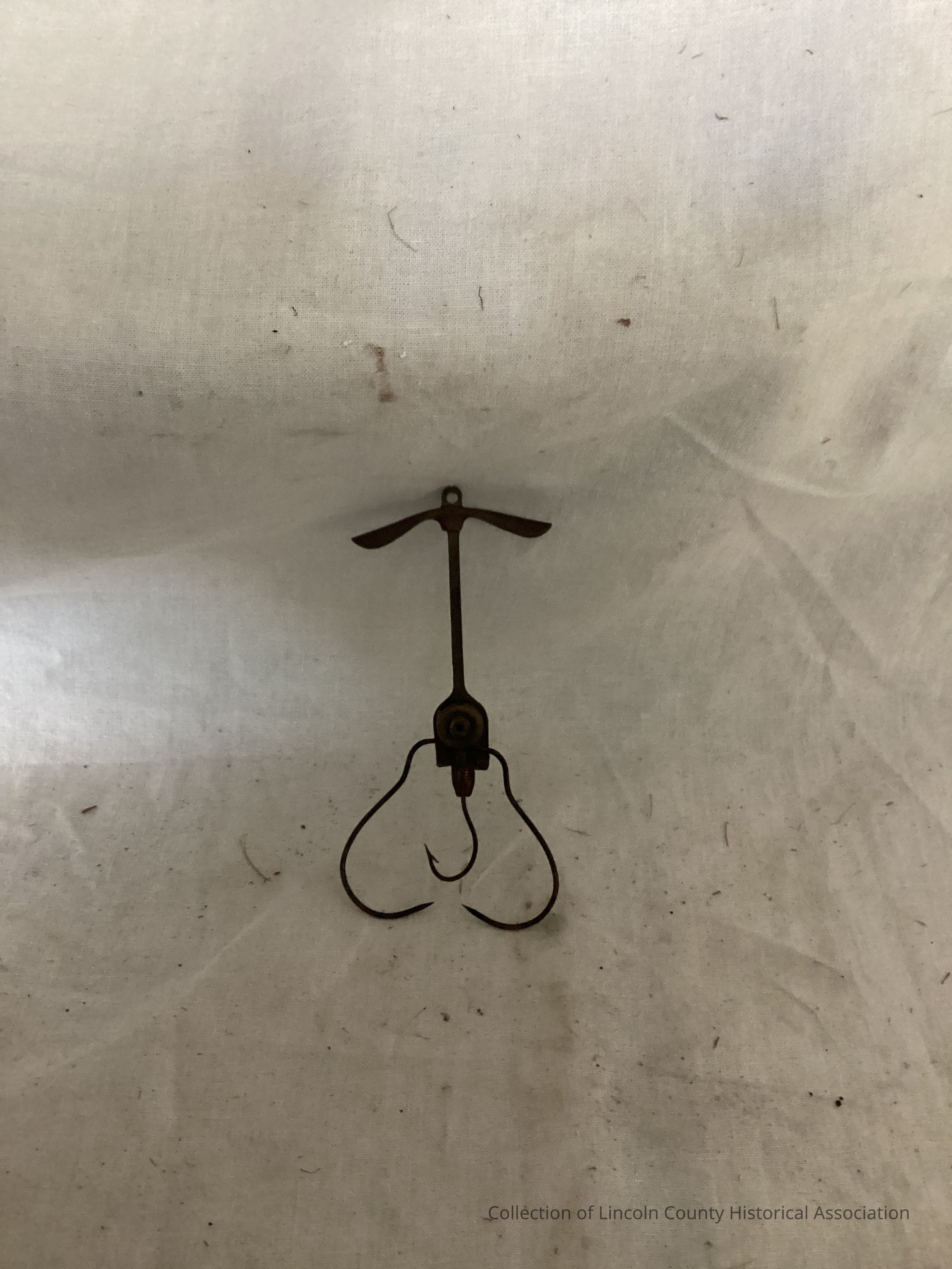 Steel and brass fish hook. Designed with a spring which releases two sharp prongs below the hook to discourage fish from stealing bait.