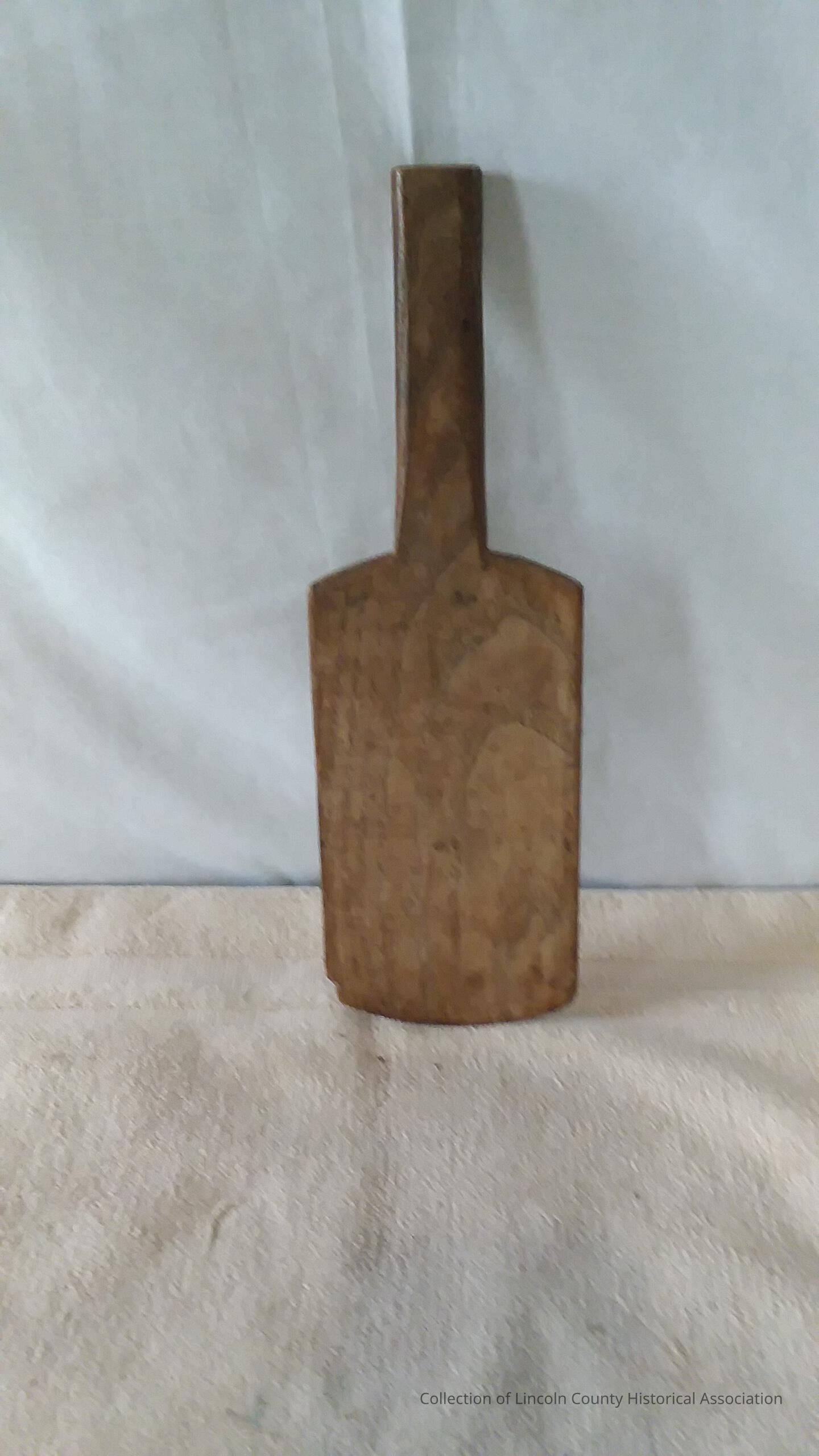 Wooden butter paddle ending in a broad, spade-like blade. Handle is slightly beveled.Made/Created