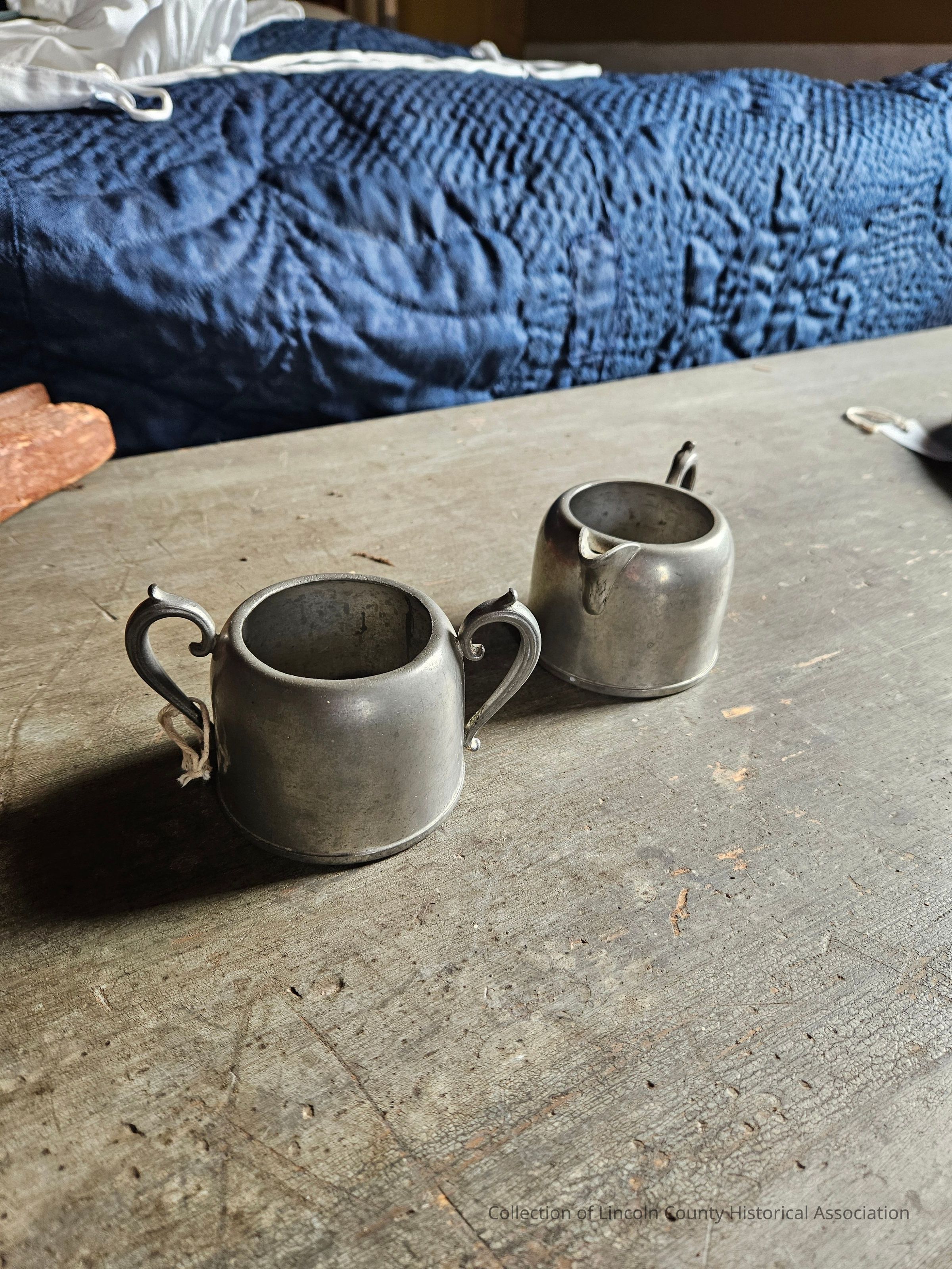 Pewter sugar bowl and creamer. Creamer has a spout and a single handle opposite from spout whereas the sugar bowl and two scrolled handles resembling a question mark.