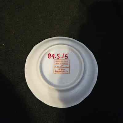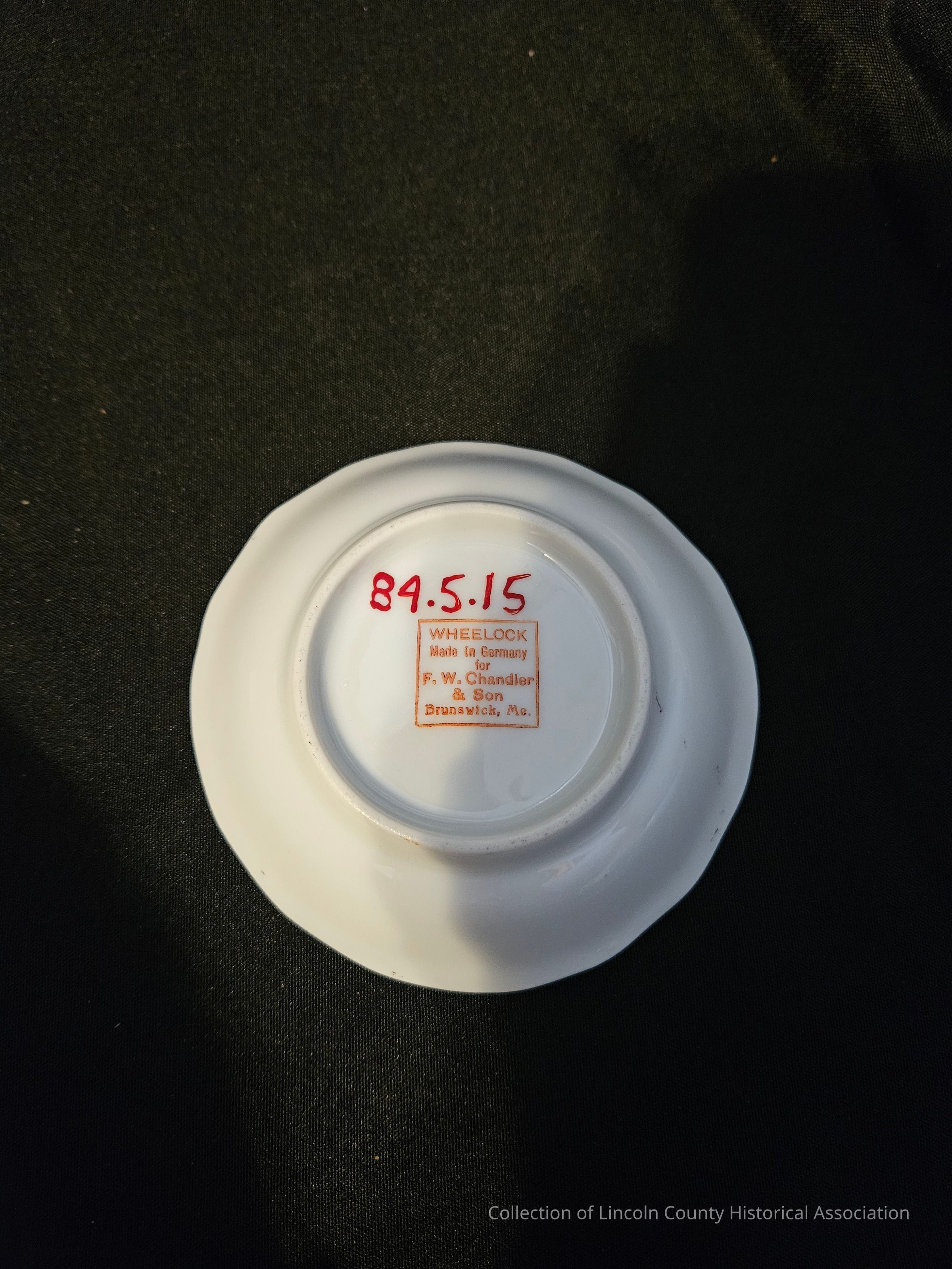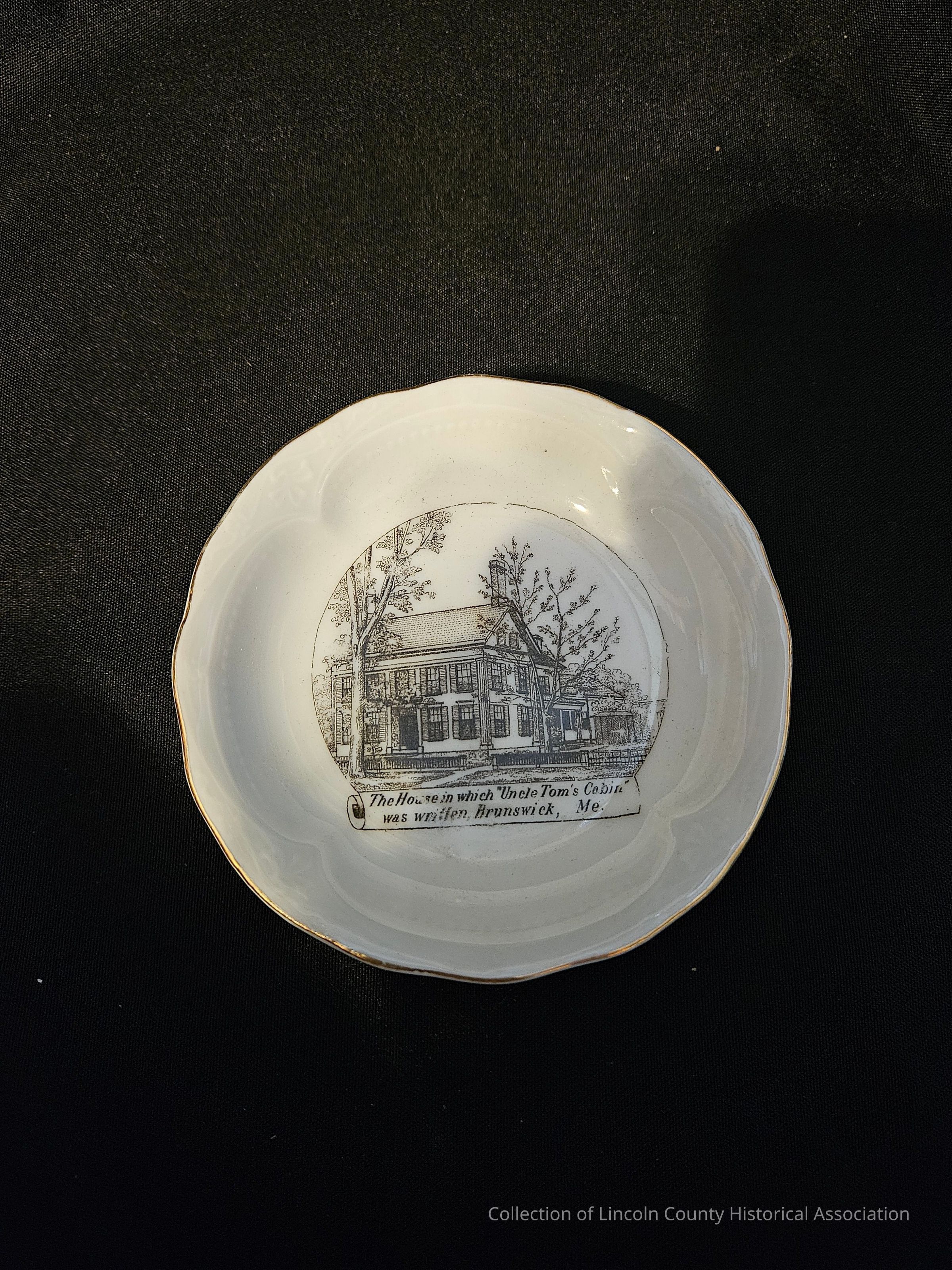 China souvenir dish with gold trim. Black and white image of Harriet Beecher Stowe's house in Brunswick in the center.