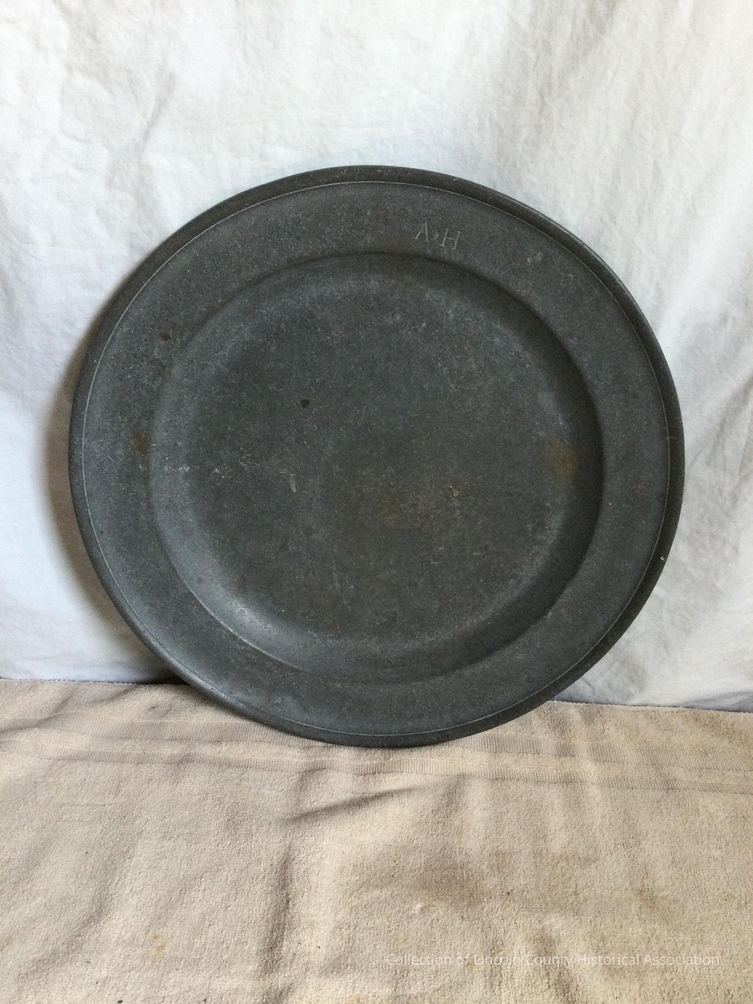 "A H" incised on the surface of the rim. There are also three illegible stamp marks on the underside of the plate.