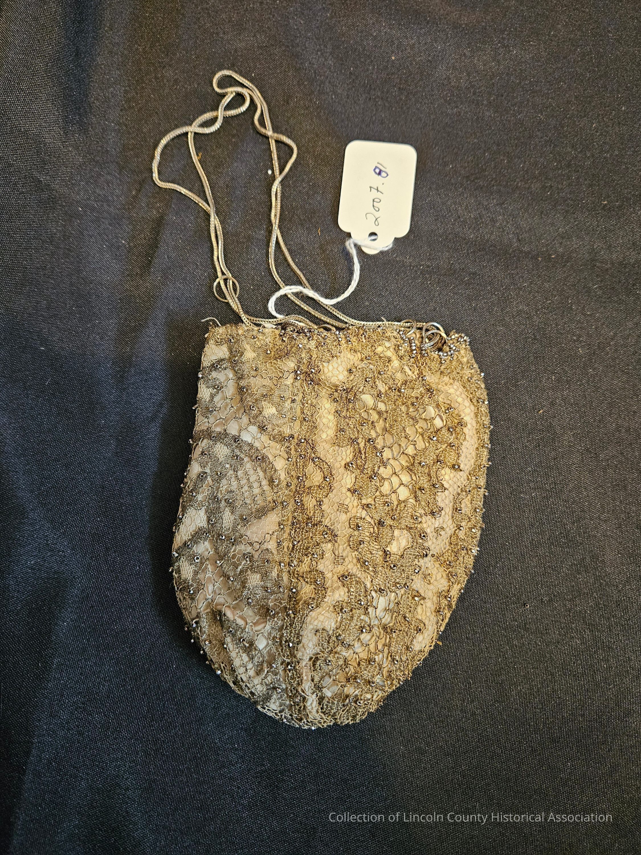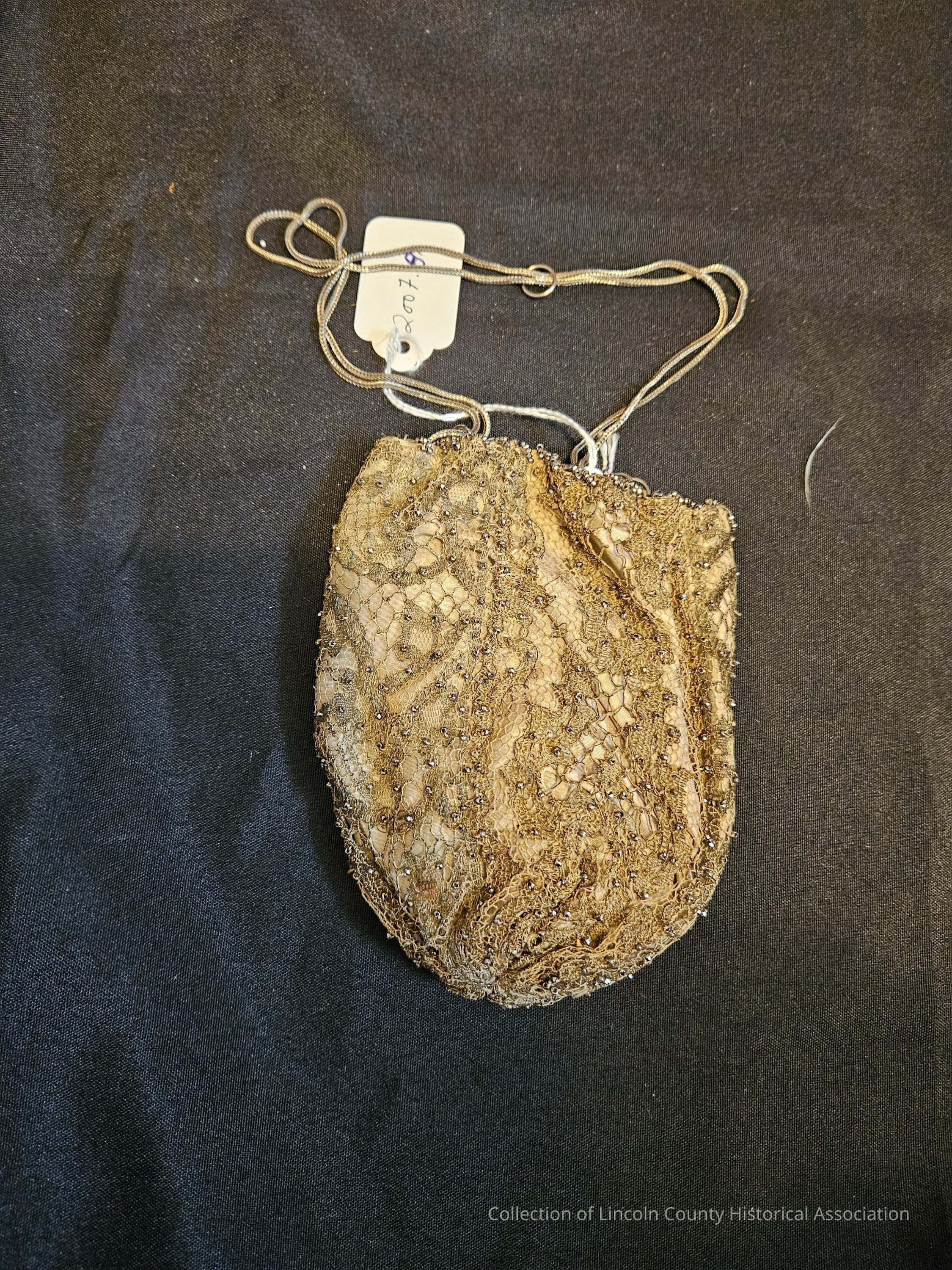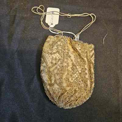 Small lace and bead covered pouch/purse. Tan silk with silver beads. Silver double chain handle.Made/Created