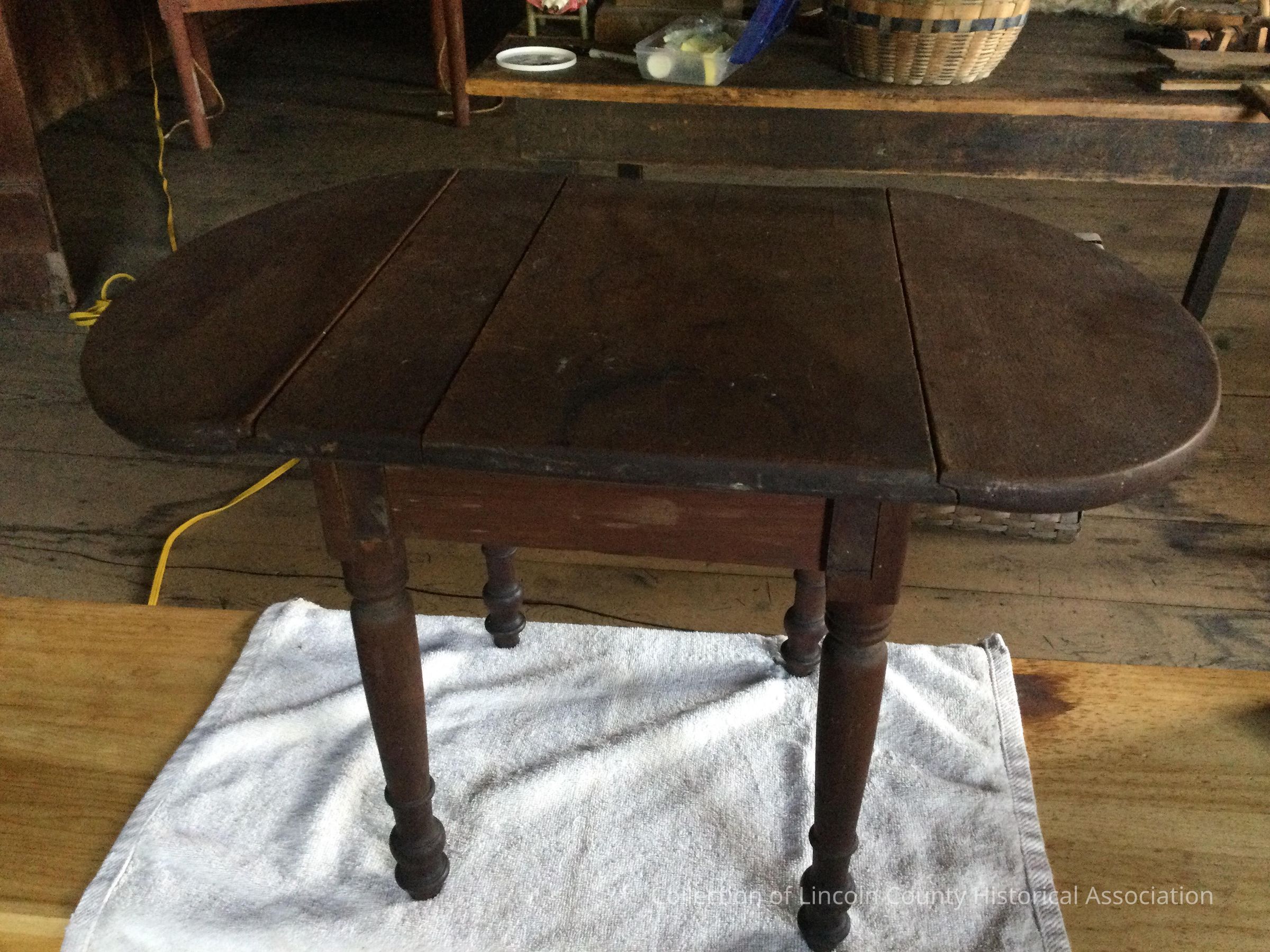 Child's toy drop-leaf table. It is dark brown with 4 tapering, turned legs. Butterfly braces to support leavesMade/Created
