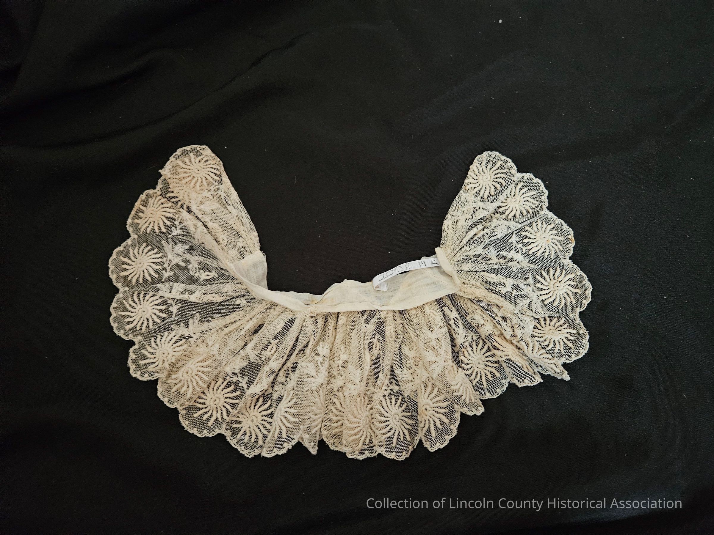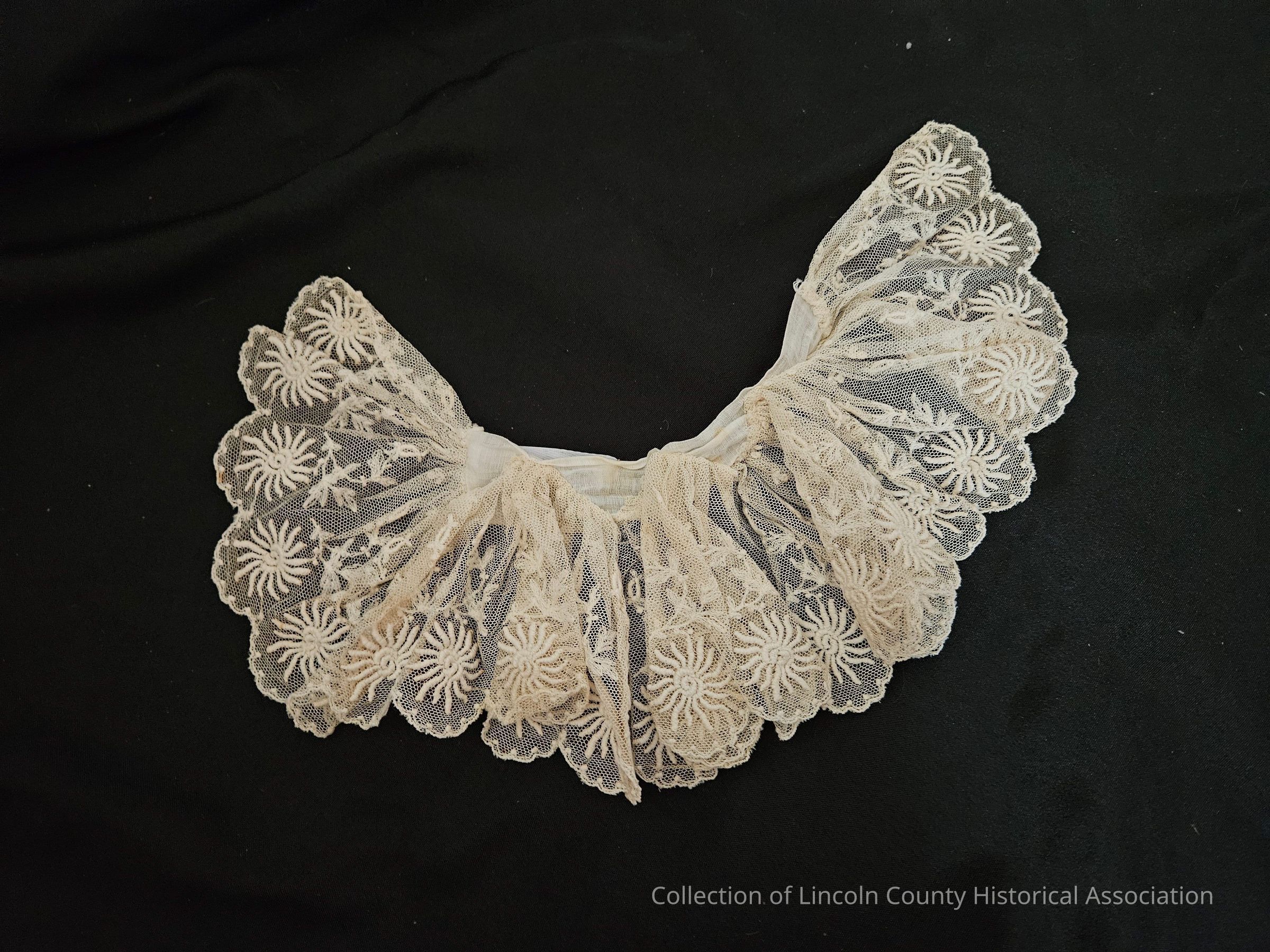 White collar or potentially a single cuff. Ruffled with an embroidered sunburst pattern. Mostly lace, but there is a plain cotton band at the top.Clothing/Dress/Costume Details