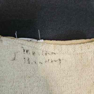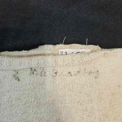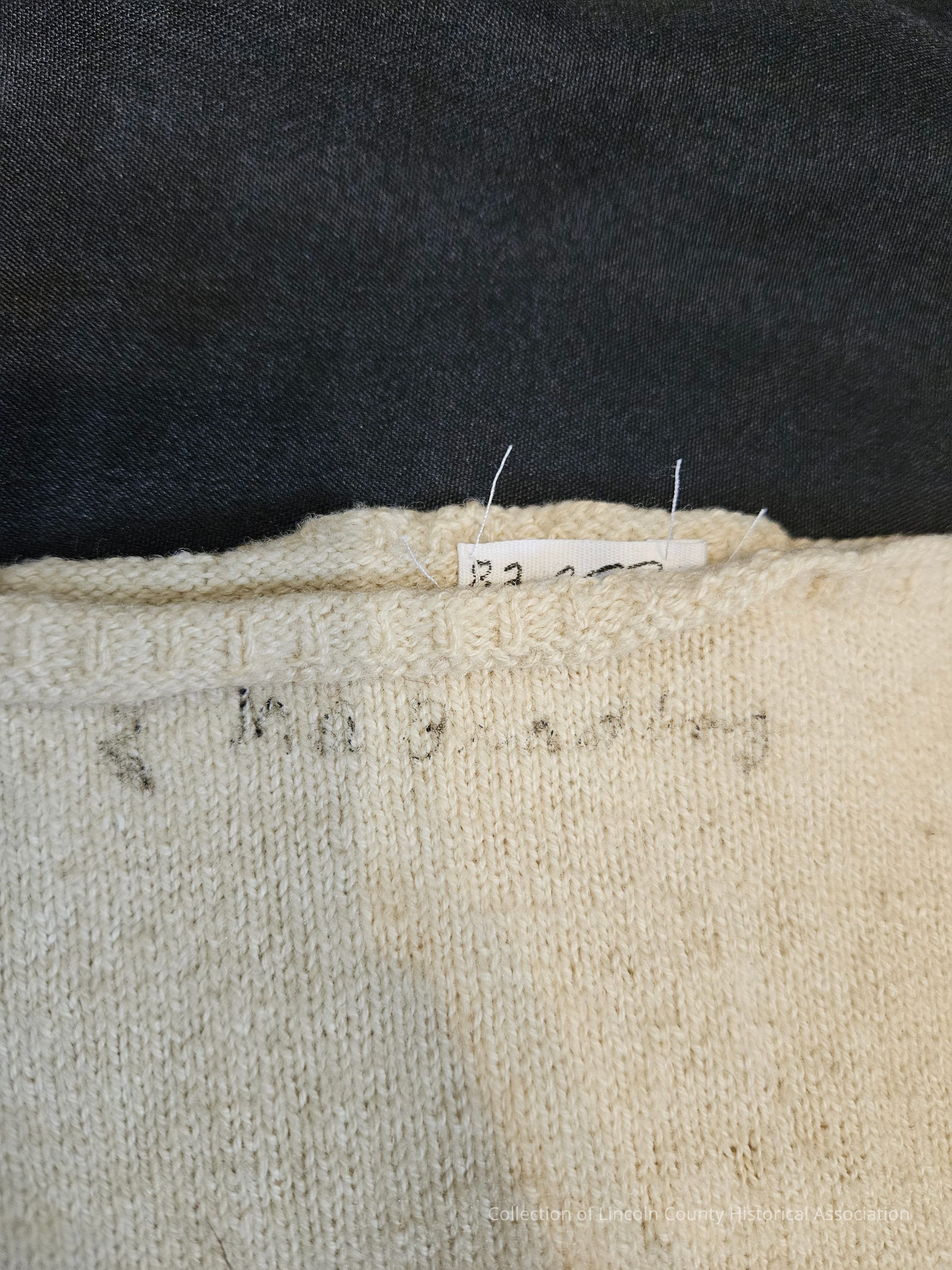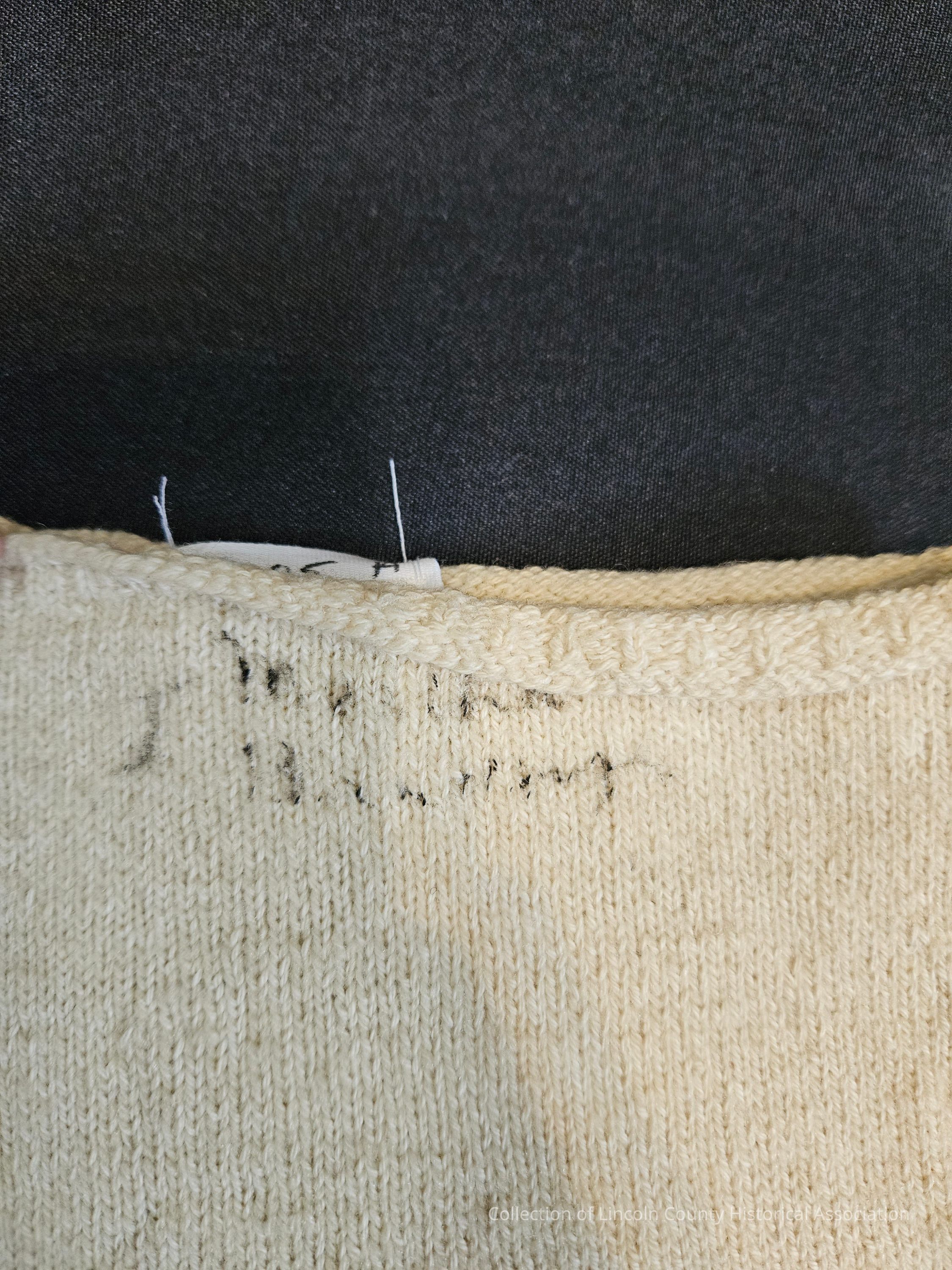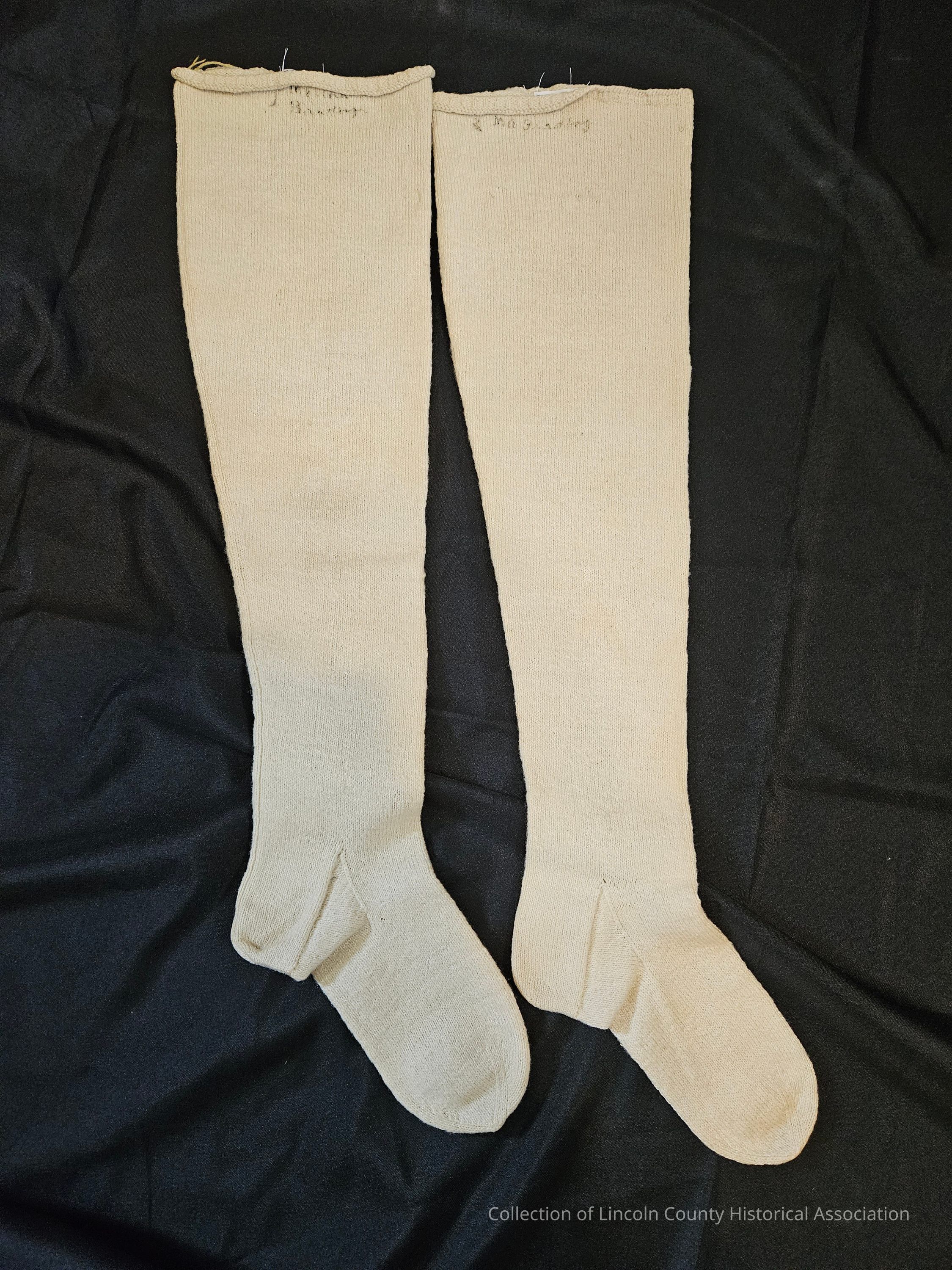 Pair of wool men's stockings. Thigh length. An illegible signature/name written on the top of each stocking. Back seam runs down to heel. Reinforced heel.Clothing/Dress/Costume Details