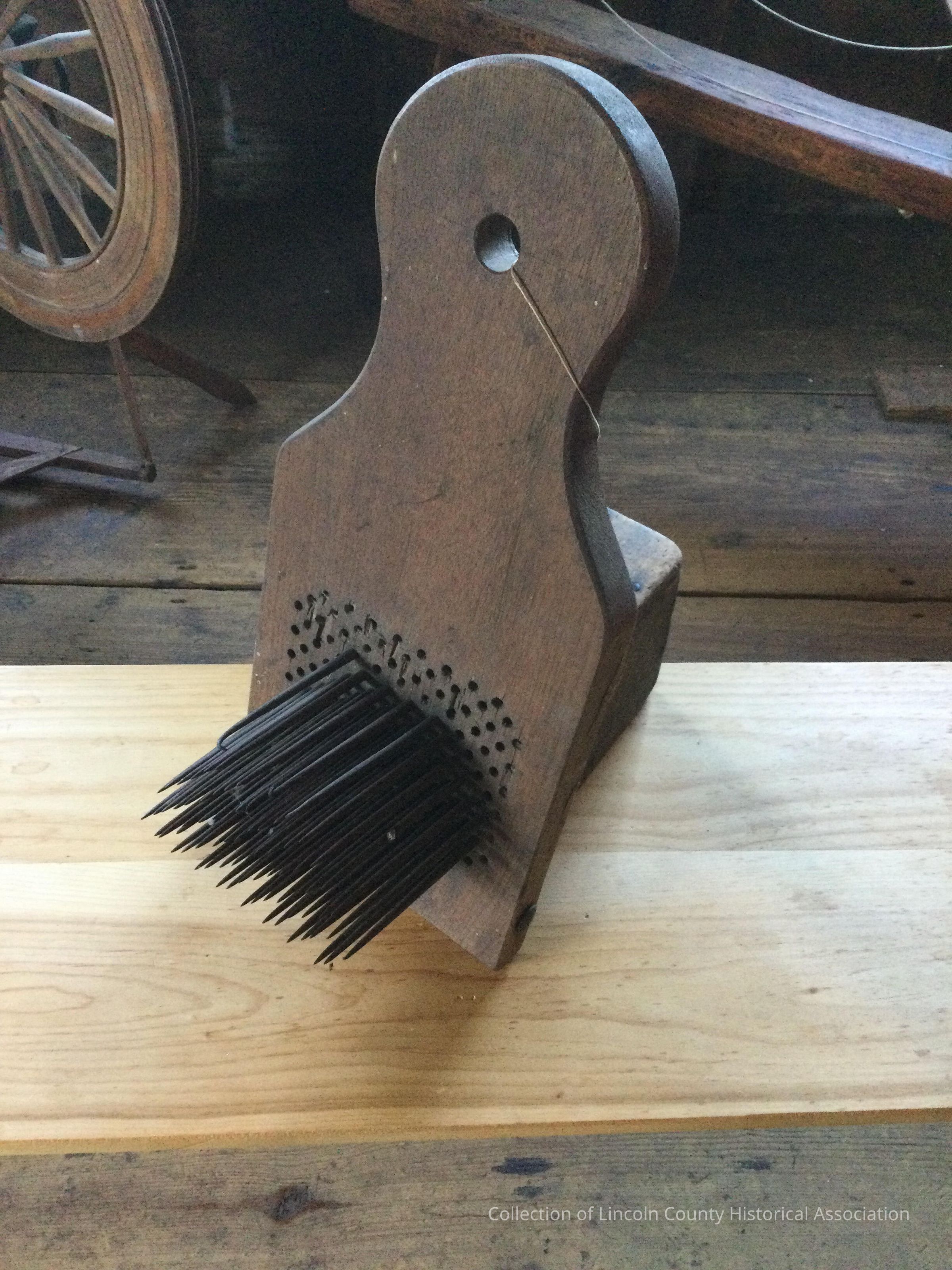 Hetchel. Wooden board rounded at one end with inset iron spikes in a diamond pattern. Hole through the top section of the handle to provide means of hanging the hetchel.
