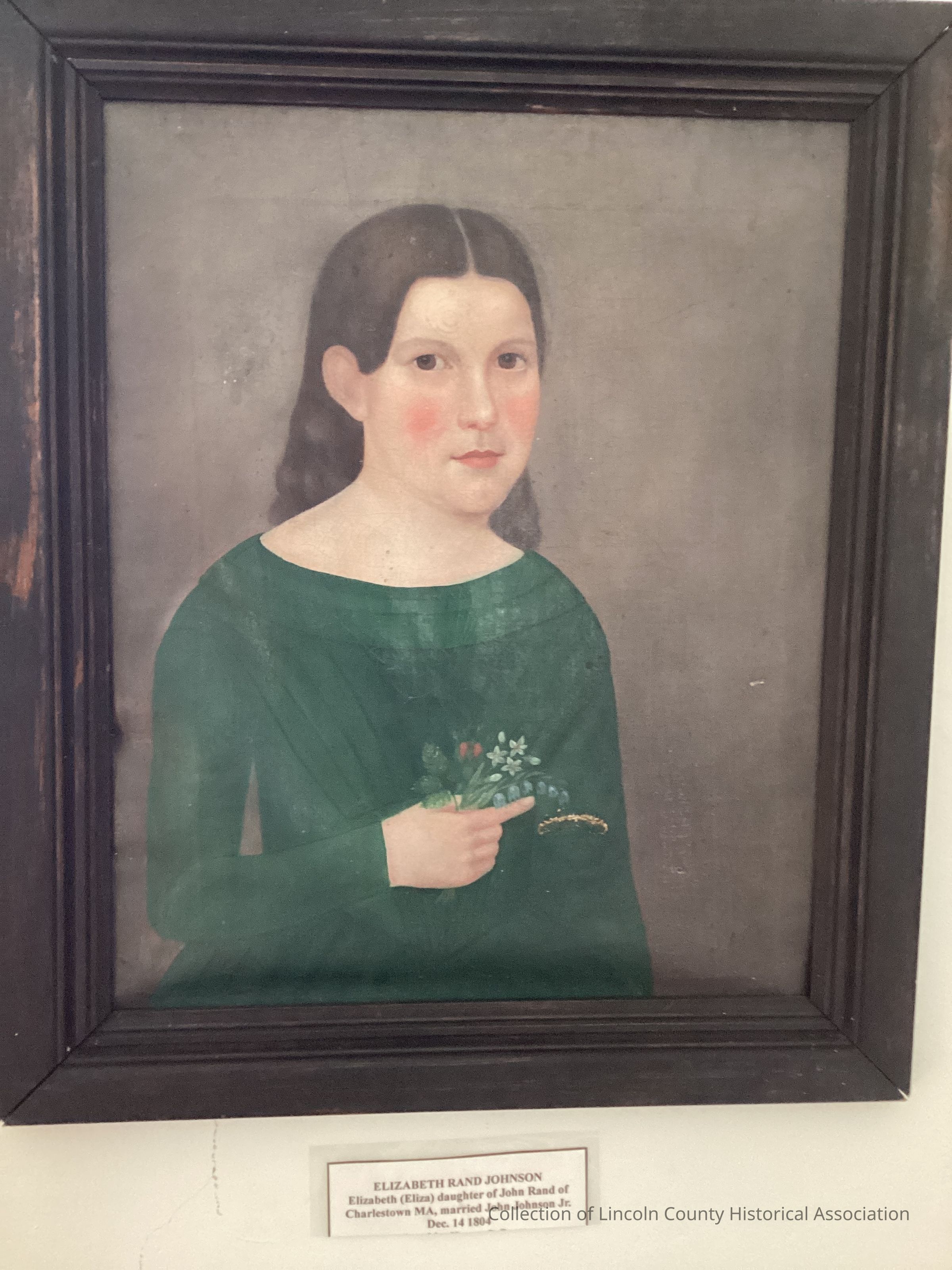 This painting has erroneously been attributed to Henry Cheever Pratt. The subject has also been identified as Mrs. Abeil Wood (?). On a separate label the sitter is identified as Elizabeth Rand Johnson. Elizabeth (Eliza), daughter of John Rand of Charlestown, Massachusetts, married John Johnson, Jr. on December 14, 1804. Given the apparent age of the sitter this would preclude Henry Cheever Pratt's authorship. Instead, this portrait appears to be by an itinerant American painter and executed with a certain naivete, typical of a folk art limner.