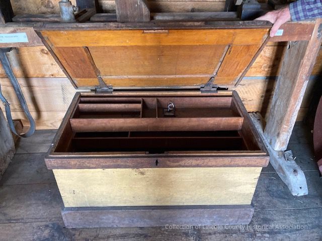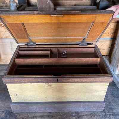 Six board wooden tool chest with interior shelving and compartments. Interior made of cherry and likely the sides but the top is pine. Boards are dovetailed together at corners.Made/Created