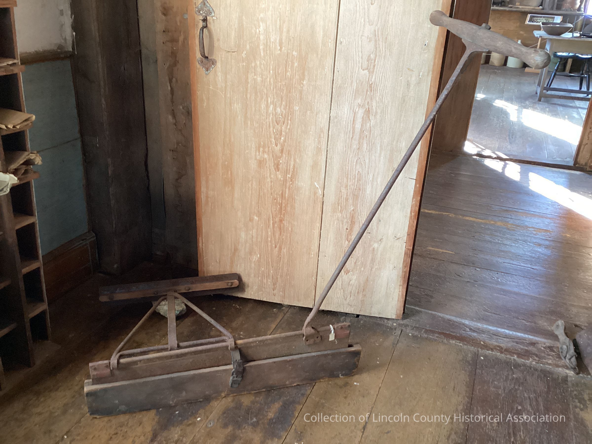 Hand ice block marker. Cast iron arm with wooden handle. The arm is attached to a substantial metal blade set within a wooden case. Apparatus also includes a metal runner with a blade set into a wooden bar. This is hinged to the wooden case so that it can run parallel to the blade contained in the case. This ice marker was designed to be hand-drawn by a person rather than the type drawn by animals.Made/Created