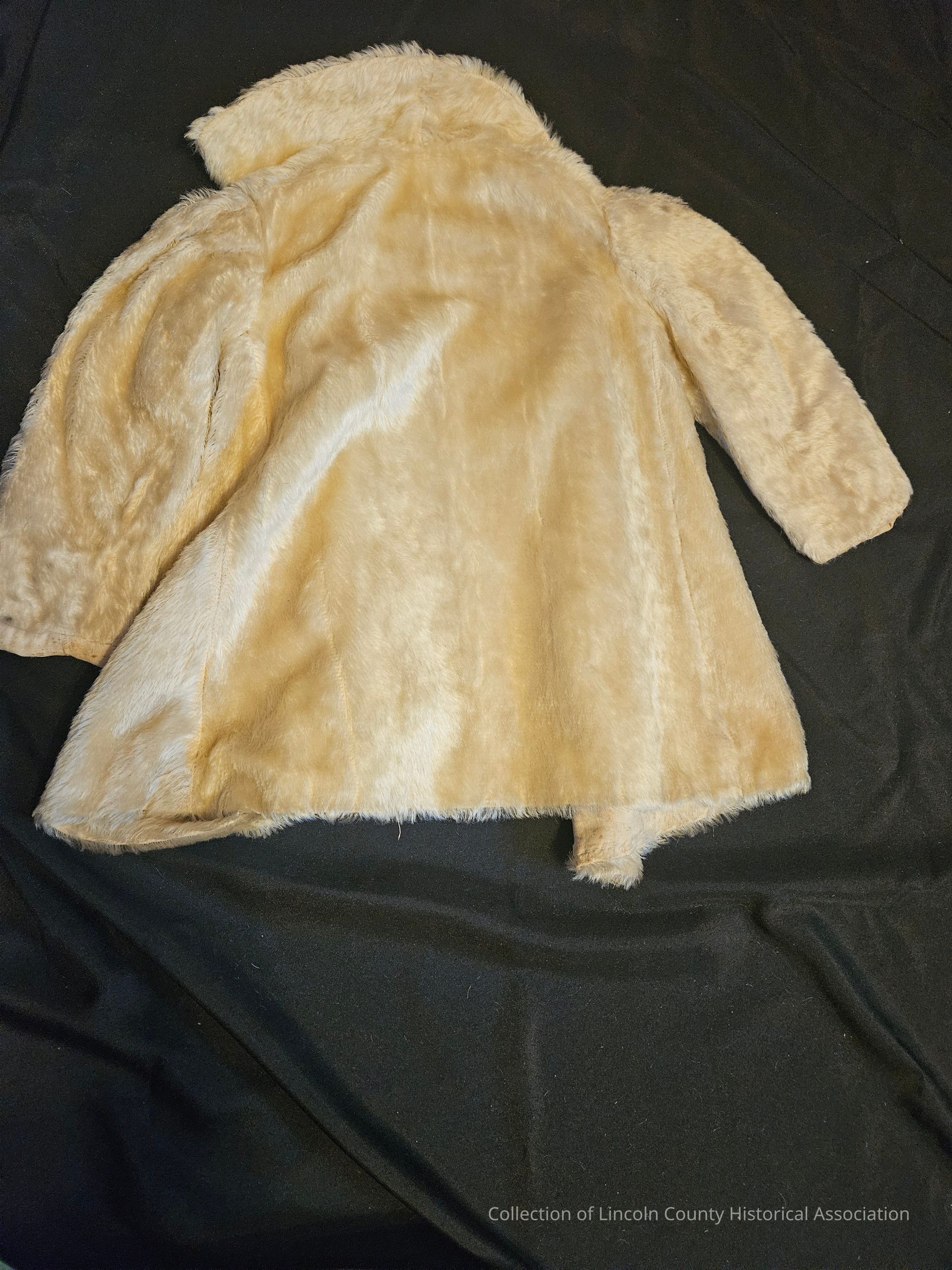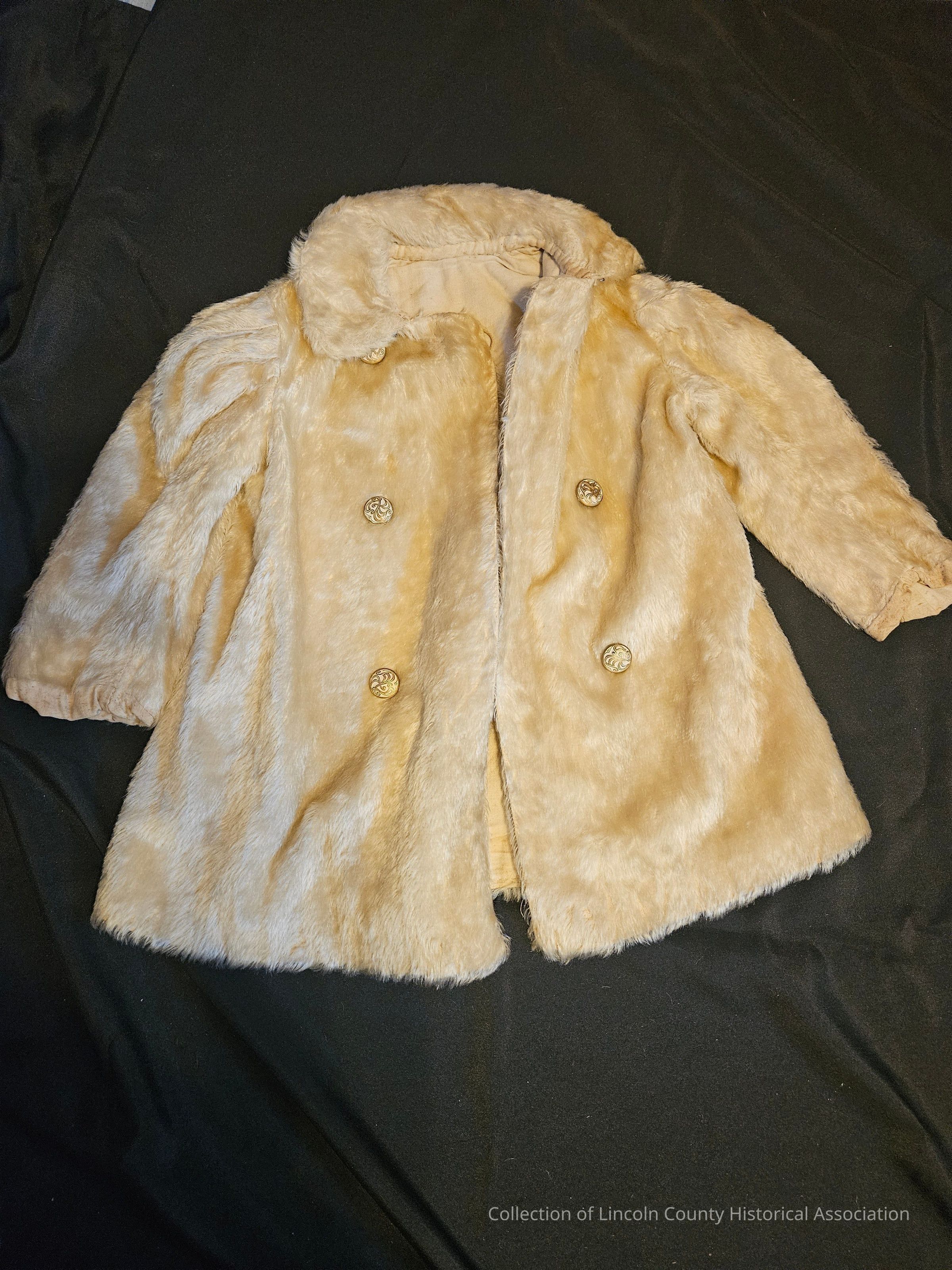 Child's off white mohair/alpaca coat. Six decorative buttons on front. Folded over collar. Tan cotton lining.Clothing/Dress/Costume Details