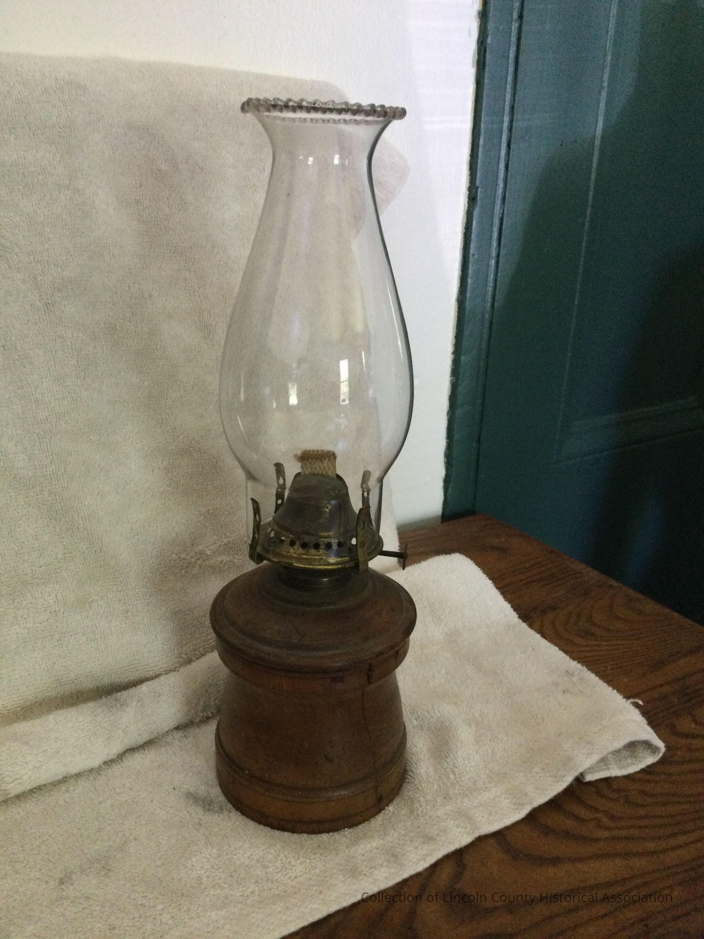 Metal oil lamp set into a wooden base which supports a glass chimney