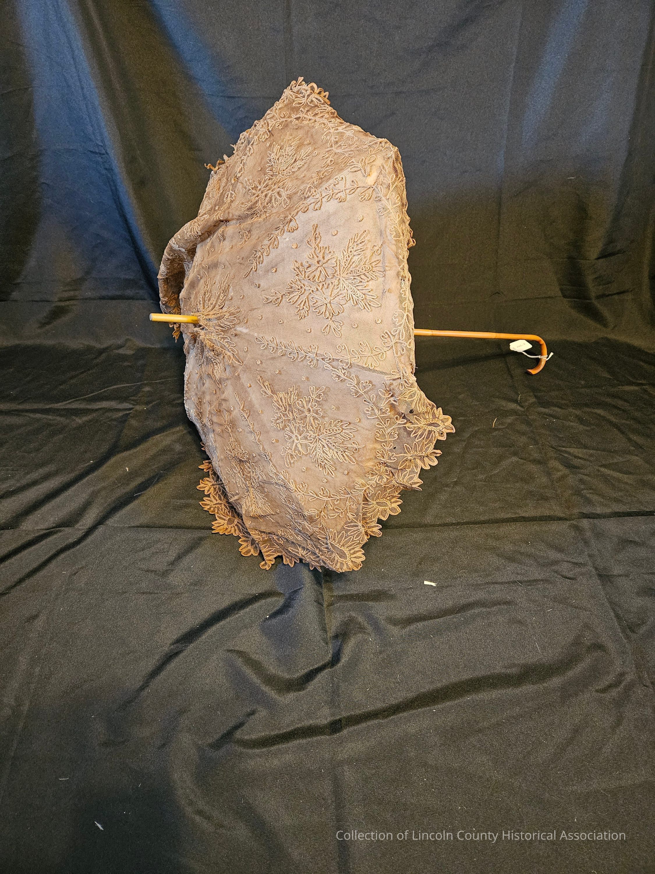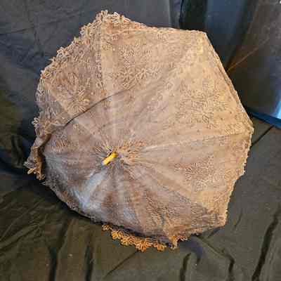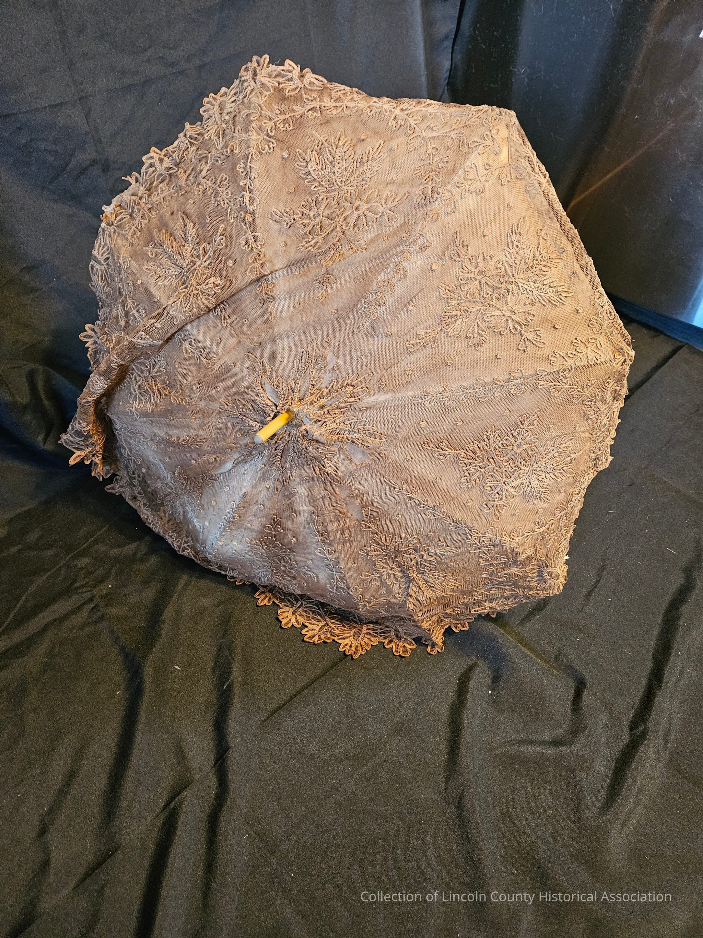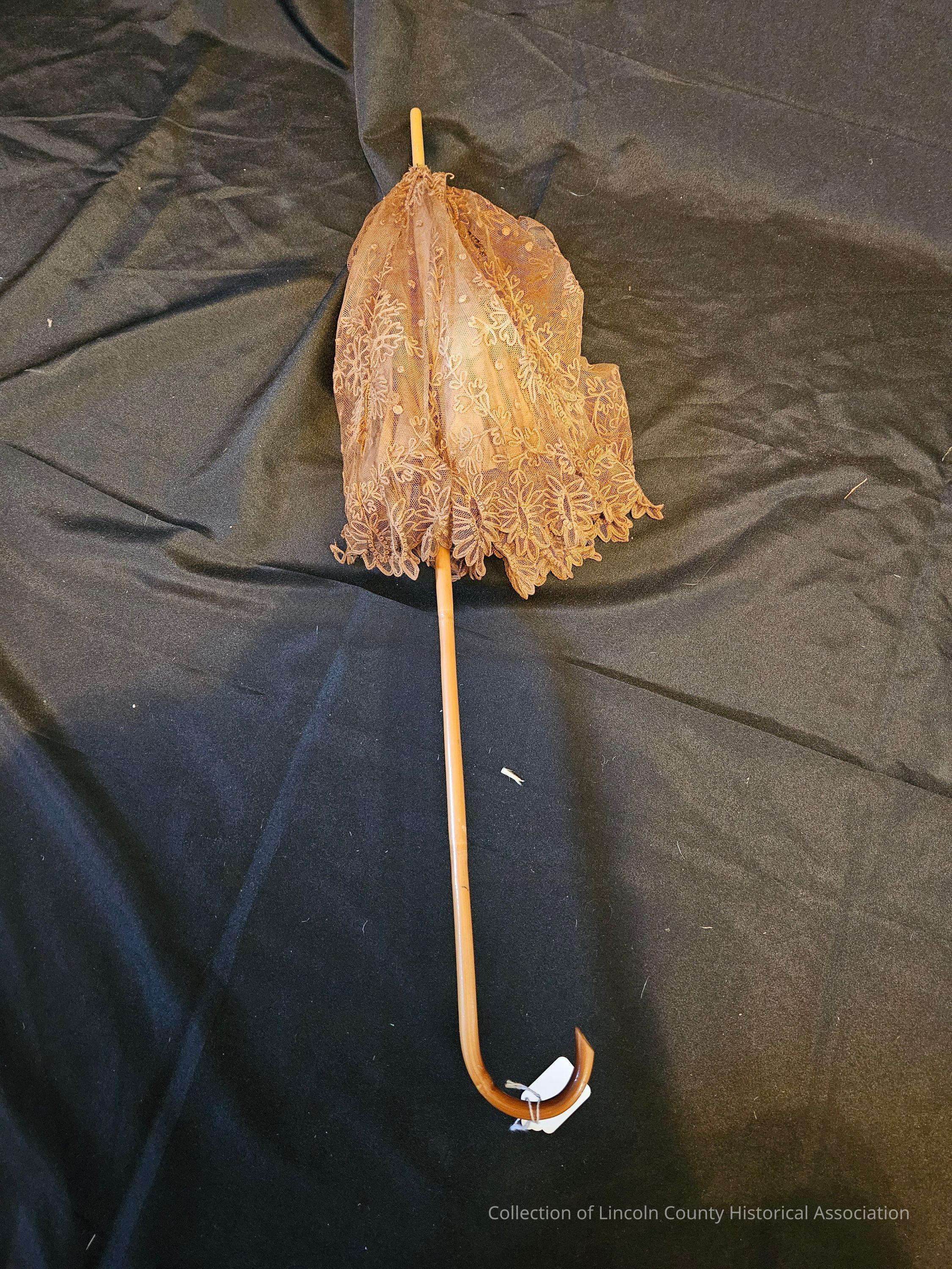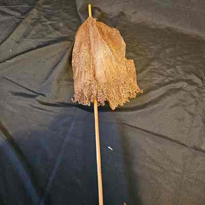 Brown parasol/umbrella with cotton lining covered in floral patterned lace. Scalloped leaf designs around the edges. Brown wooden handle, curved at the end. Metal ribs.Made/Created