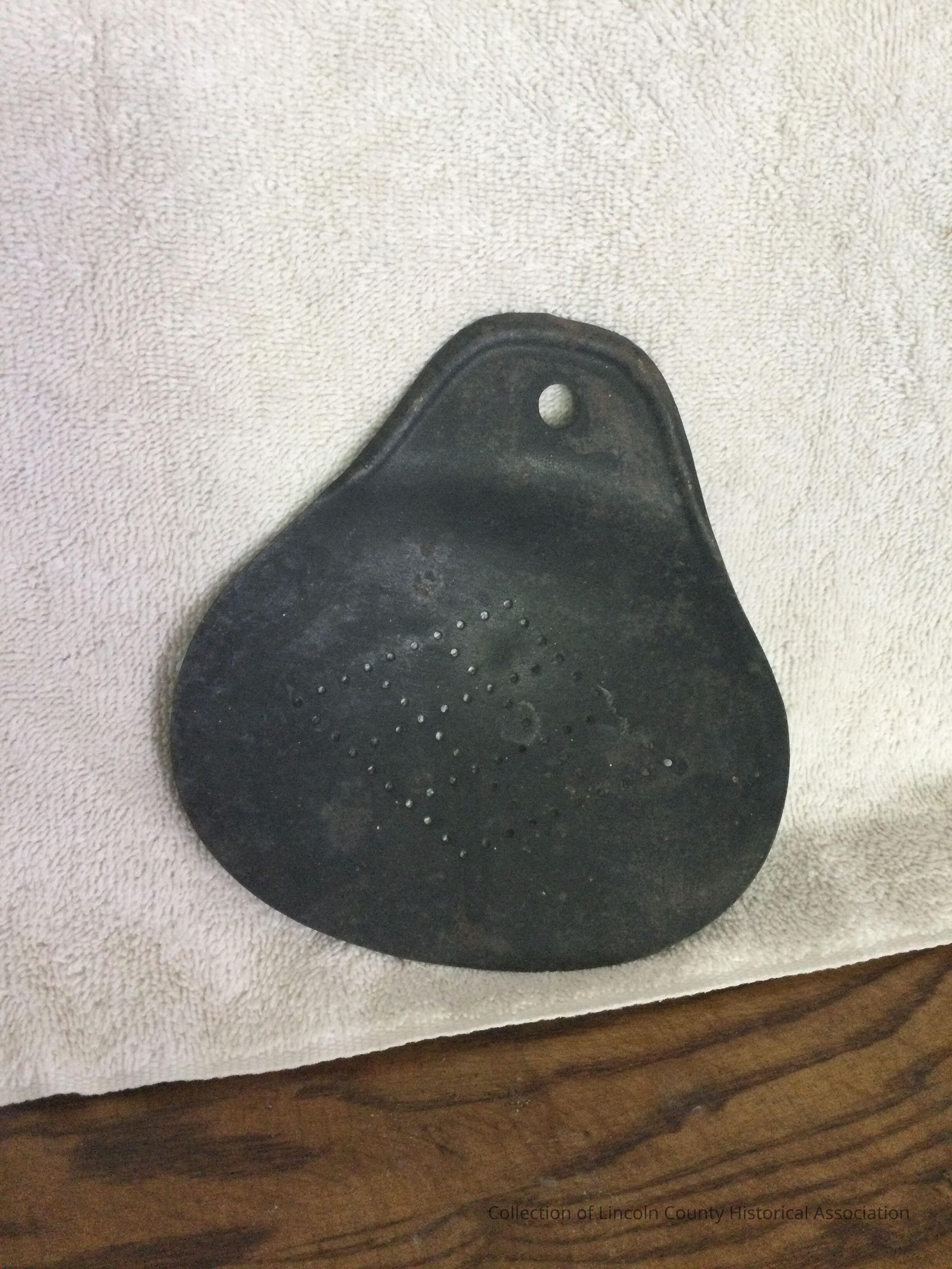 Oval shaped tin skimmer with projecting rounded handle pierced by a hole. Handle has added rim skimmer pierced by holes forming a diaper patternMade/Created