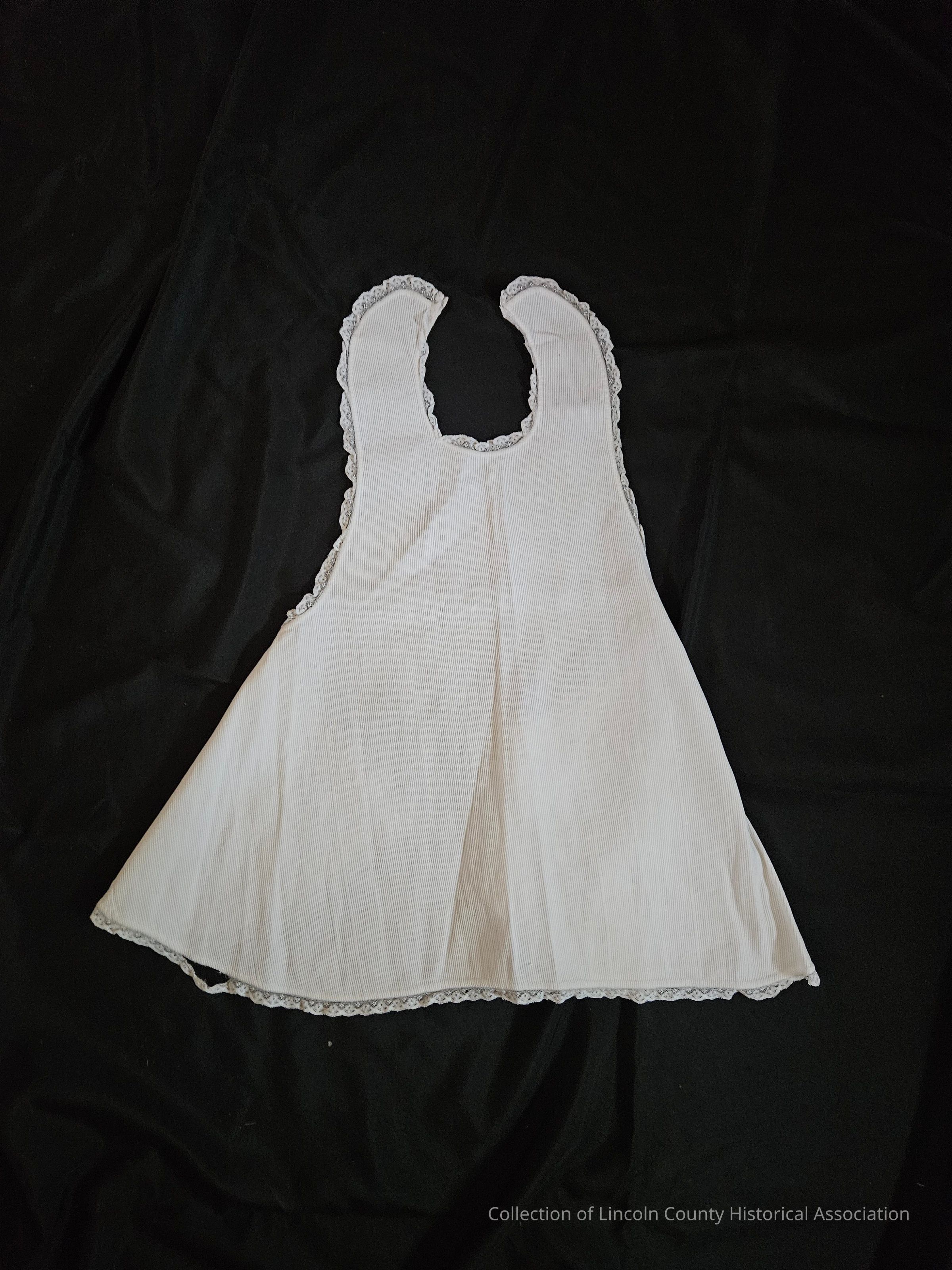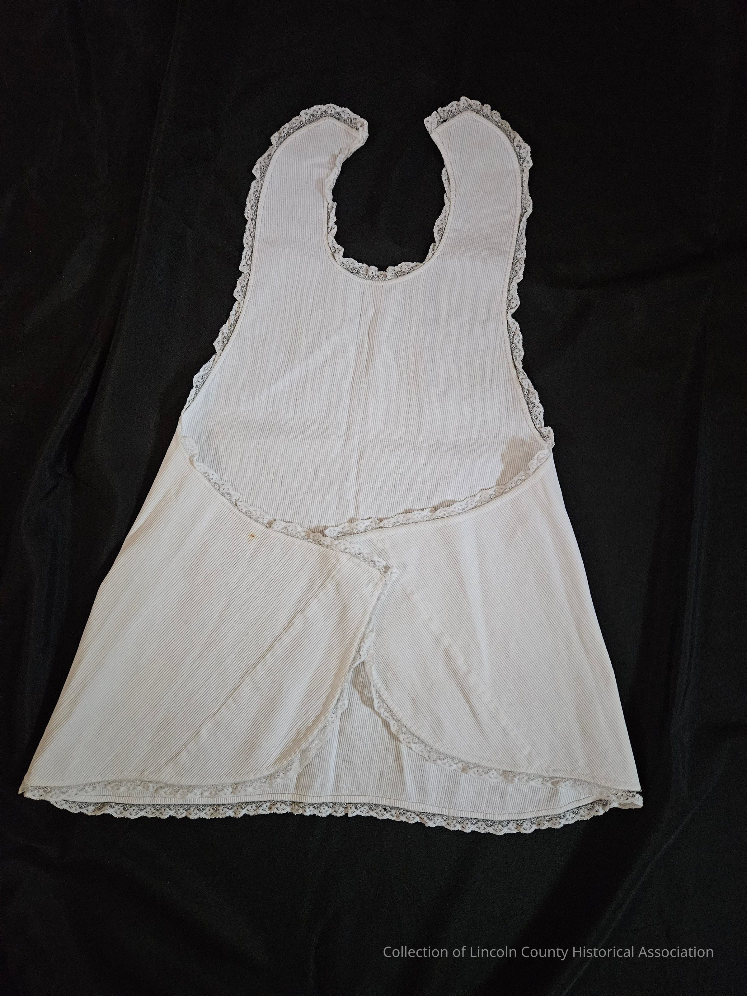 Child's white ribbed pinafore. Lace edging. Pinned on front and tied in the back.Clothing/Dress/Costume Details
