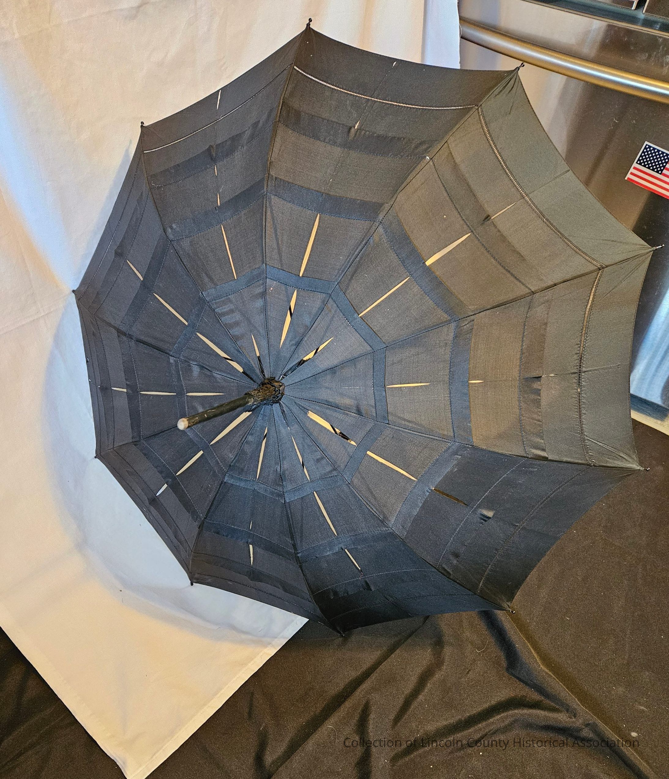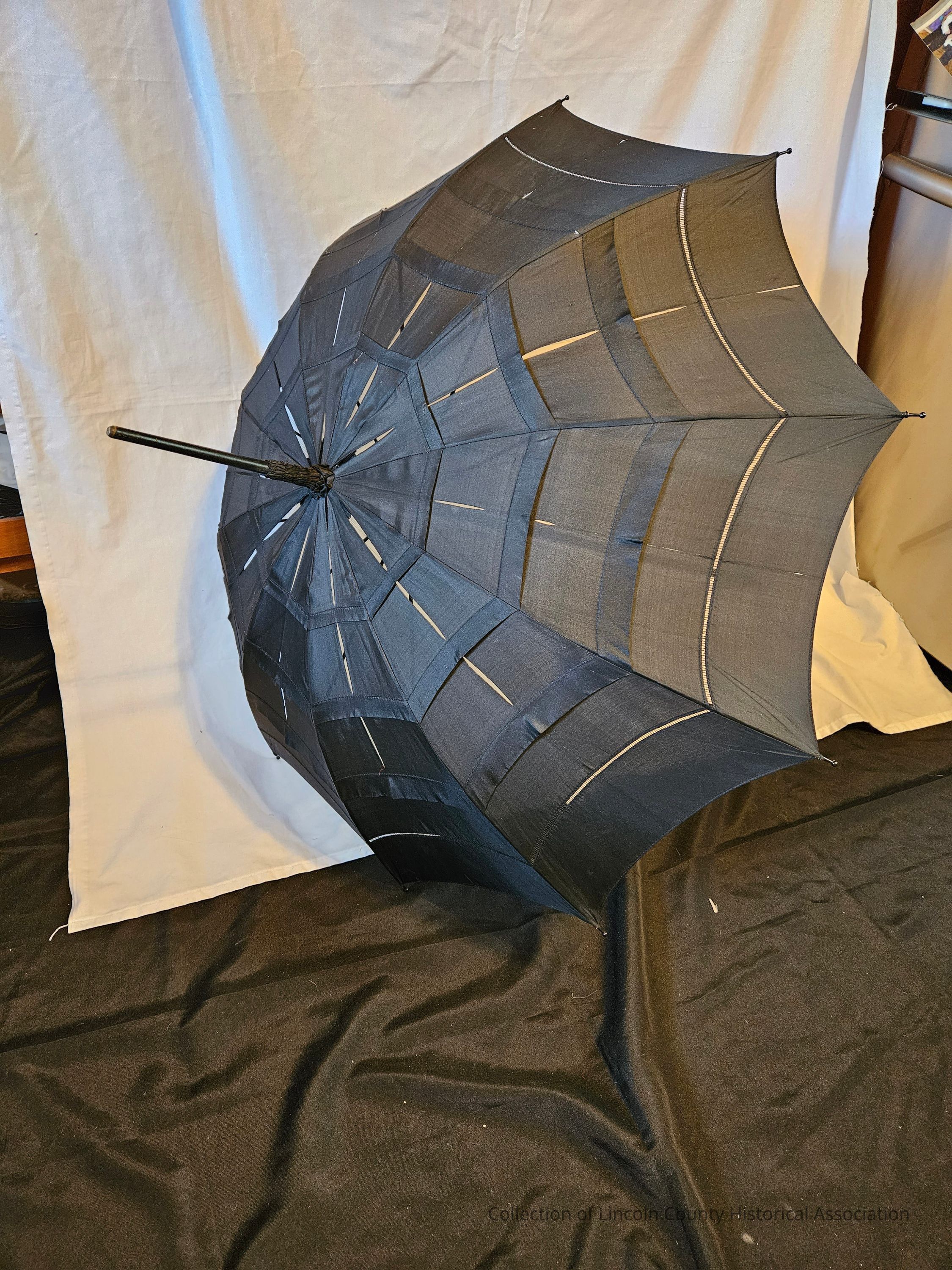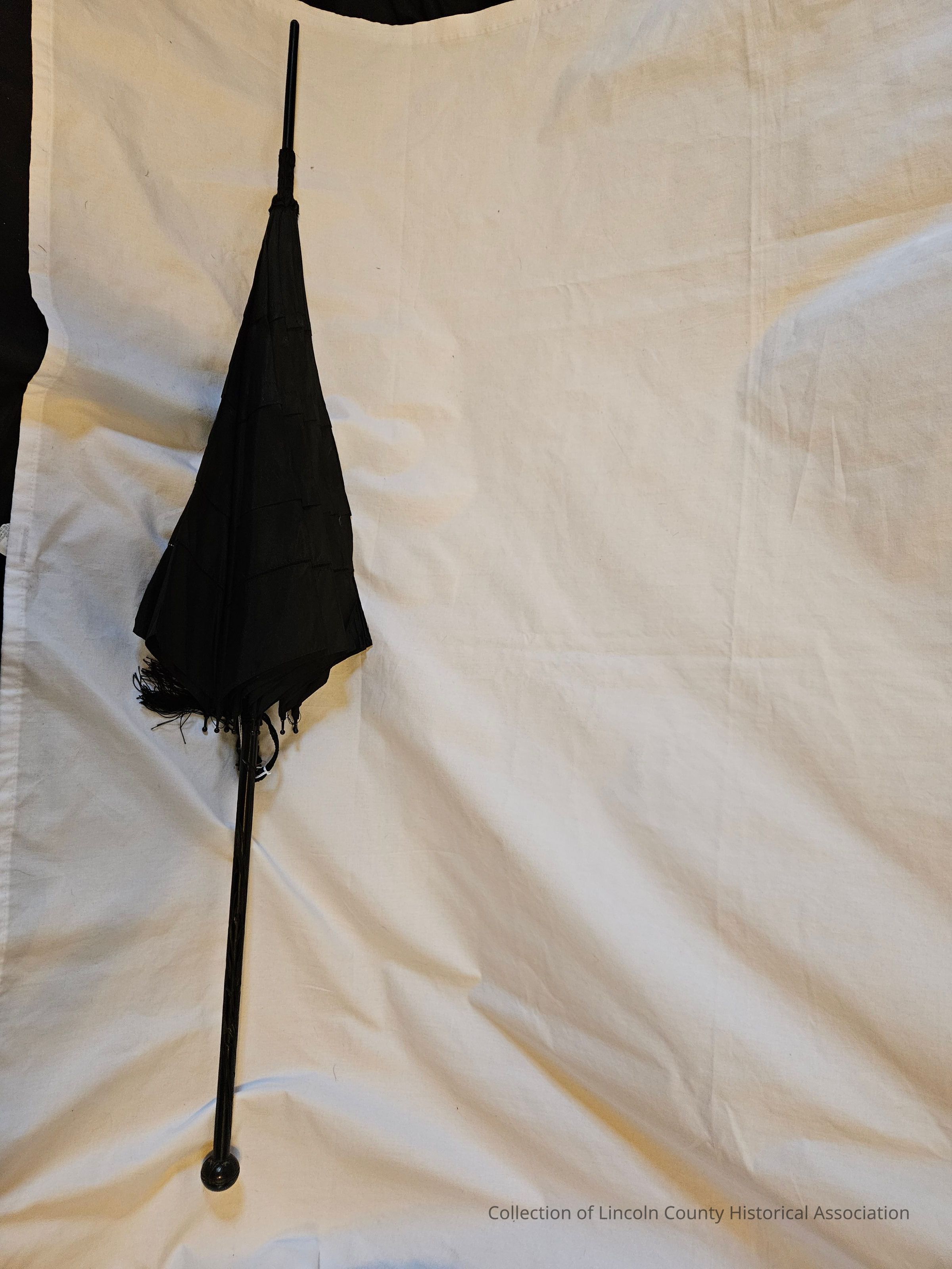 Black cotton parasol/umbrella. Pleated with small lace insert at the bottom of canopy. Metal ribs extend beyond canopy to rounded point. Carved black wooden handle, rounded at the bottom.Made/Created