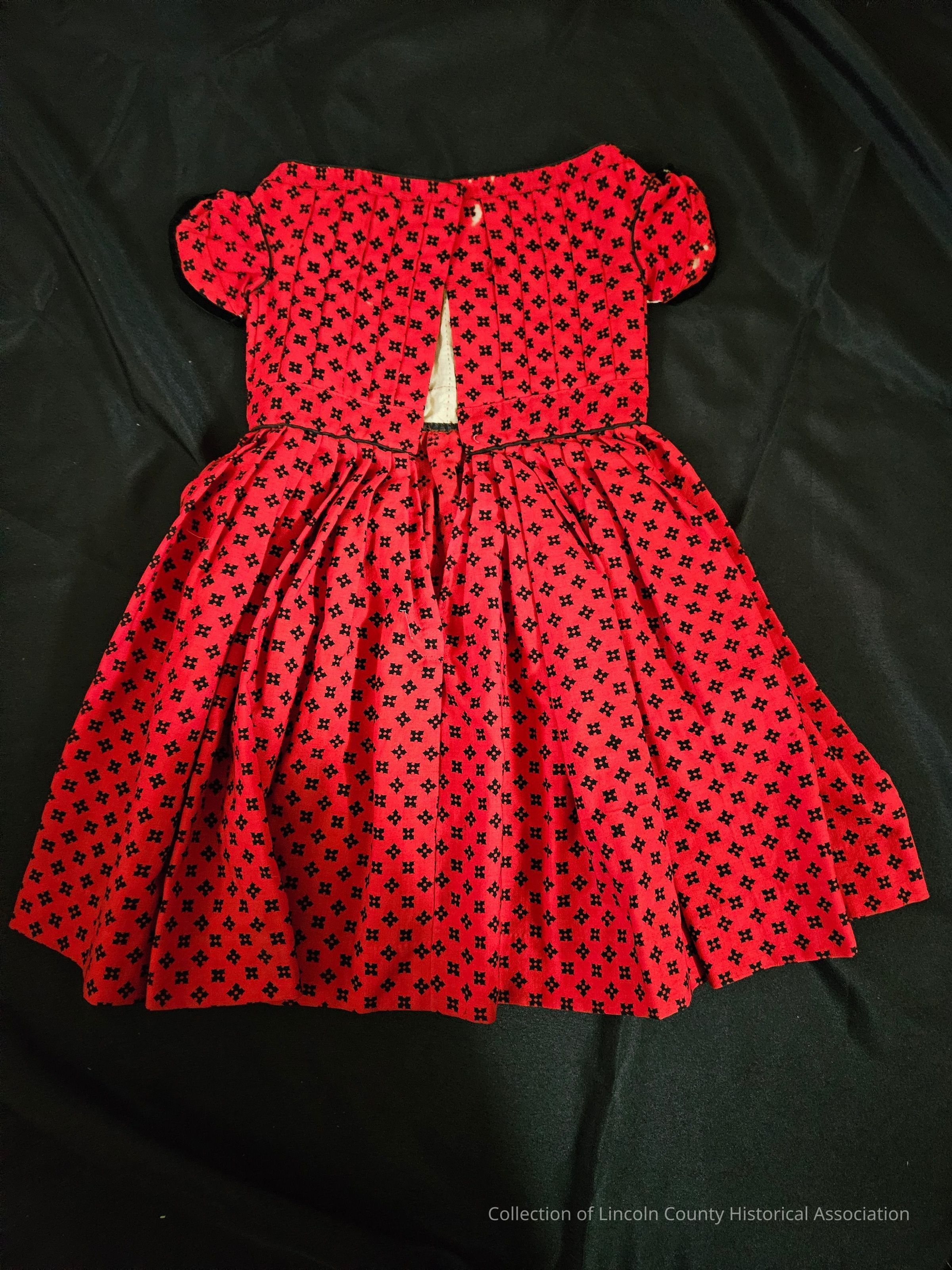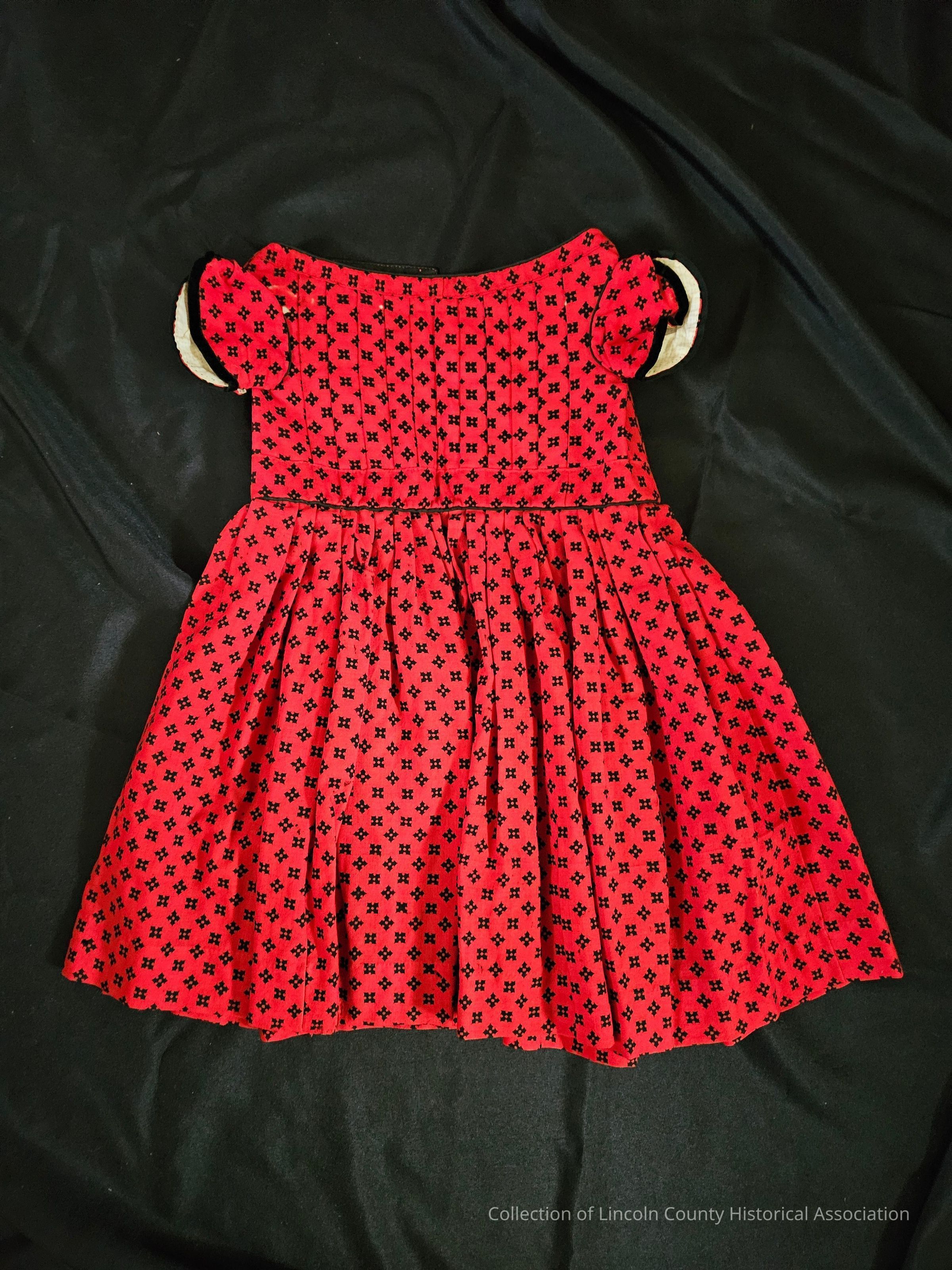 Red child's dress with black floral pattern. Wool challis, sleeves edged in black velvet. Black hemline and collar. Pleated front. Open on top half of back, no closures.Clothing/Dress/Costume Details
