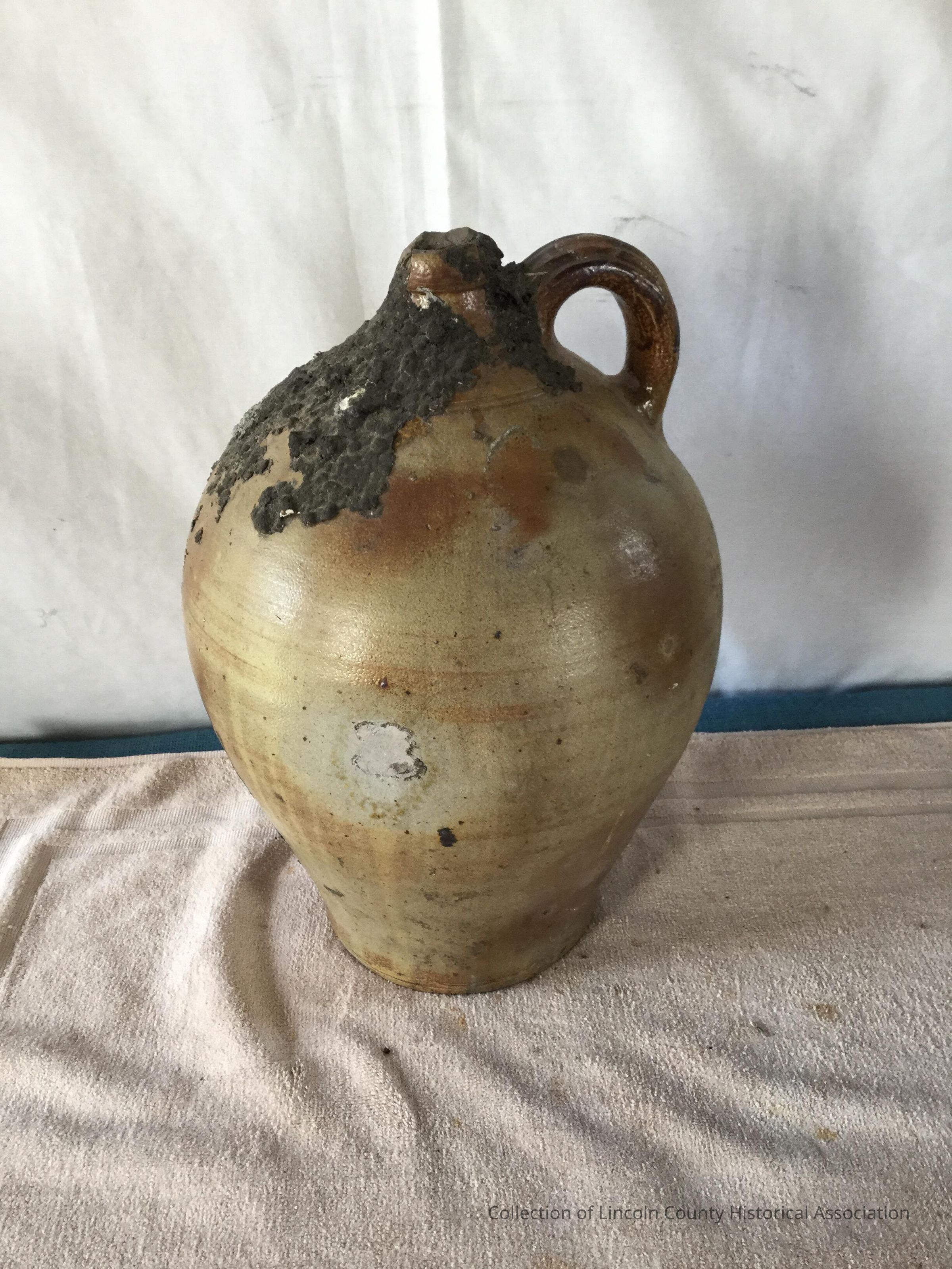 Two gallon stoneware jug with a single loop handle. With a gray glazeMade/Created