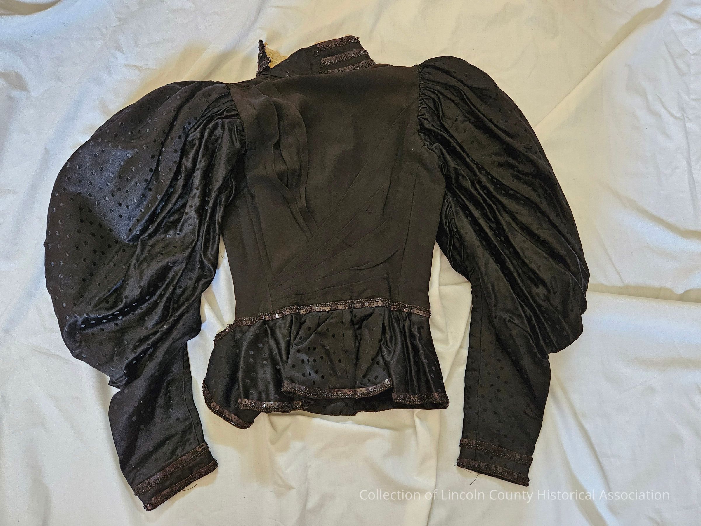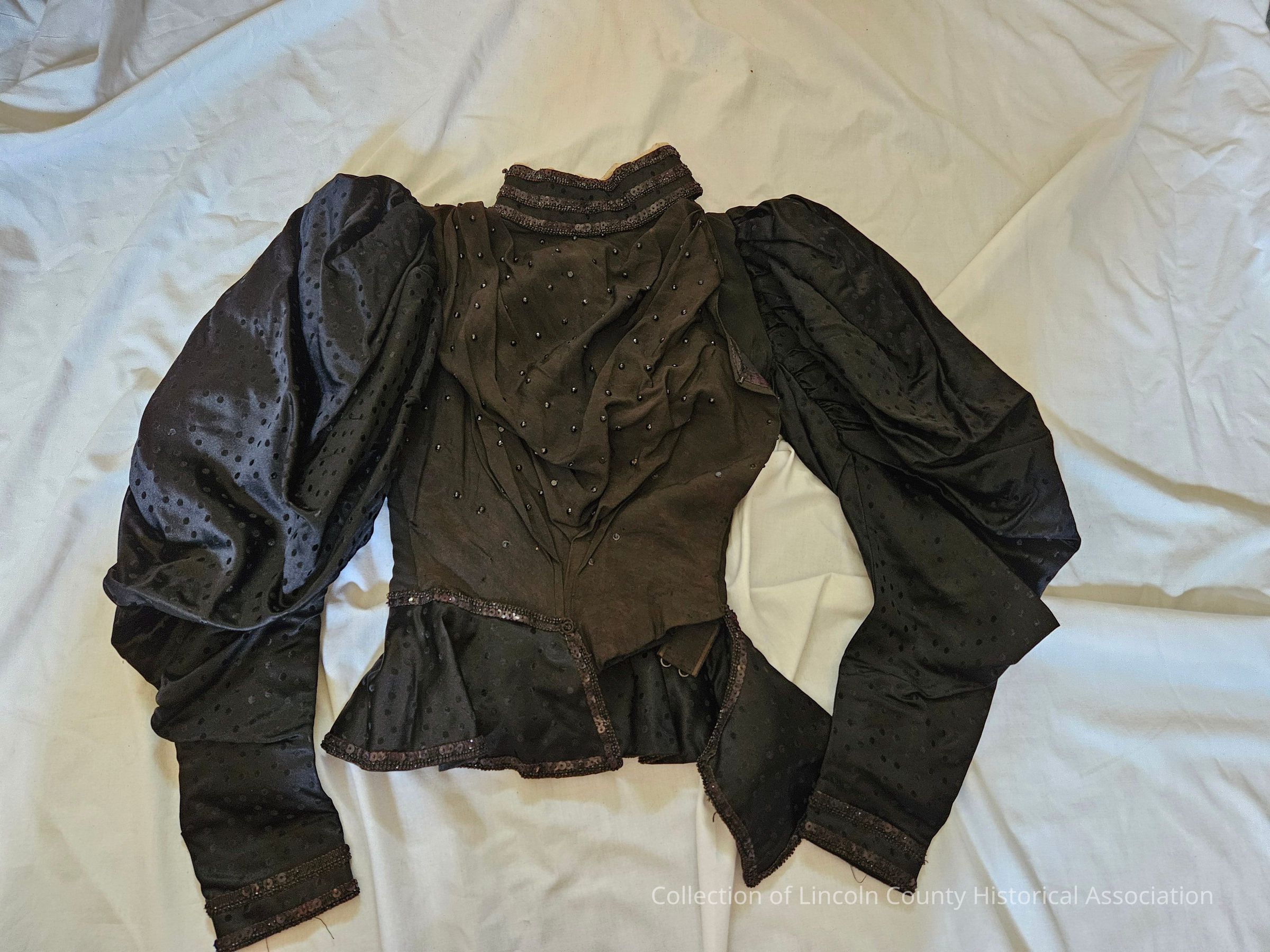 Black silk bodice covered with black dots. Front of bodice is gauzy black silk/crepe with black sequins. Black beadwork and sequin trim at cuffs, collar, and waist. Black silk belt at inside waist. Pleated back. White mesh collar. Black silk lining with boned stays. Large hook closures.Clothing/Dress/Costume Details