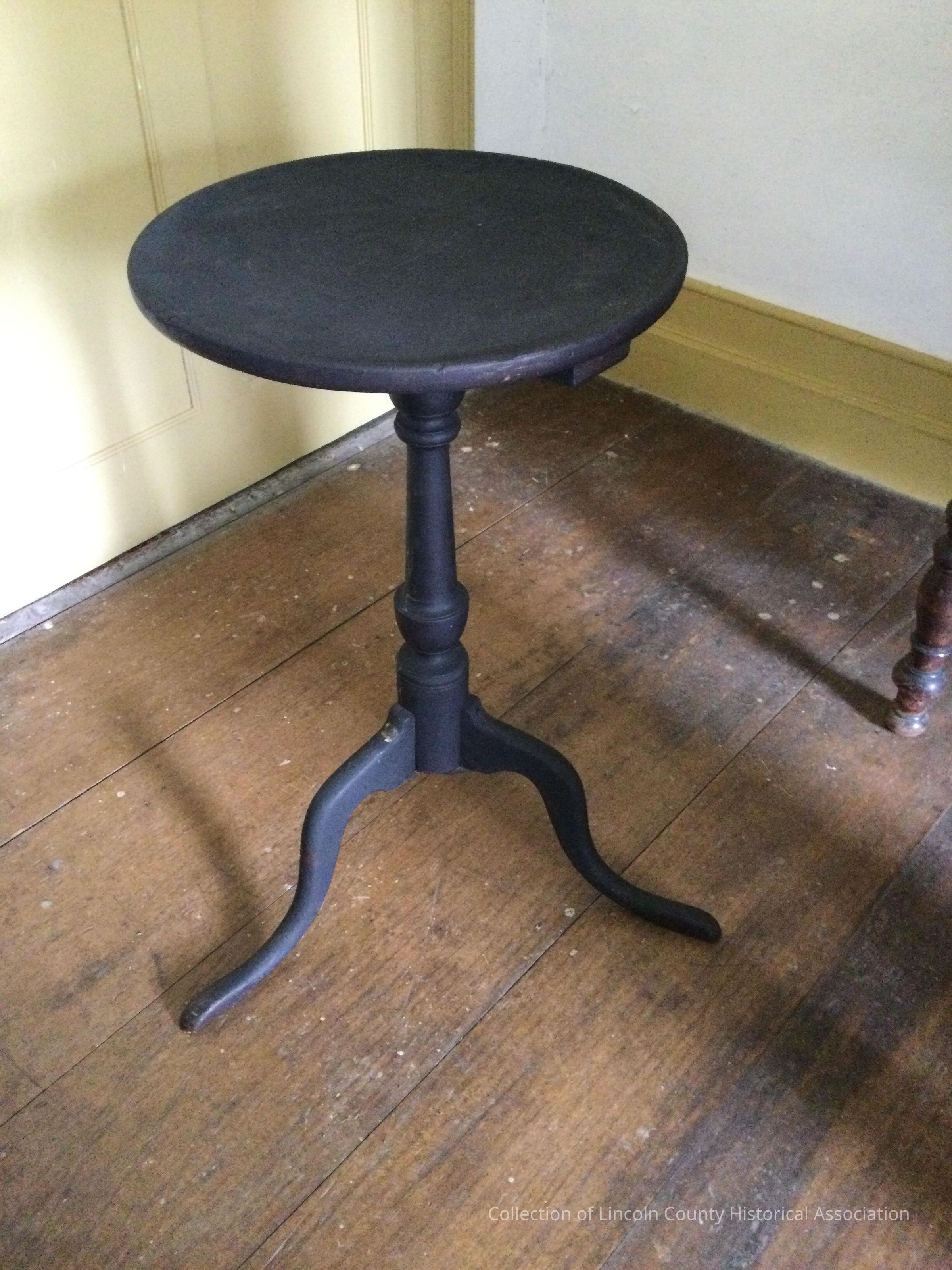 The shank has been broken and repaired multiple times. The three legs have broken away from the shank. Bottom of shank has metal plates also fastened on to the underside of the legs. The top is supported by a massive batten and is nailed and screwed onto the batten.