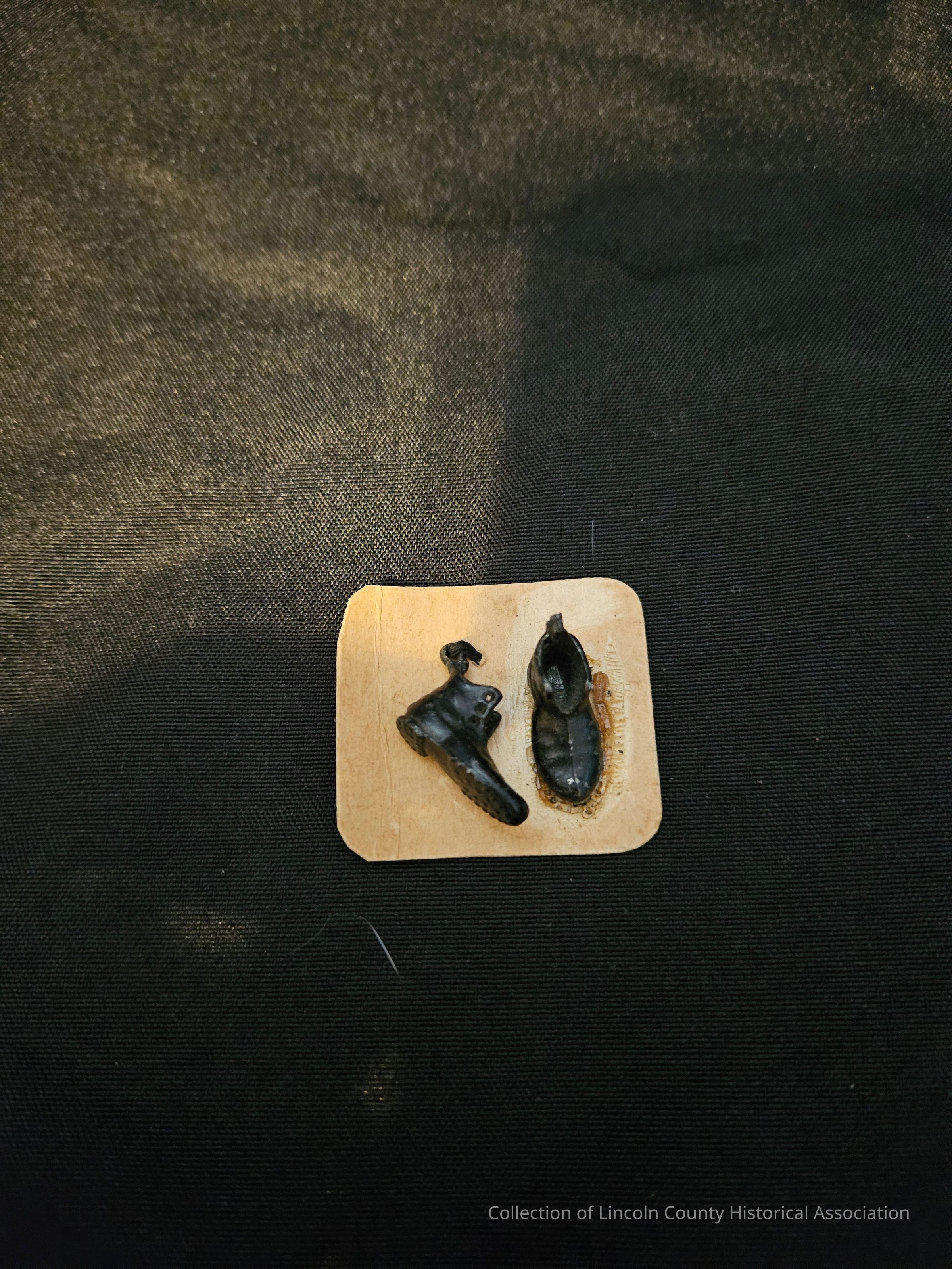 Pair of lead doll shoes. Shoes attached to small piece of paper. Shoes all black and ankle height, open in the front of the ankle. Have boot straps and hob nails visible on toes.Made/Created