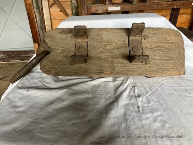 Wagon break (also known as a ruggle or a drag shoe). Made of spruce with a pair of wrought iron cleats and with an iron shoe bolted to the underside of the broad wooden part constituting the base.