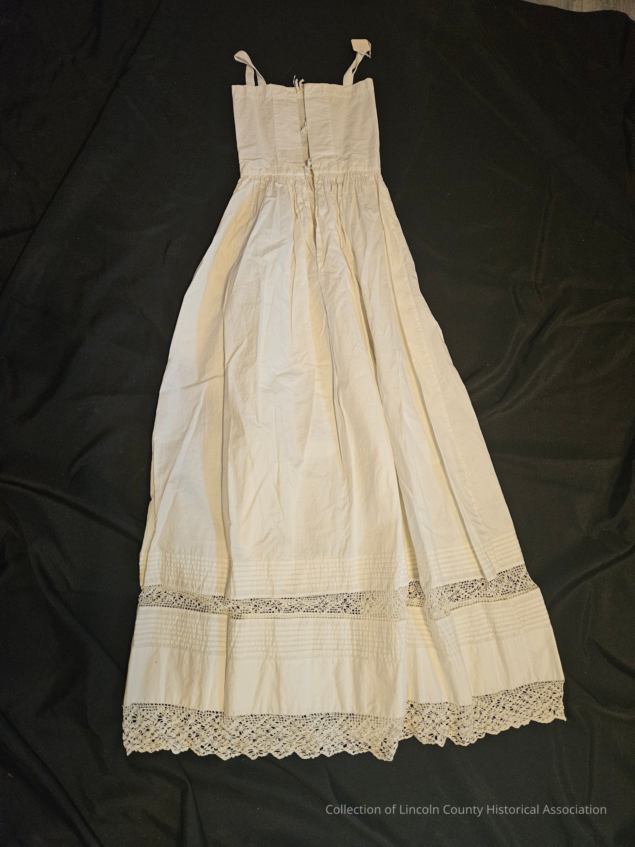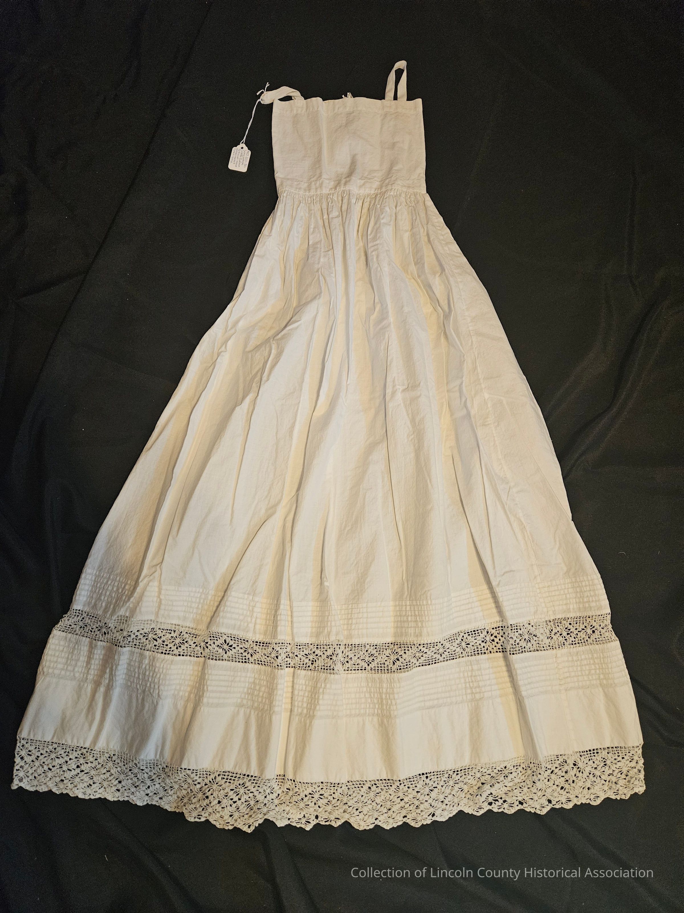 Long white infant petticoat. Cotton with hand embroidered inset and edge. Pleats at bottom of skirt. Three tie closures at back.Clothing/Dress/Costume Details