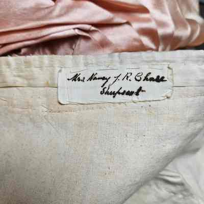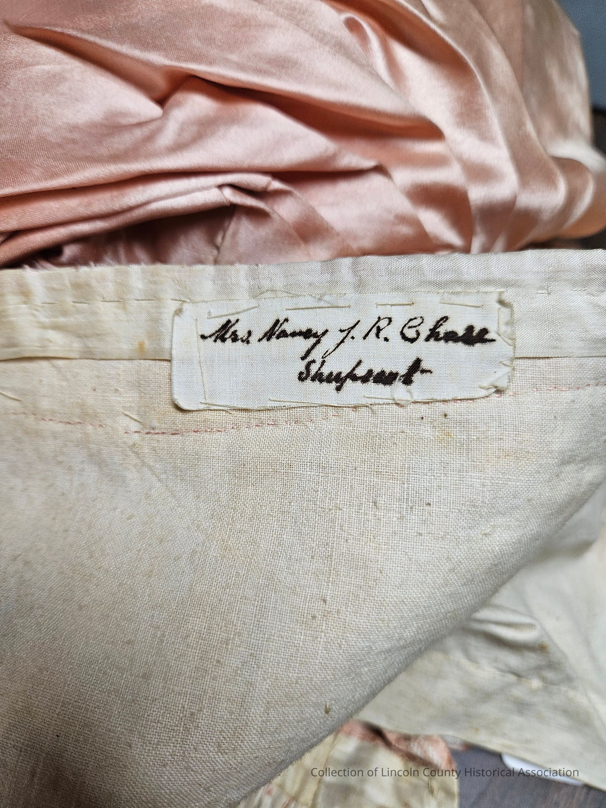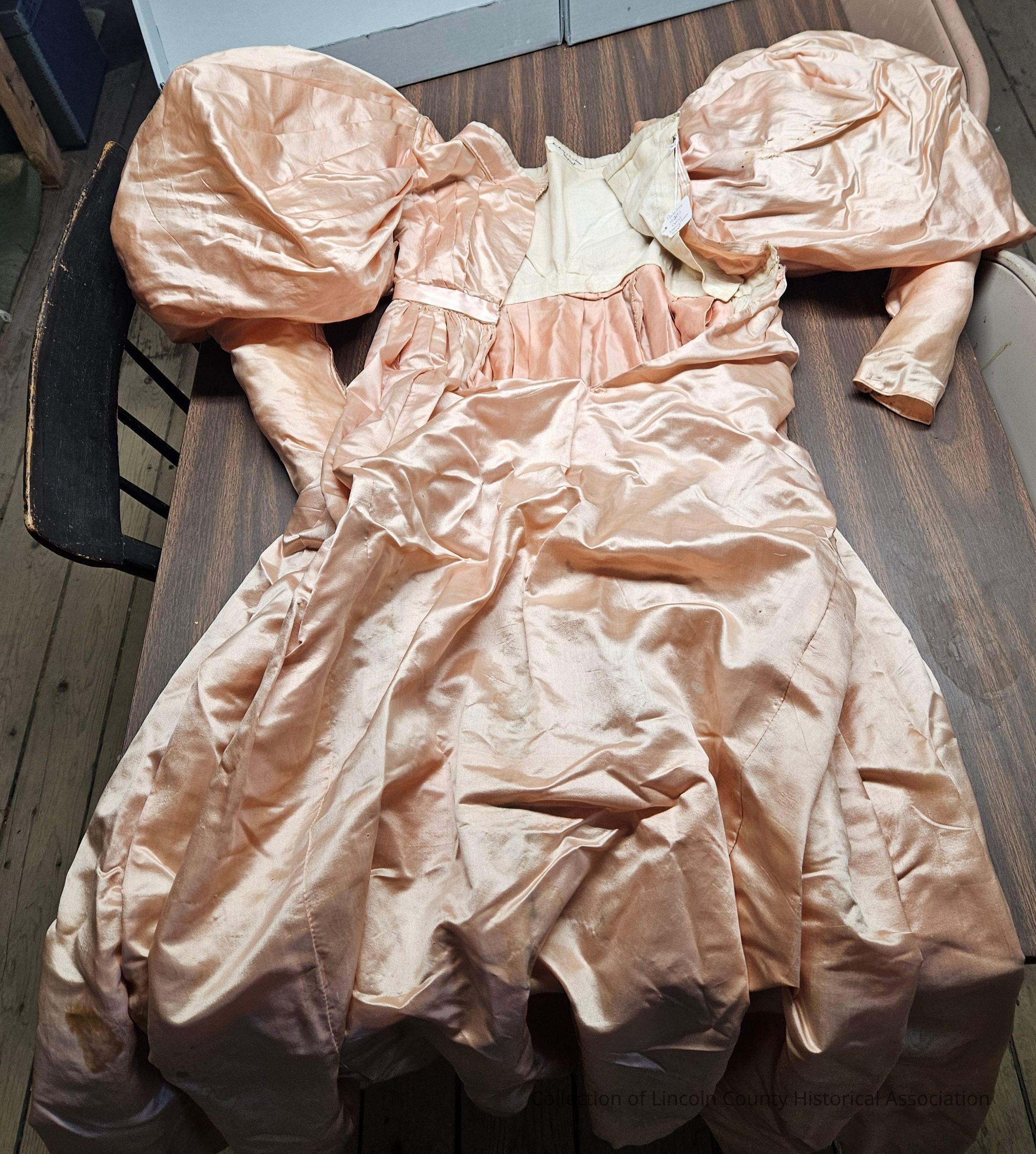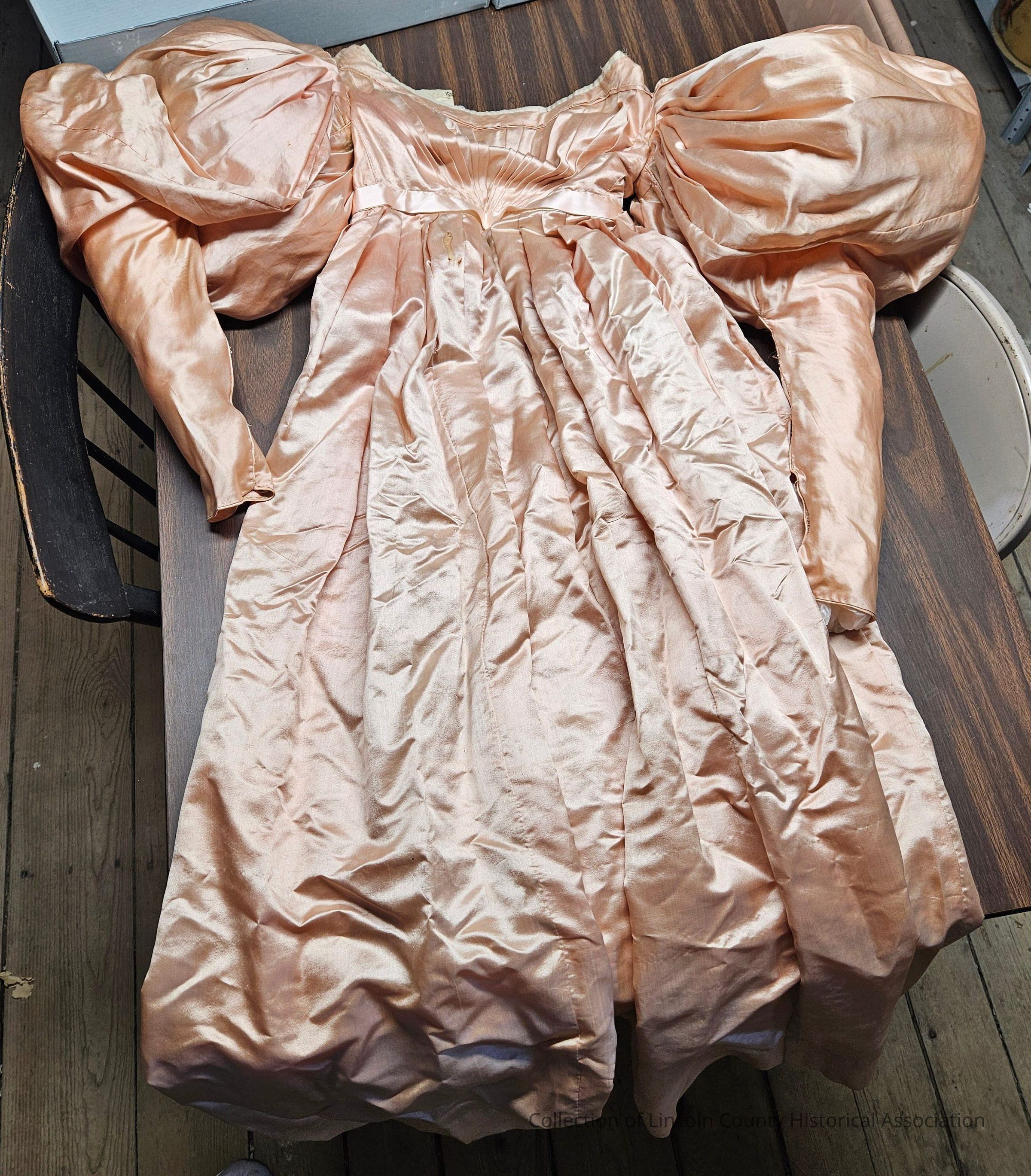 Pink silk ball gown belonging to Nancy Chase Smith. She wore this dress to a party around 1840 and as it was considered scandalous for baring her shoulders, she was banned from attending church by the local deacon. Balloon sleeves and empire waist. Hand stitched.Clothing/Dress/Costume Details
