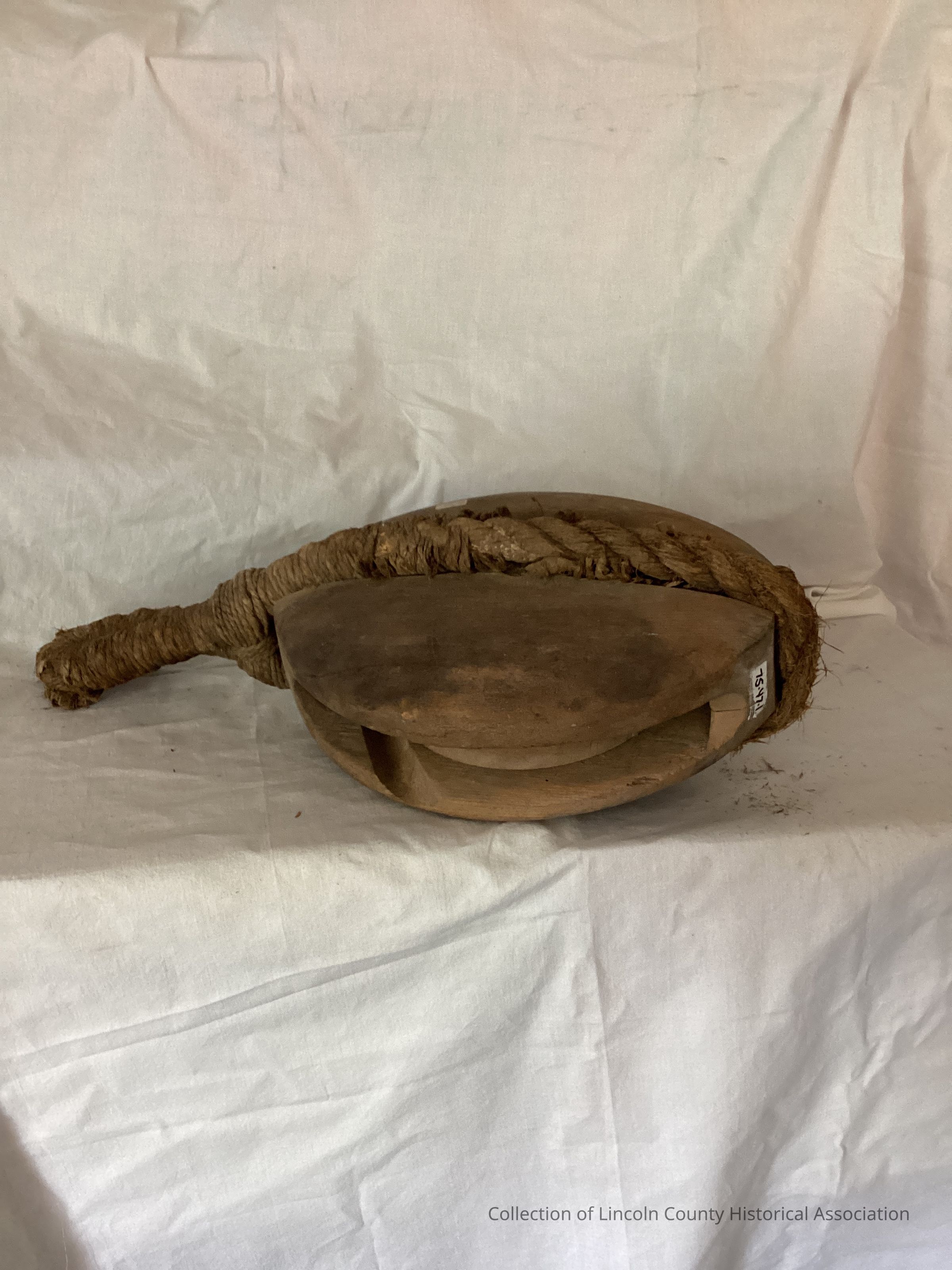 Wooden ship's pulley with one wheel. Hemp fiber sheathing rope around pulley's outer case on its long axis and which terminates in a loop.