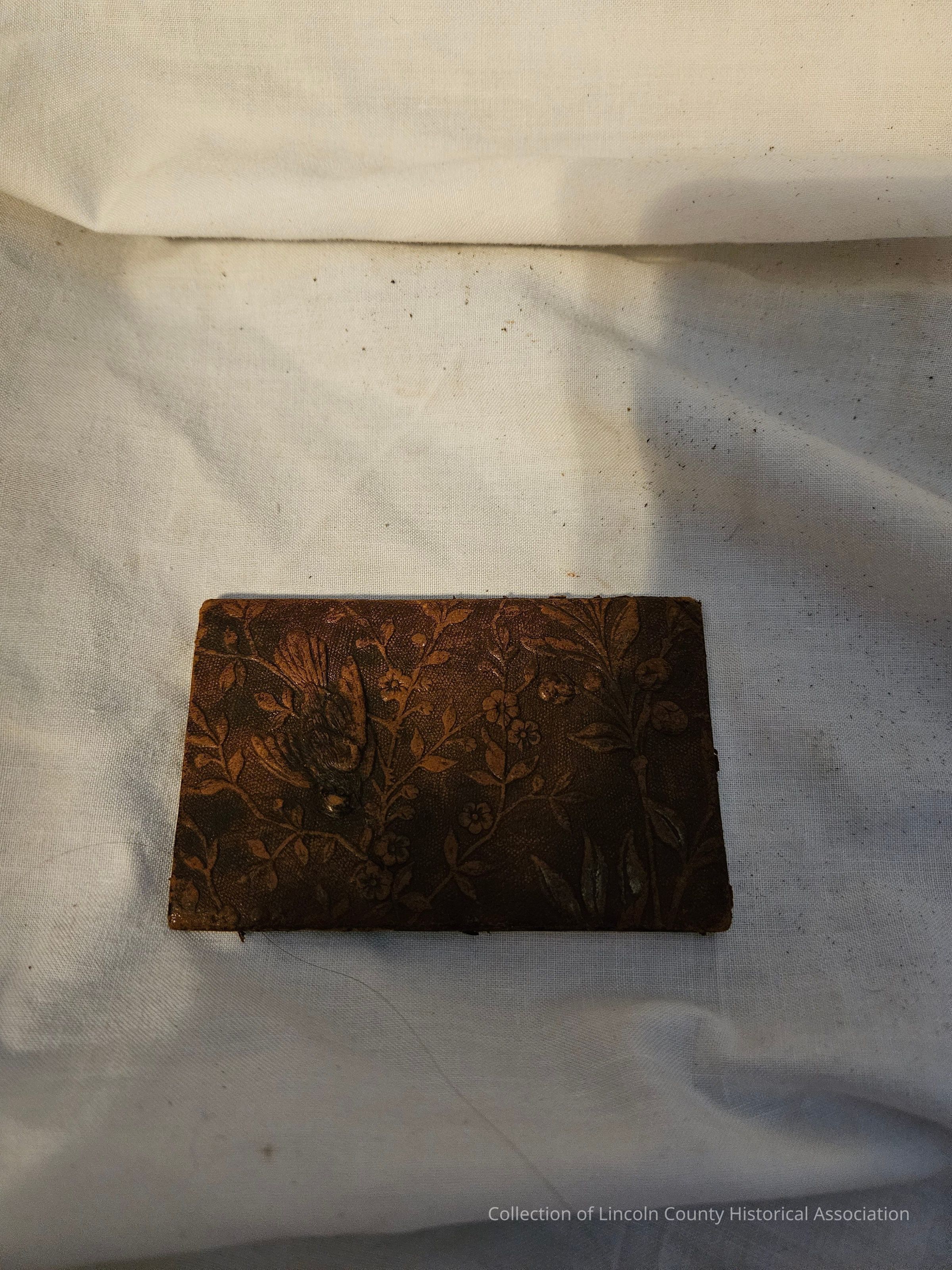 Leather card case. Embossed on both sides with birds, leaves, and flowers. Brown leather.Made/Created