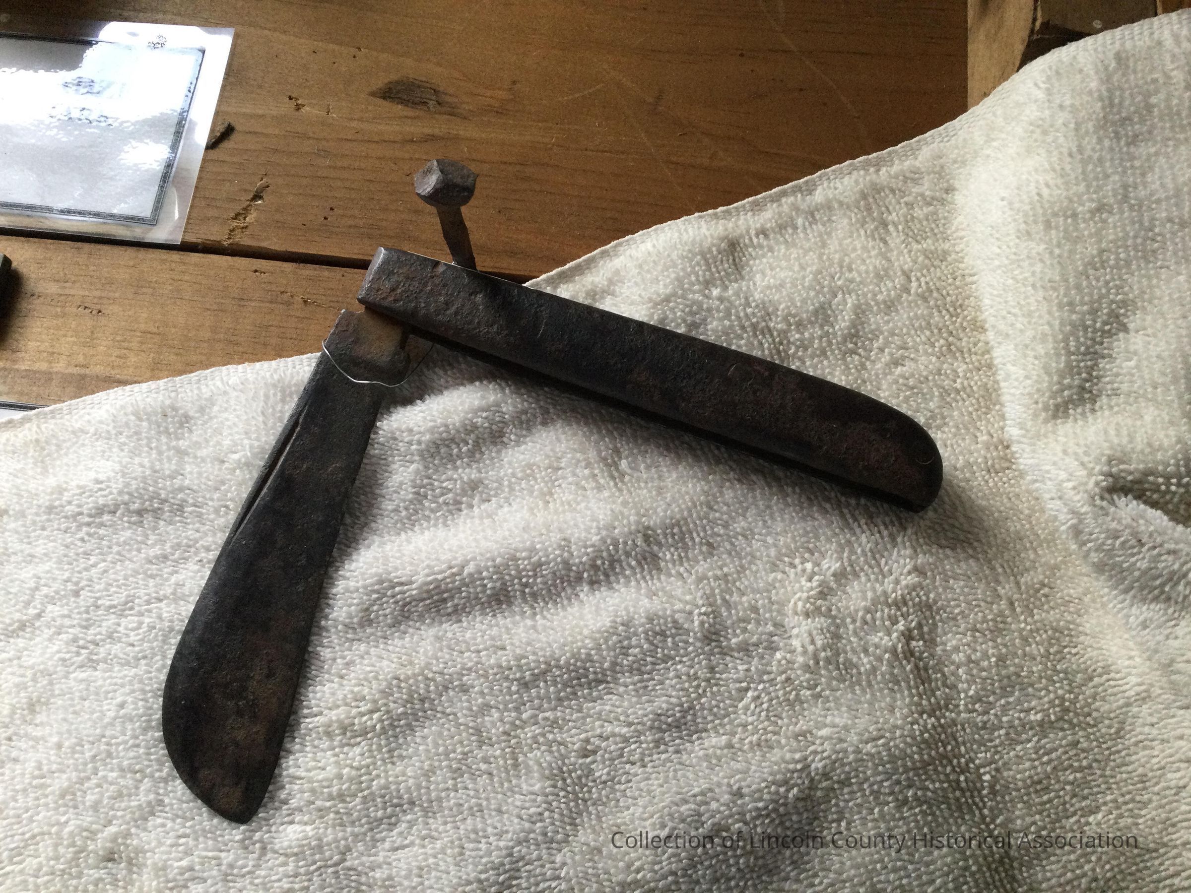 Cast iron pocket knife hinged to a wooden handle.Made/Created