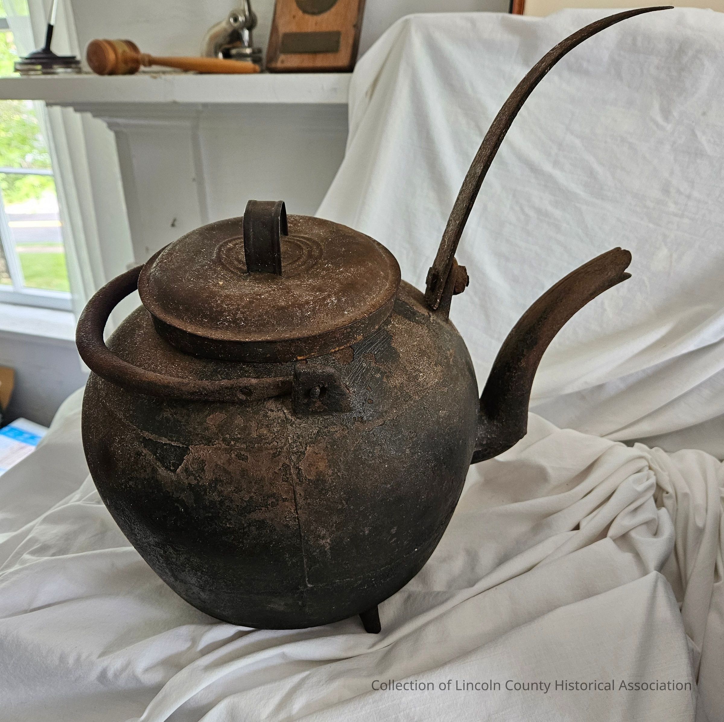 Cast iron tilting kettle. 3 legs and a handle. Multipiece casting. Tin lid that may not be original.