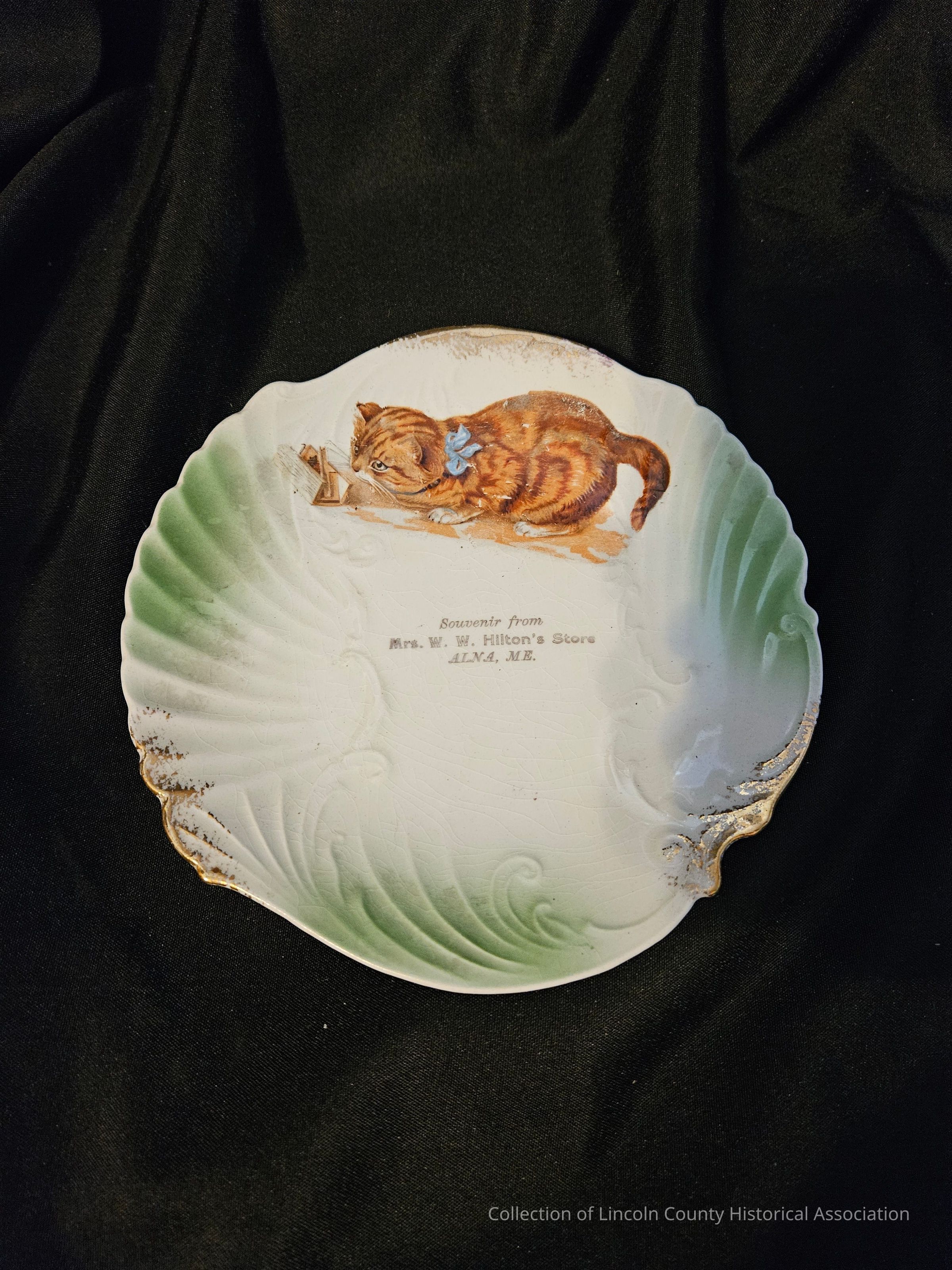 China souvenir plate. Green around edges with seashell like shape and design. Image of cat looking at a mouse trap at top. Plate was from Mrs. W.W. Hilton's Store in Alna.Made/Created