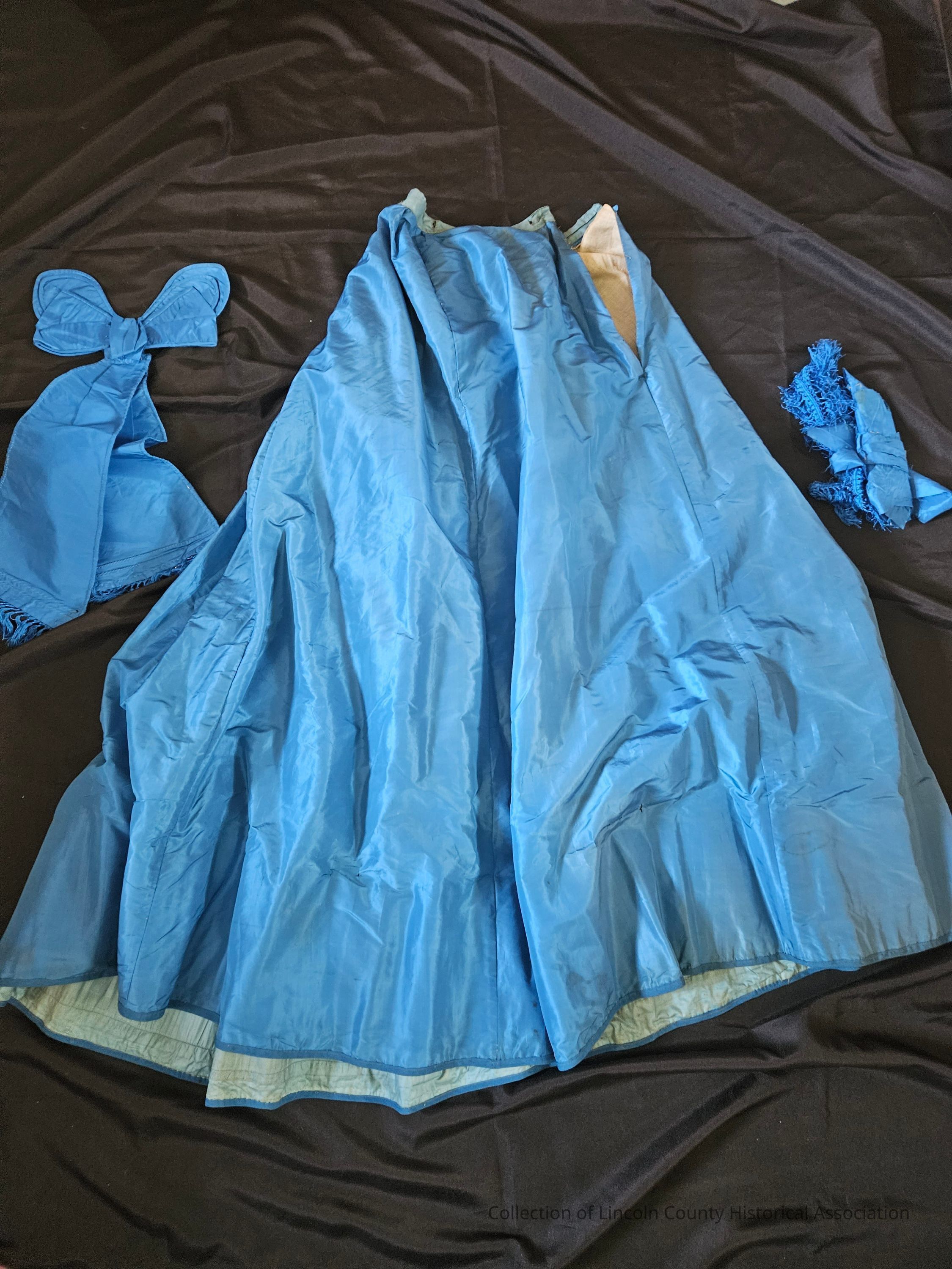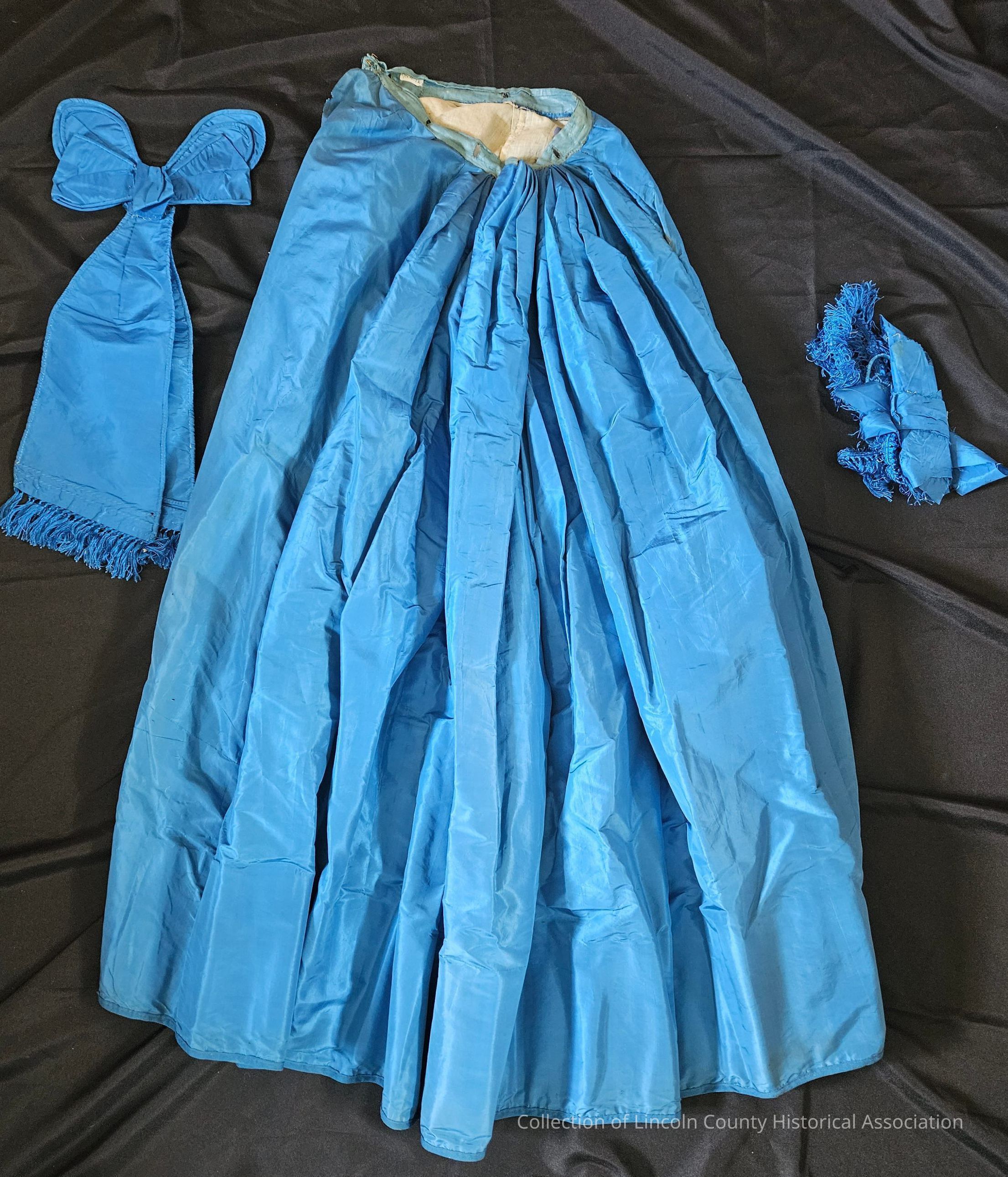 Blue taffeta dress skirt with separate bow and extra fabric and fringe. Bustle and button holes in waist. Bow has fringe on the bottom. Machine stitched.