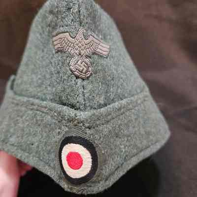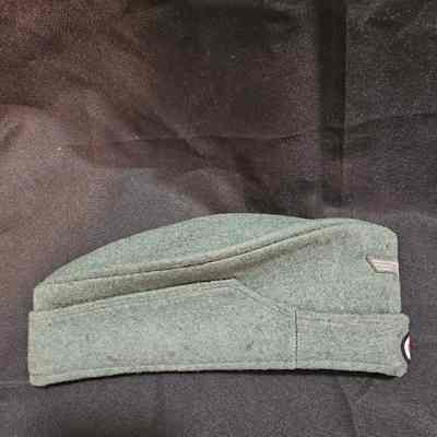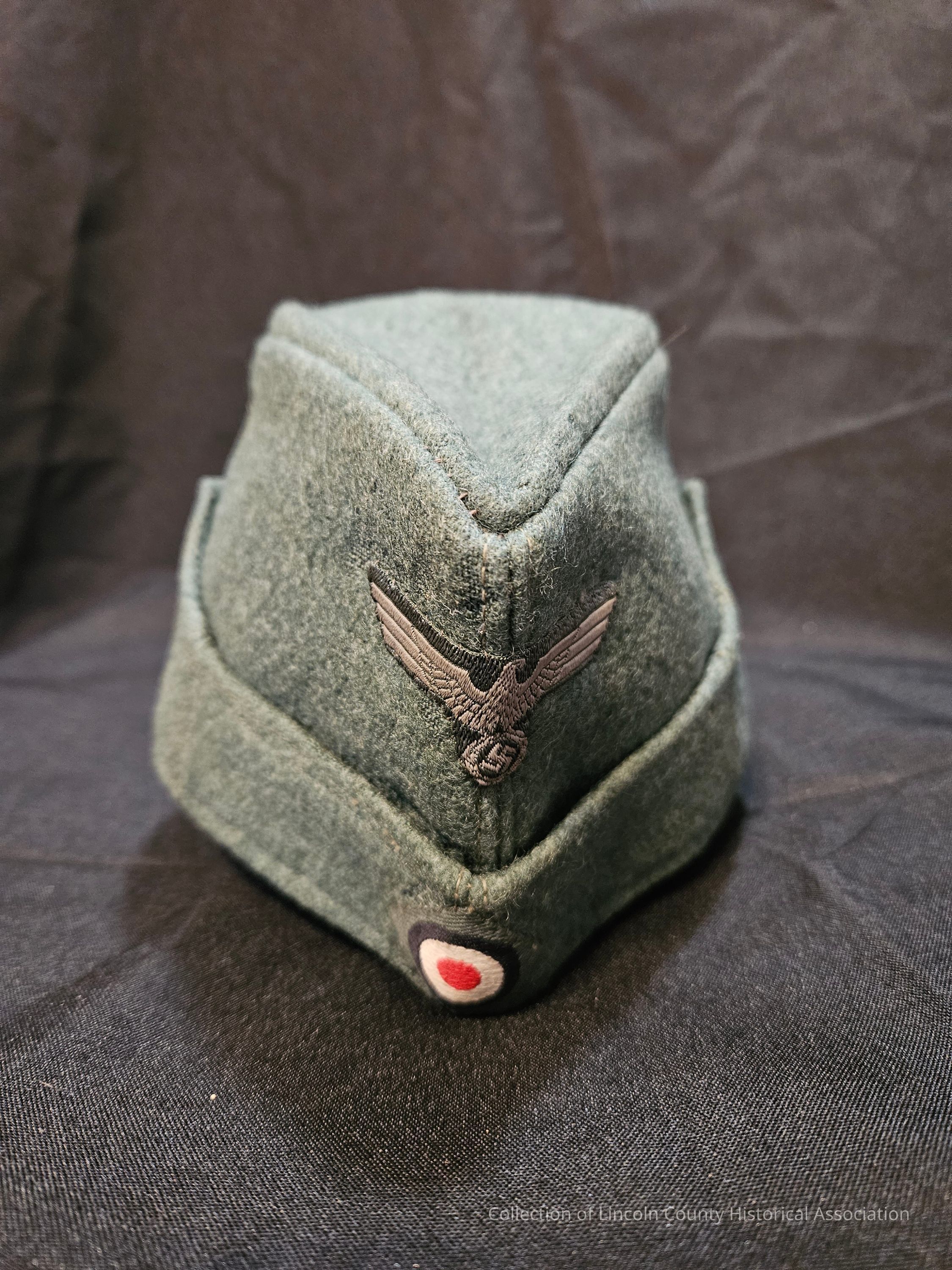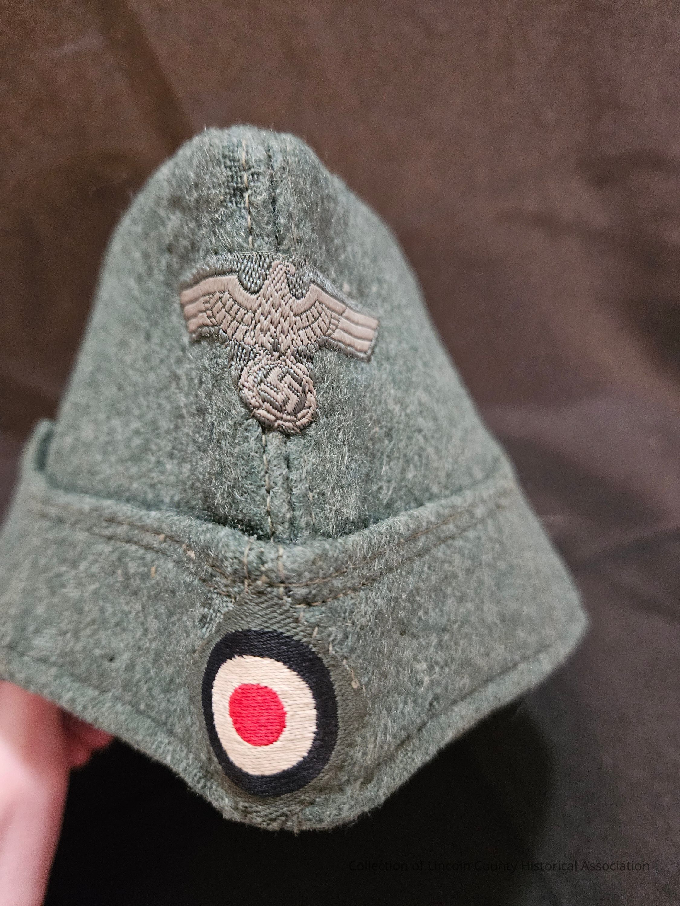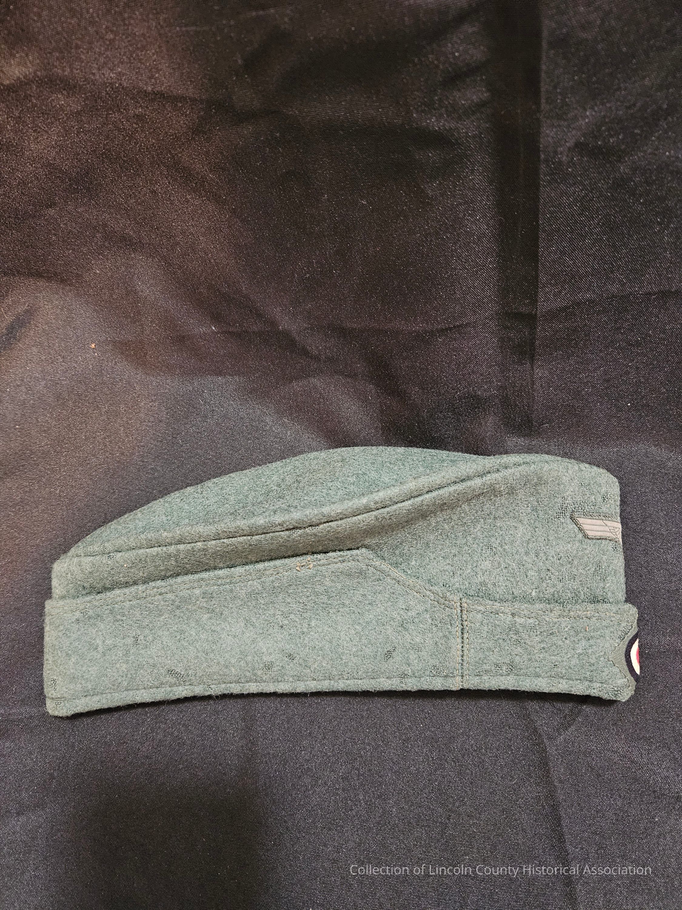 Green German World War II army cap. Front of the cap has German eagle insignia with swastika and German cockade patch. Cap was originally produced by the Dutch for their military. When the Germans invaded they repurposed the cap for their own uses, adding the patches on the front. Hat was likely brought home from Europe by Daniel S. Pratt, who was a Staff Sergeant in the 9th Infantry Division during World War II.Clothing/Dress/Costume Details