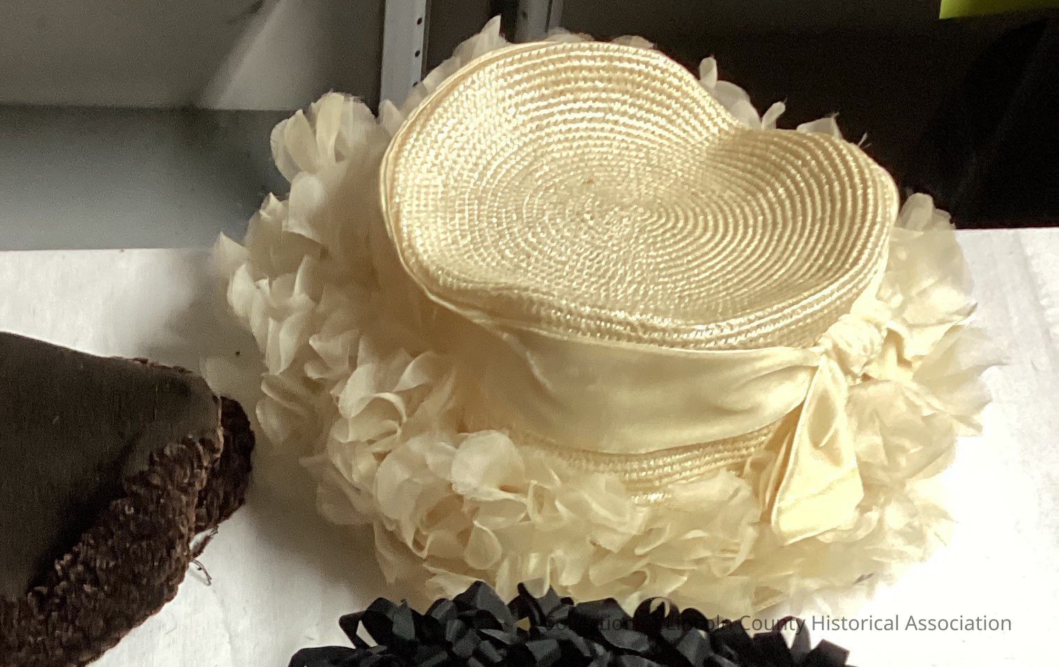 White straw hat with white ribbon. Ruffled fabric around rim.Clothing/Dress/Costume Details