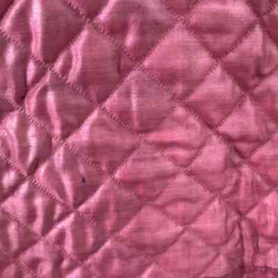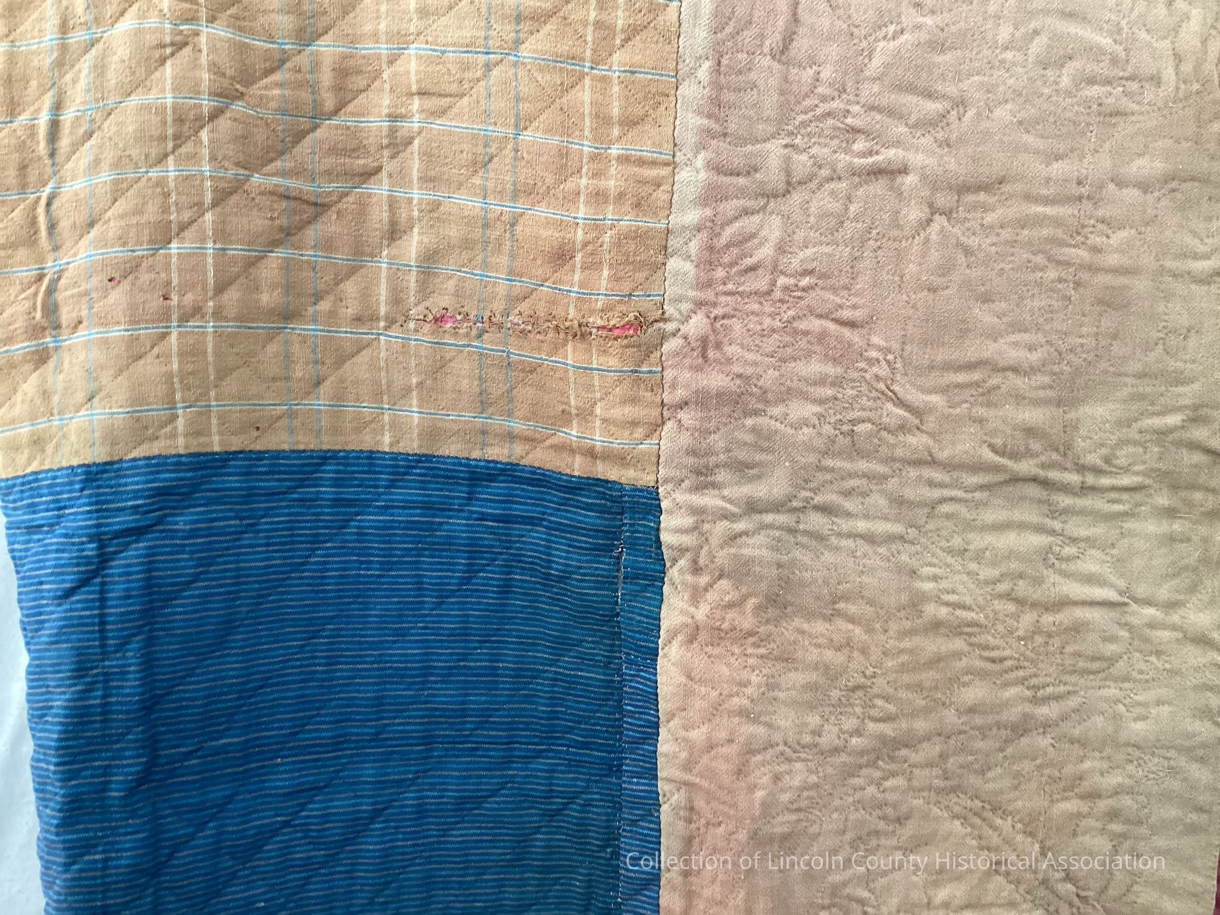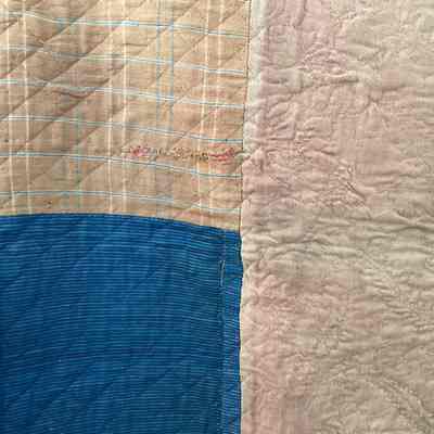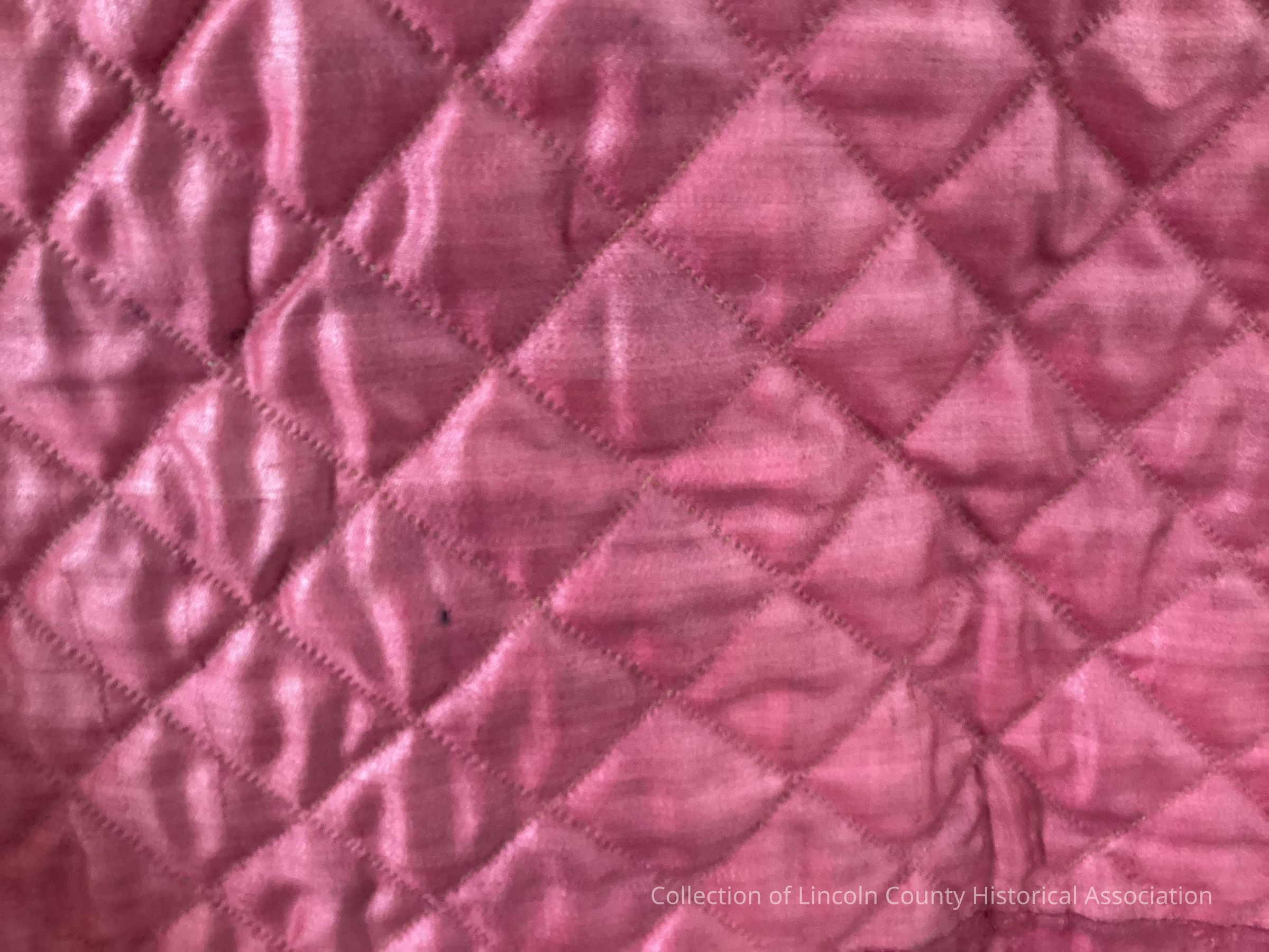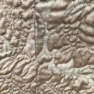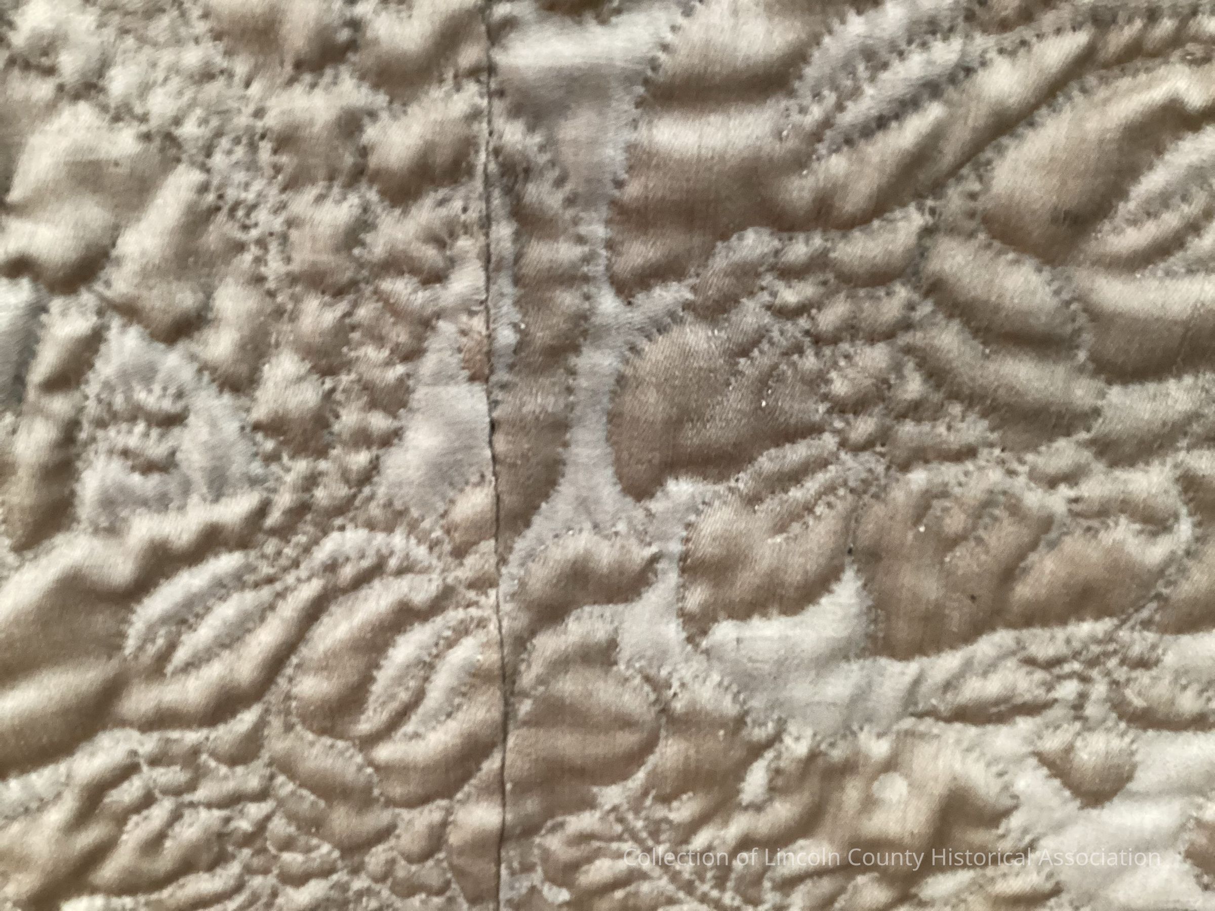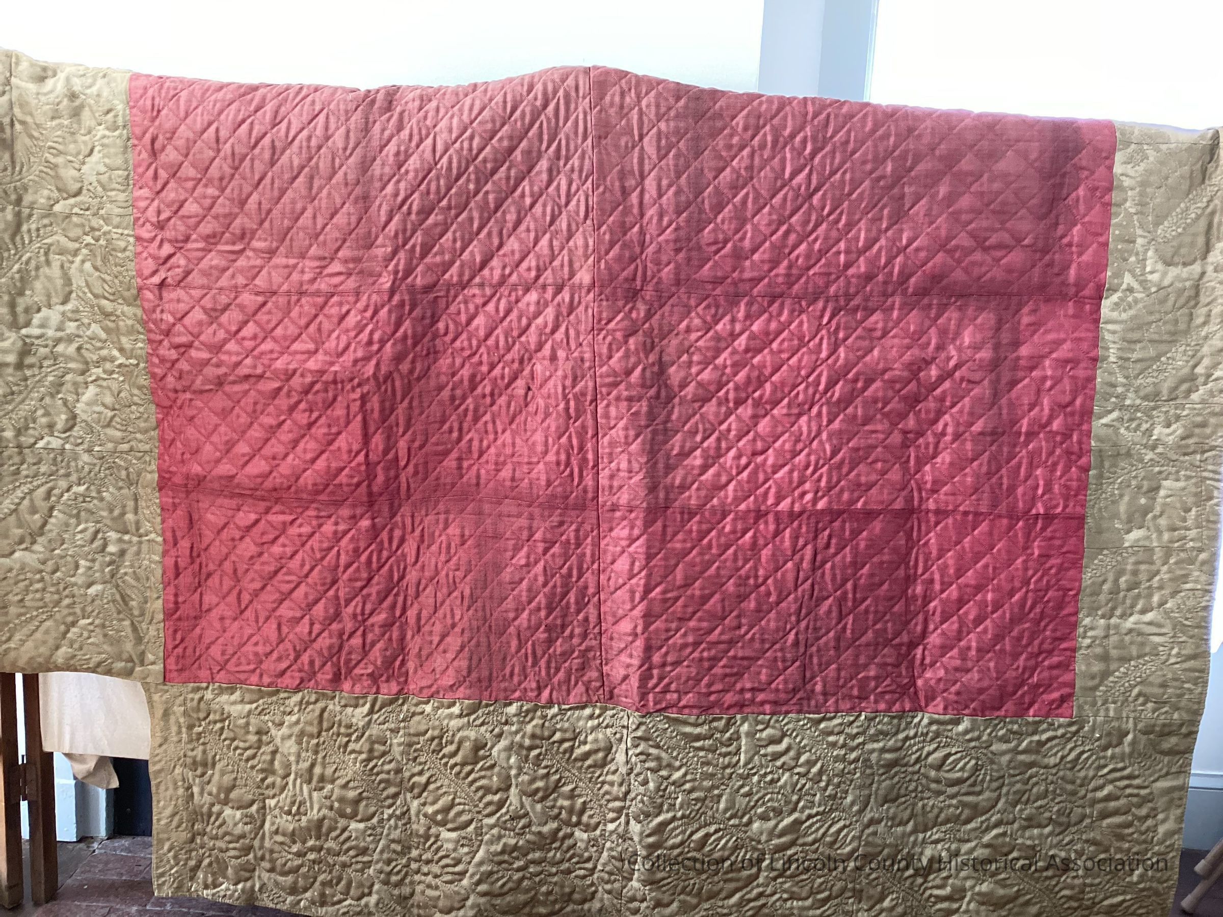 Interesting quilt of a reddish pink center which was formerly a quilted petticoat. The fabric is a polished wool, known as calamanco. The glazed surface was popular in Europe in the 18th century and early 19th century. The glaze was achieved by calendaring by surface rubbing with a stone or by applying wax to the surface. It is quilted in a diagonal diamond design in 8 sections. The 2 sides and bottom of the quilt is a border of beige calamanco fabric hand quilted around the leaf designs. The backing is blue stripped homespun and blue and butternut Linsey-Wolsey fabrics. The bottom is squared off to accommodate bed posts.Made/Created