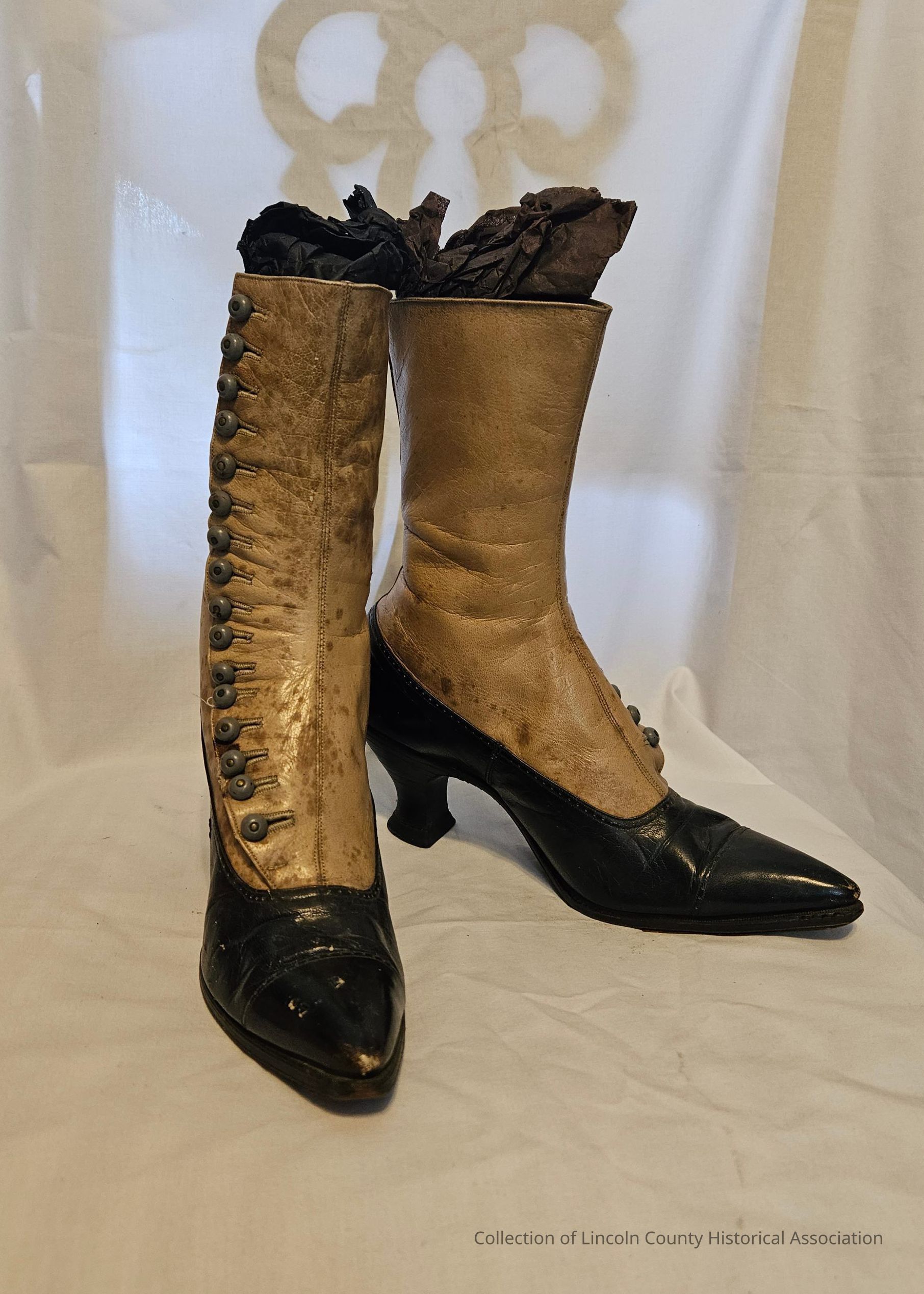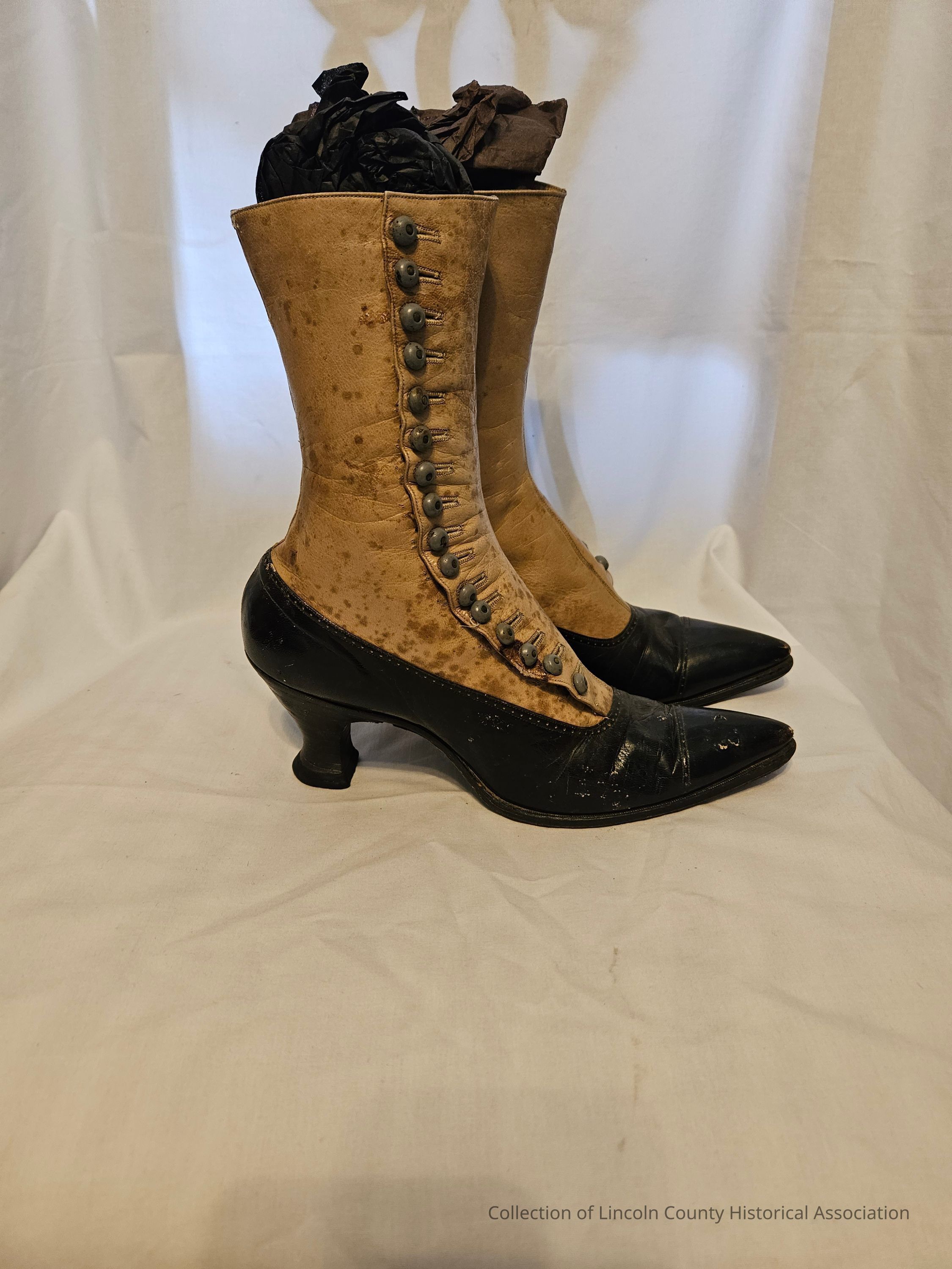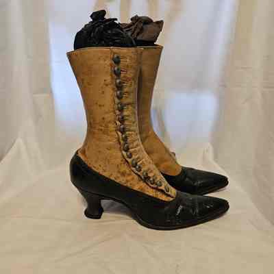 Pair of beige and black leather women's boots. Bottom section is black and upper boot section is beige. Buttons from front off center to top of boot, on the outside of the leg. Sixteen gray buttons with metal head in the center of each. Exaggerated kitten heel.