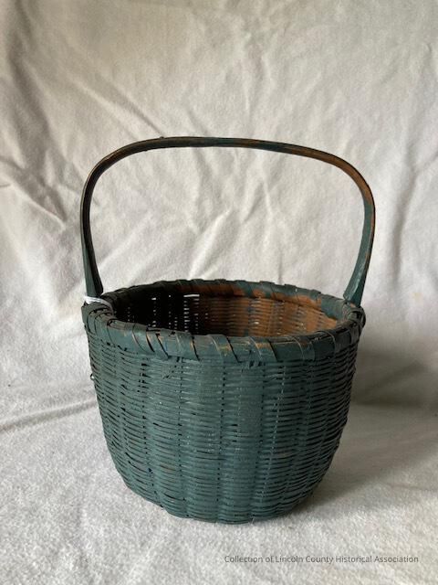 Native American Wabanaki circular berry basket with a handle. Painted or stained blue with its interior lined with orange paper.Made/Created